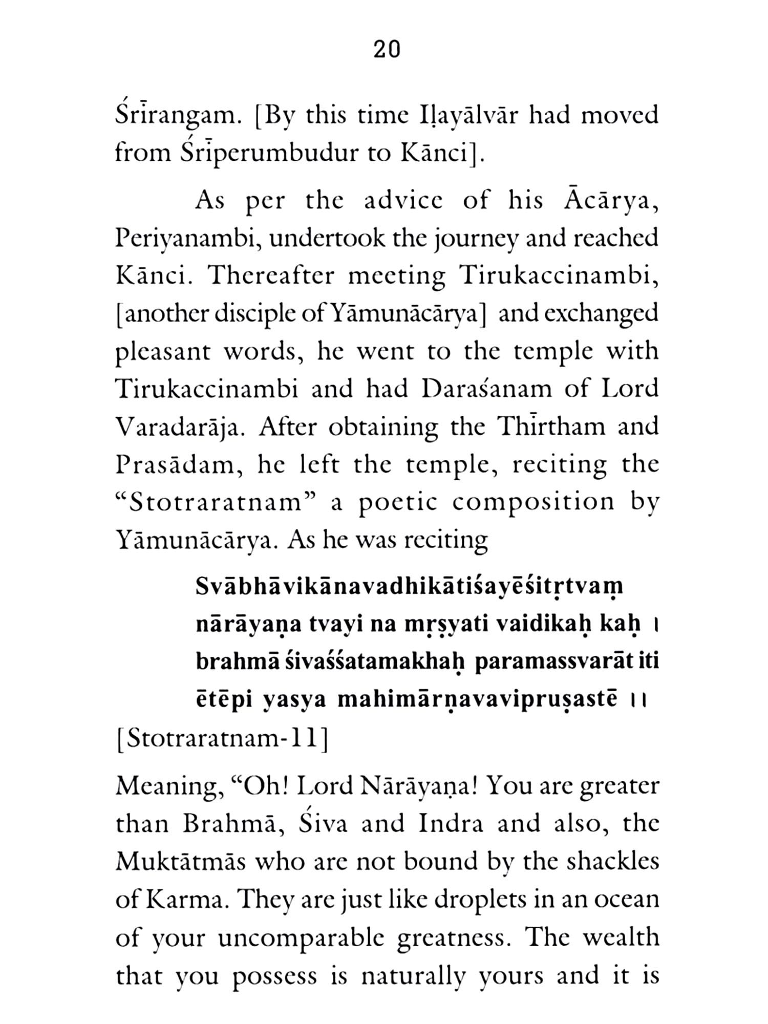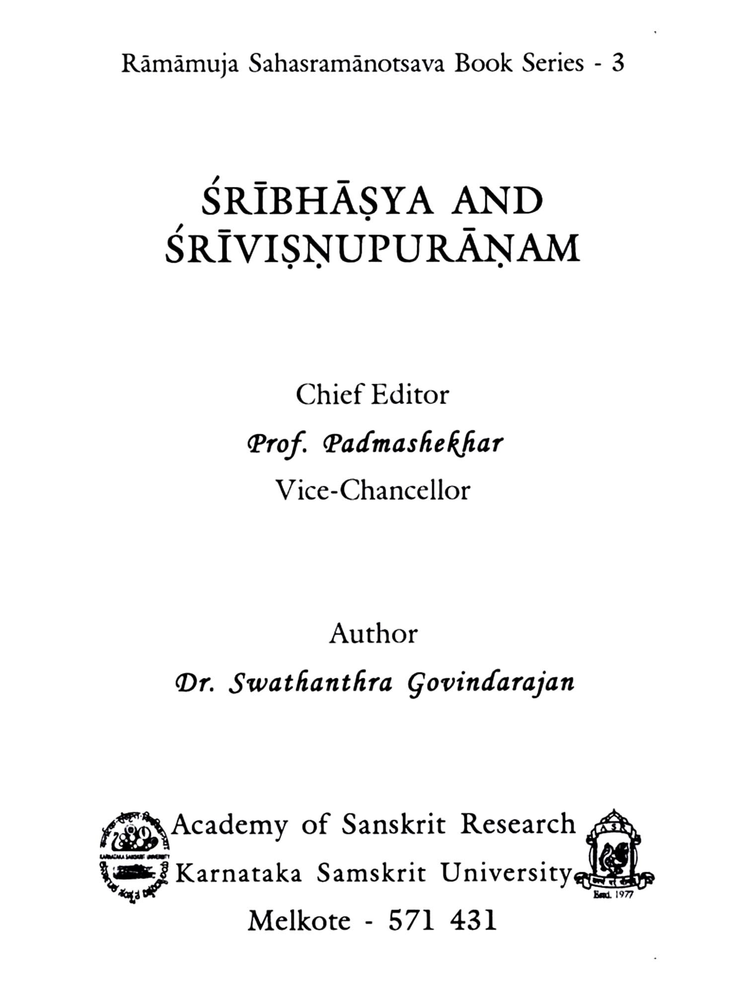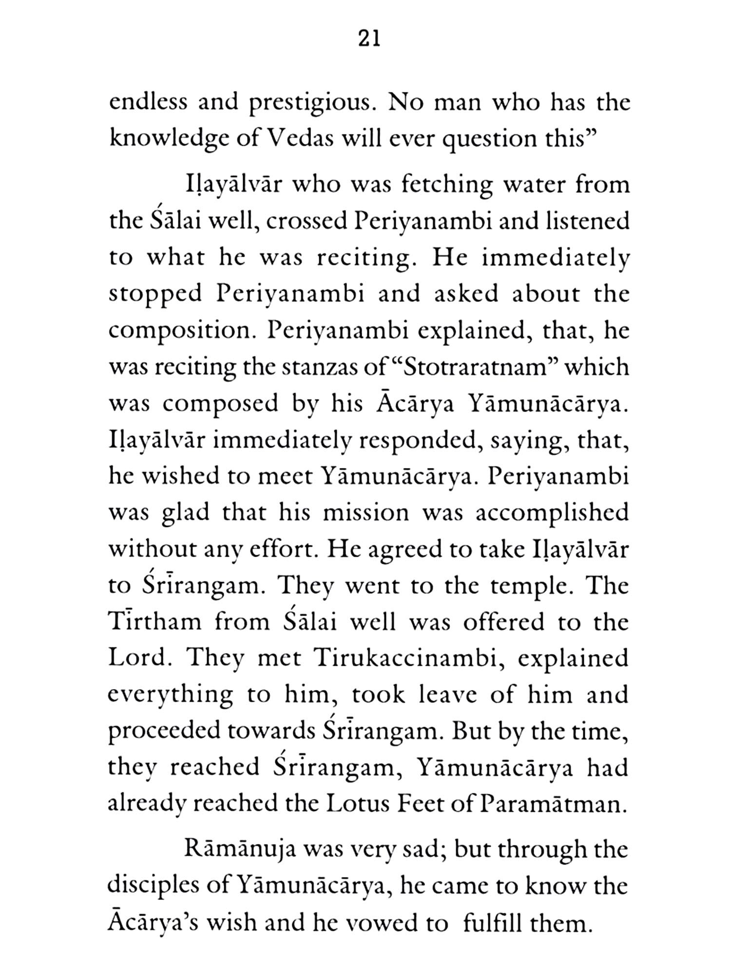 I deem it a pleasure in bringing forth this little digest produced from the lecture delivered in 'Sri Bhagavad Ramanuja Sahasramana upanyasamalika series. This has been an appreciable Endeavour jointly undertaken by Karnataka Samskrit University, Bengaluru and the Academy of Sanskrit Research, Melkote as part of Acharya's millennial celebration. As proposed, we are planning to come up with 50 books of this nature and dimension based on lectures to be deliverd in the above-said Upanyasamalika series.
