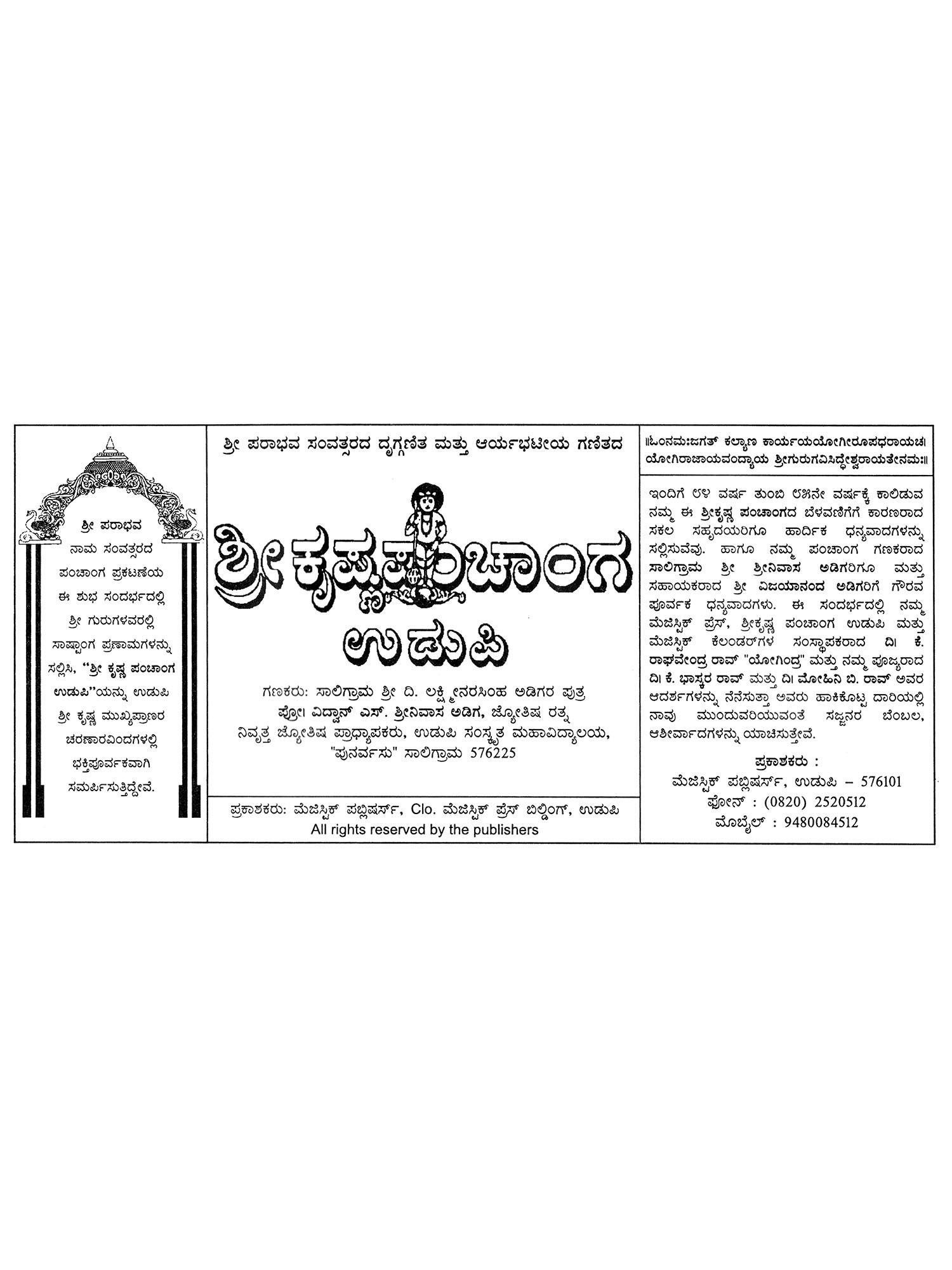 ಶ್ರೀ ಕ್ರೋಧಿ ಸಂವತ್ಸರದ ಸಿದ್ಧಾಂತ ಮತು ವಾಕ್ಯ ಪಂಚಾಂಗ: Sree Shubhakruth Samvathsarada Siddanta Mattu Vakya Panchanga 2025-26 (Kannada)