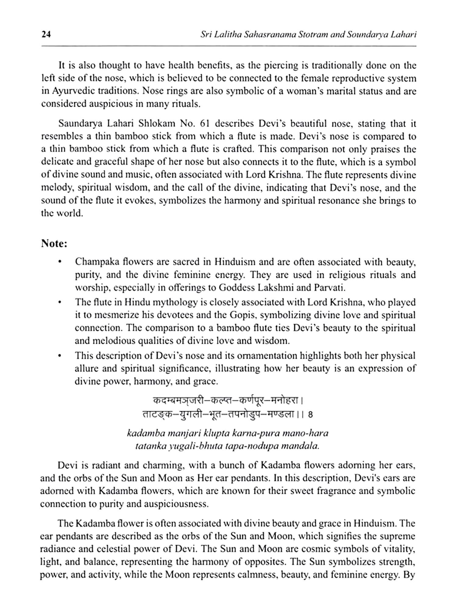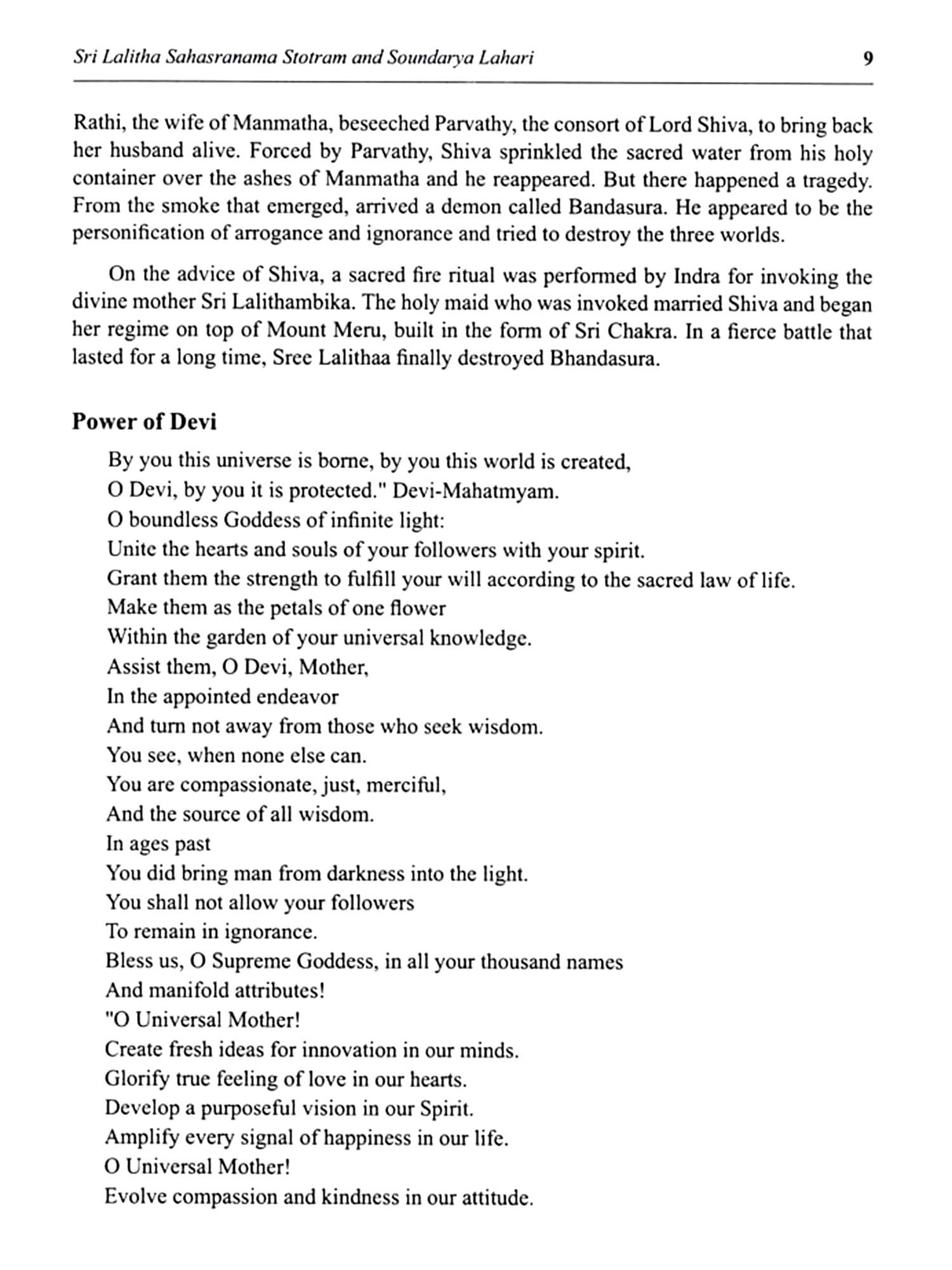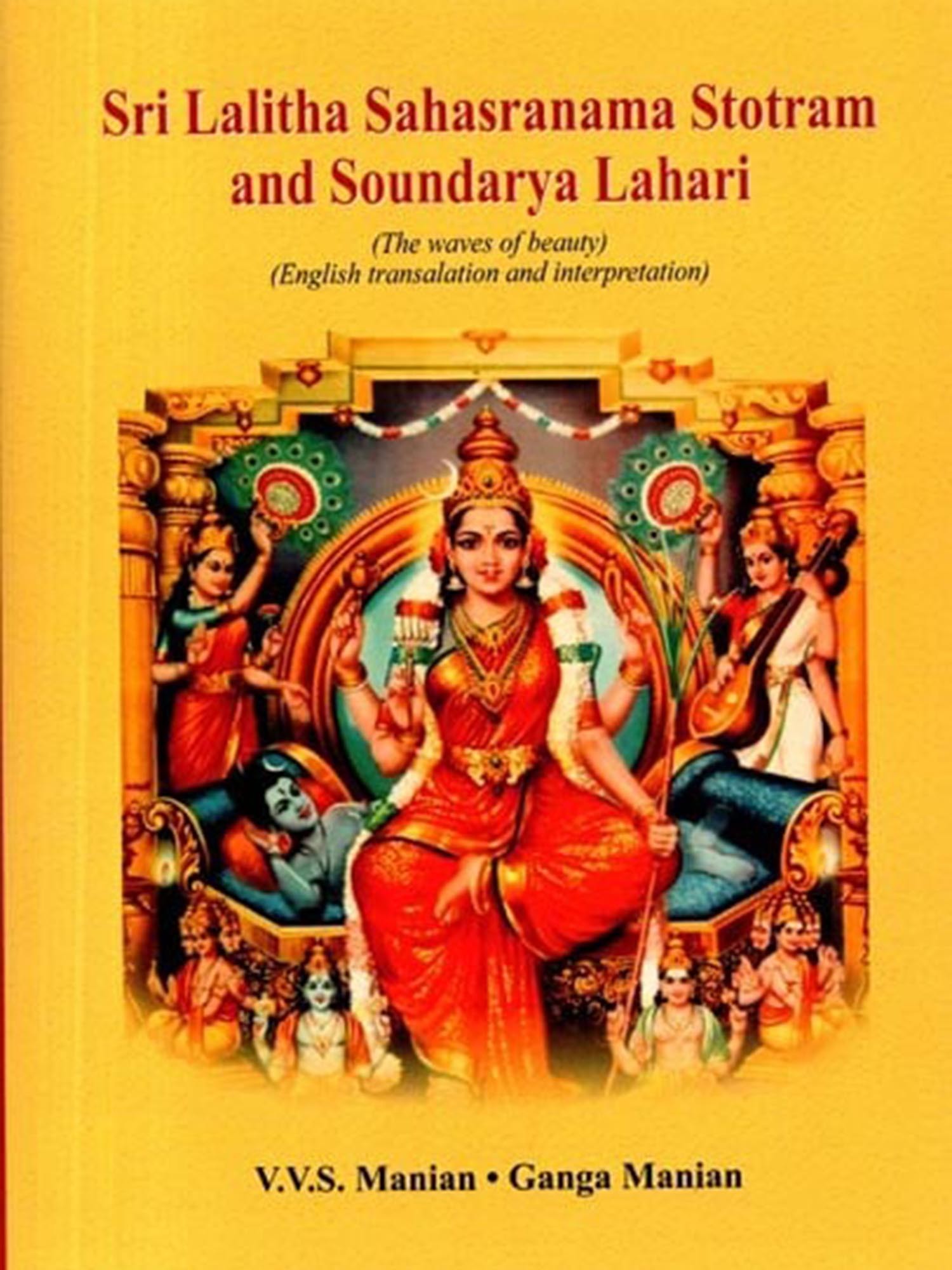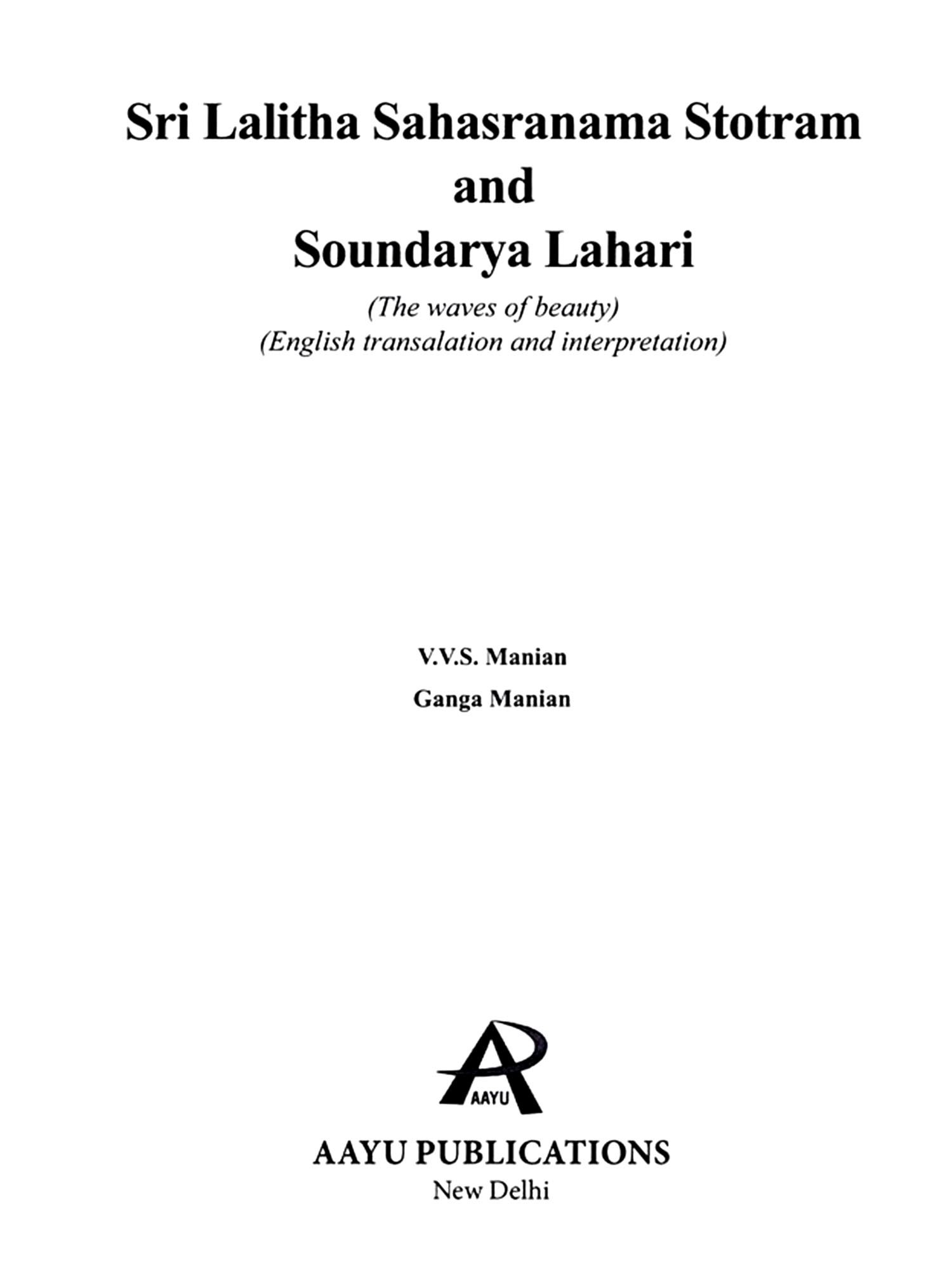 Lalitha Sahasranama Stostram and Soundarya Lahari are two of the most revered texts in Hinduism, particularly in the worship of the Divine Feminine. These sacred compositions offer profound insights into the nature of Goddess Lalitha, an embodiment of divine energy and beauty. Lalitha Sahasranama is a collection of a thousand names of Goddess Lalitha, found in the Brahmanda Purana. It is considered a powerful mantra for invoking the Goddess's blessings. Each name reveals a different aspect of her divine presence, symbolizing the cosmic forces of creation, protection, and destruction. Together, they represent the feminine energy that sustains the universe. Soundarya Lahari, attributed to the great sage Adi Shankaracharya, is a poetic masterpiece that celebrates the beauty, grace, and cosmic power of Goddess Parvathi. It combines spiritual philosophy with profound mysticism, describing the supreme reality experienced through the Goddess's divine form. The text offers a unique blend of metaphysical principles and practical meditation techniques, guiding devotees toward inner realization and spiritual union with the Divine. Together, these texts are an essential part of the spiritual journey for those seeking wisdom and those devoted to the worship of the Goddess. This book aims to make these ancient works accessible to all, presenting their teachings in a manner that is easy to assimilate and deeply transformative. Through these translations, the profound wisdom of these texts is brought to a wider audience, enabling seekers to experience the divine grace and guidance.