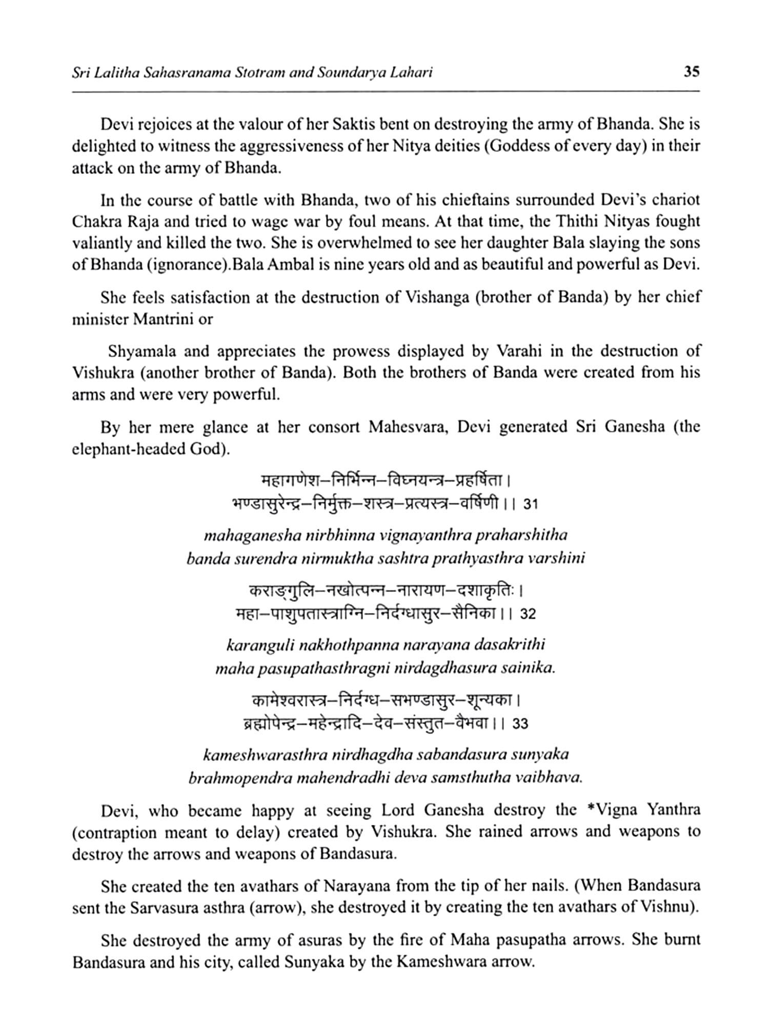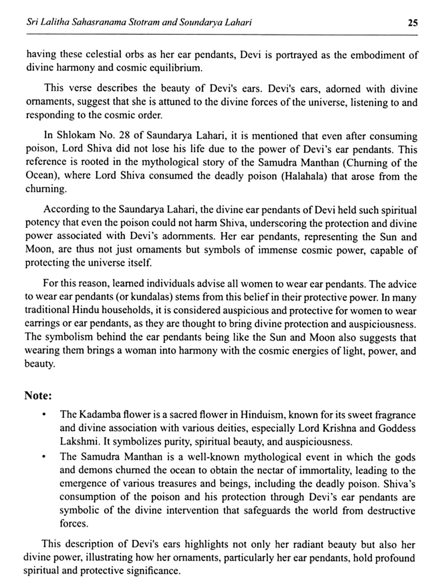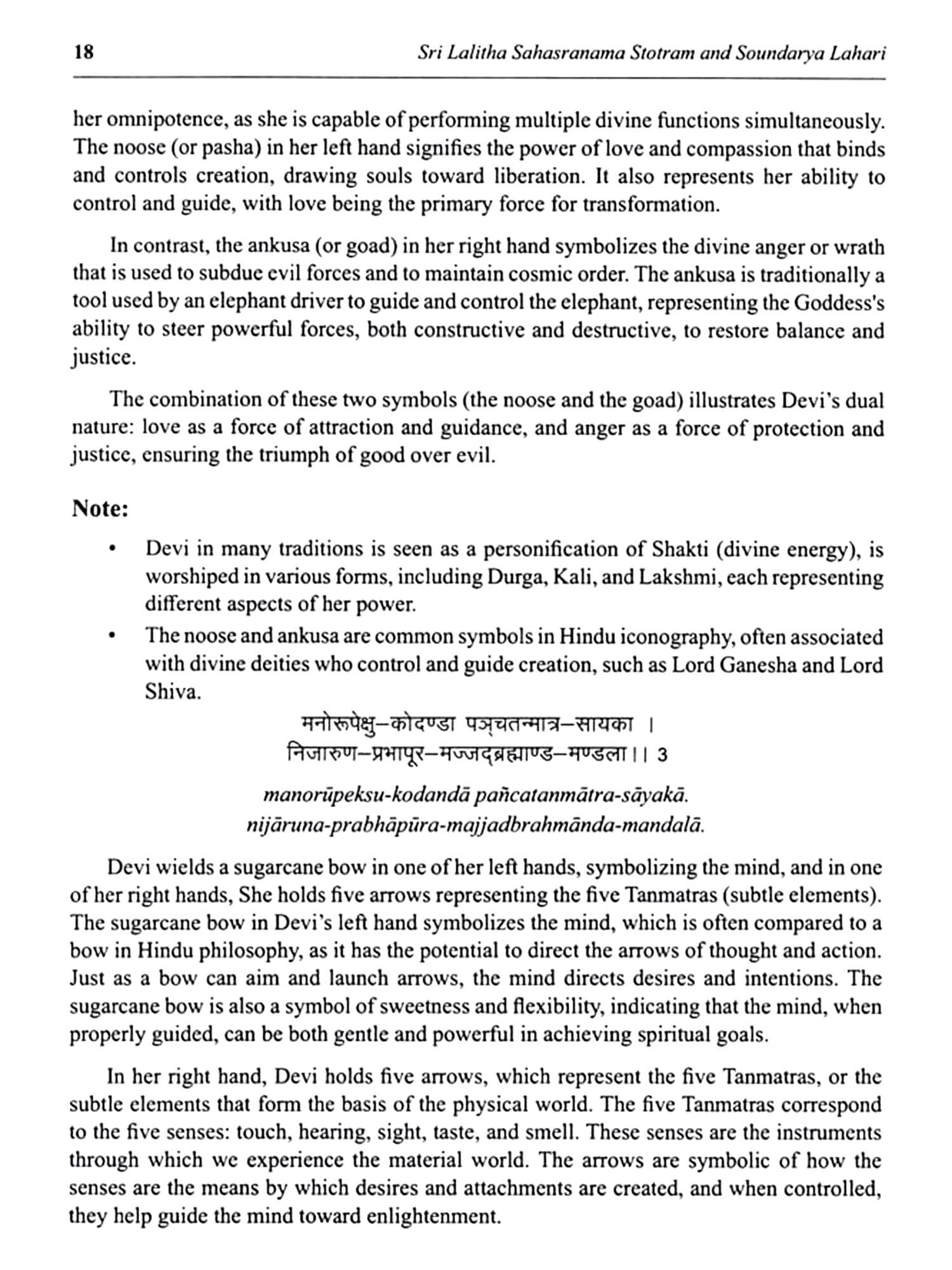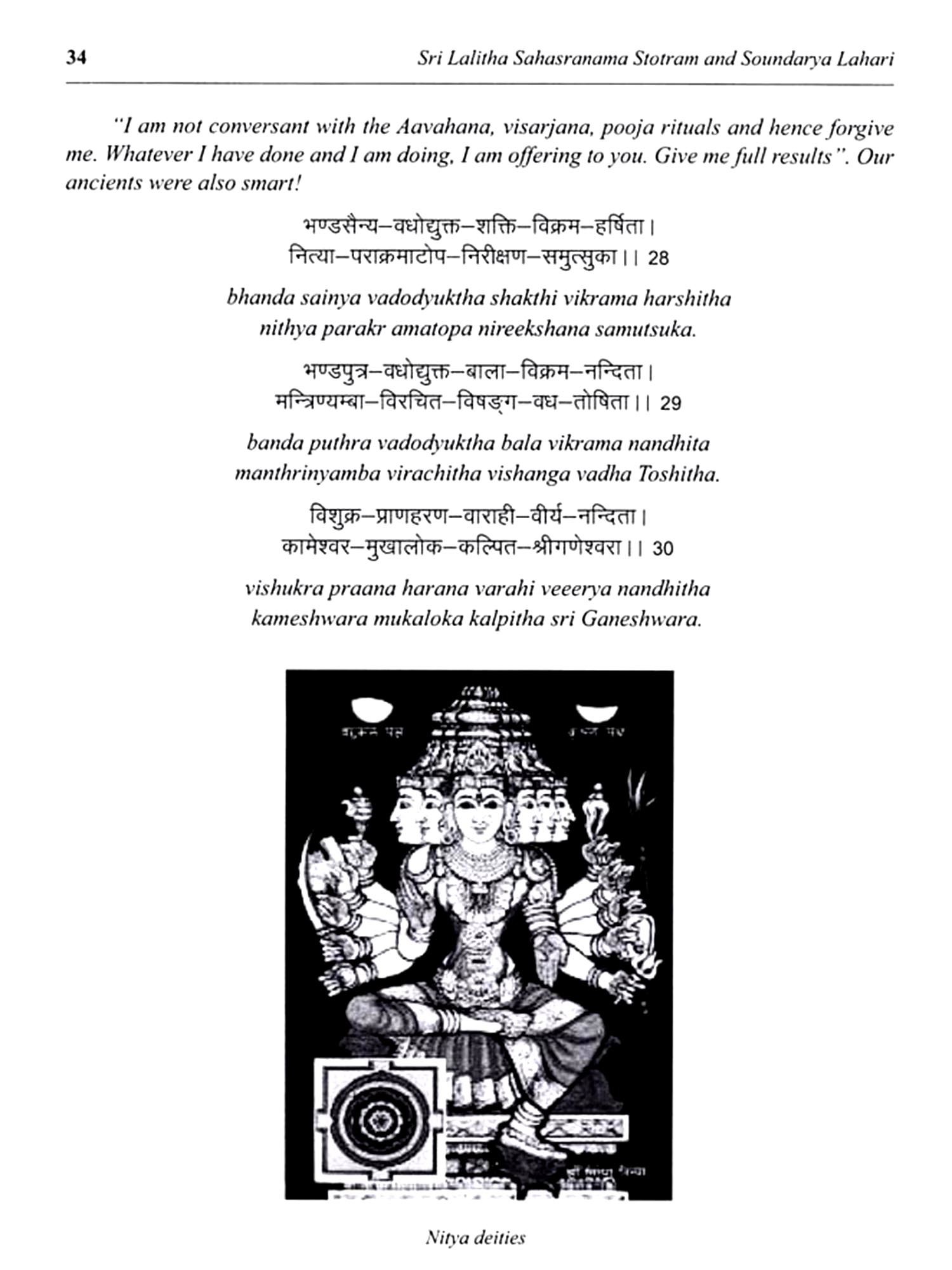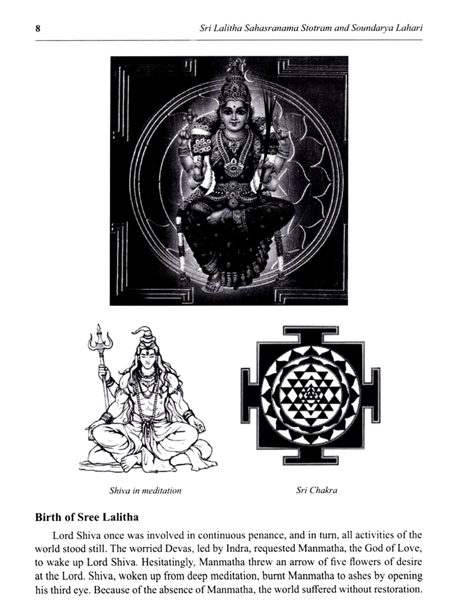 Lalitha Sahasranama Stostram and Soundarya Lahari are two of the most revered texts in Hinduism, particularly in the worship of the Divine Feminine. These sacred compositions offer profound insights into the nature of Goddess Lalitha, an embodiment of divine energy and beauty. Lalitha Sahasranama is a collection of a thousand names of Goddess Lalitha, found in the Brahmanda Purana. It is considered a powerful mantra for invoking the Goddess's blessings. Each name reveals a different aspect of her divine presence, symbolizing the cosmic forces of creation, protection, and destruction. Together, they represent the feminine energy that sustains the universe. Soundarya Lahari, attributed to the great sage Adi Shankaracharya, is a poetic masterpiece that celebrates the beauty, grace, and cosmic power of Goddess Parvathi. It combines spiritual philosophy with profound mysticism, describing the supreme reality experienced through the Goddess's divine form. The text offers a unique blend of metaphysical principles and practical meditation techniques, guiding devotees toward inner realization and spiritual union with the Divine. Together, these texts are an essential part of the spiritual journey for those seeking wisdom and those devoted to the worship of the Goddess. This book aims to make these ancient works accessible to all, presenting their teachings in a manner that is easy to assimilate and deeply transformative. Through these translations, the profound wisdom of these texts is brought to a wider audience, enabling seekers to experience the divine grace and guidance.