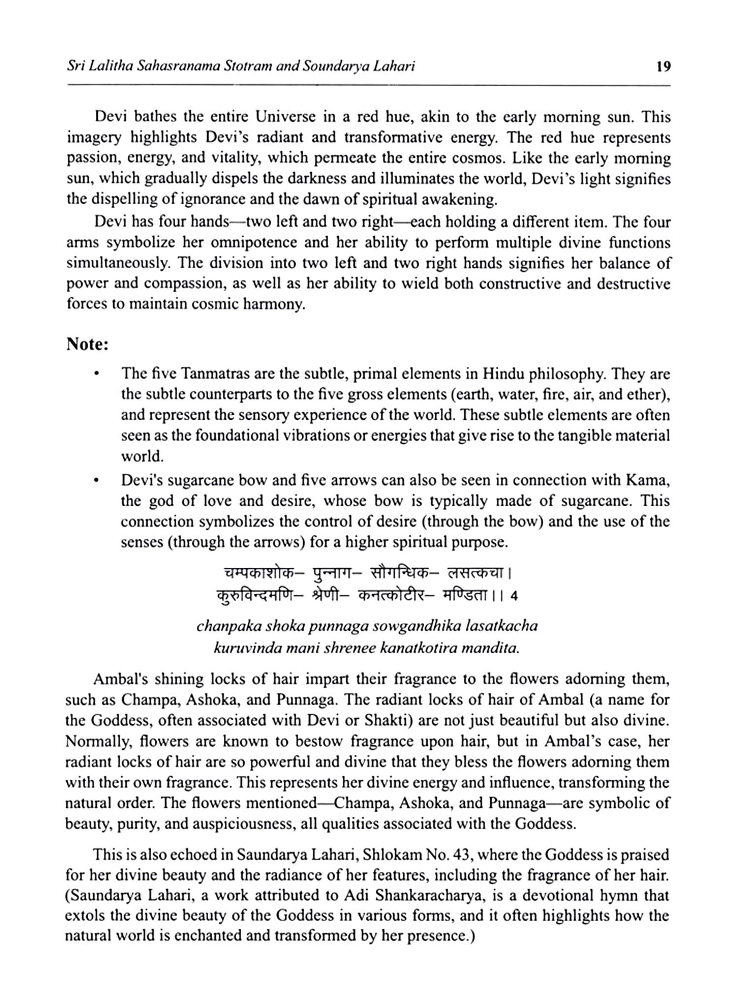The sacred texts of Hinduism are a treasure trove of divine hymns and invocations, each one a profound expression of reverence and spiritual insight. Among these timeless works, two stand as monumental celebrations of the Supreme Goddess-Lalitha Sahasranama and Soundarya Lahari. These revered scriptures, composed in intricate Sanskrit, delve deeply into the essence of the divine feminine, capturing both her boundless power and unparalleled beauty. They serve as beacons of spiritual wisdom, devotion, and cosmic harmony, offering a glimpse into the eternal dance of the Goddess and her energy that permeates all creation. In these texts, the Supreme Goddess Devi is not just an abstract force but a living, breathing presence whose grace and potency extend across the universe. Through the verses of Lalitha Sahasranama and Soundarya Lahari, we encounter the Goddess in her many forms her creative and destructive powers, her beauty that transcends both the physical and metaphysical realms, and her role as the primordial energy that sustains existence itself. Lalitha Sahasranama, often regarded as one of the most sacred scriptures, consists of a thousand names of Goddess Lalitha Tripura Sundari, an embodiment of the Divine Mother. Narrated by Lord Hayagriva to the sage Agastya and later passed on to the sage Durvasa, this text encapsulates the innumerable qualities of the Goddess, celebrating her divine attributes, her cosmic significance, and her transformative influence on the lives of her devotees. Each of the thousand names reveals a unique aspect of the Goddess, inviting practitioners into a deeper relationship with the divine and the cosmic energy that flows through all of existence. This text not only offers spiritual guidance but also acts as a conduit for liberation, drawing seekers closer to the heart of the divine feminine. Soundarya Lahari, attributed to the revered sage Adi Shankaracharya, is a masterwork of poetic devotion that weaves together the themes of beauty, divine power, and the eternal presence of the Goddess. The text is divided into 100 verses 41 of which describe the Goddess's external beauty in elegant prose (Anuvaka), while the remaining 59 delve into her metaphysical significance. The opening verses paint a vivid picture of the Goddess's radiance, grace, and allure, capturing the imagination of all who encounter her. But the Soundarya Lahari quickly elevates its focus, guiding the reader beyond mere physical attraction into the realm of the Goddess's eternal, cosmic beauty an energy that sustains and nourishes the universe. The verses of Soundarya Lahari overflow with devotion, awe, and reverence, each one a reflection of the devotee's wonder at the divine presence of the Goddess. From her every gesture to the subtlety of her silence, the text explores the Goddess as the ultimate source of both beauty and power-her influence extending from the earthly to the highest planes of spiritual consciousness. The Soundarya Lahari invites readers into a profound experience of connection with the Goddess, transcending the limitations of the material world and guiding them to the very core of divine wisdom. This book offers an accessible and in-depth exploration of both the Lalitha Sahasranama and Soundarya Lahari, providing a unique perspective on the divine feminine and her cosmic role. Through the study of these ancient texts, we are invited to experience the divine energy that sustains all of creation and to deepen our understanding of the eternal beauty and power of the Goddess.