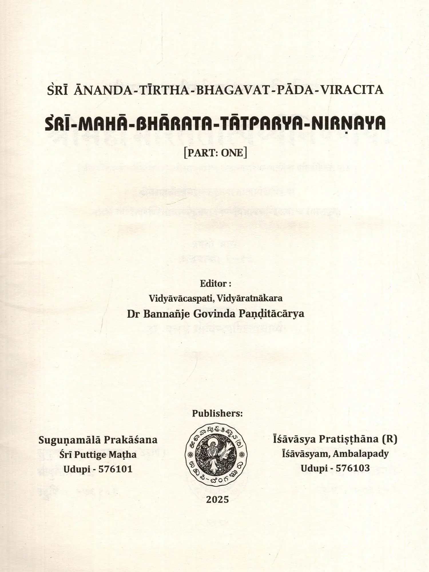 श्रीमहाभारततात्पर्य्यनिर्णयः- Sri-Maha-Bharata-Tatparya-Nirnaya: Sri Ananda-Tirtha-Bhagavat-Pada-Viracita (Set of 2 Volumes)