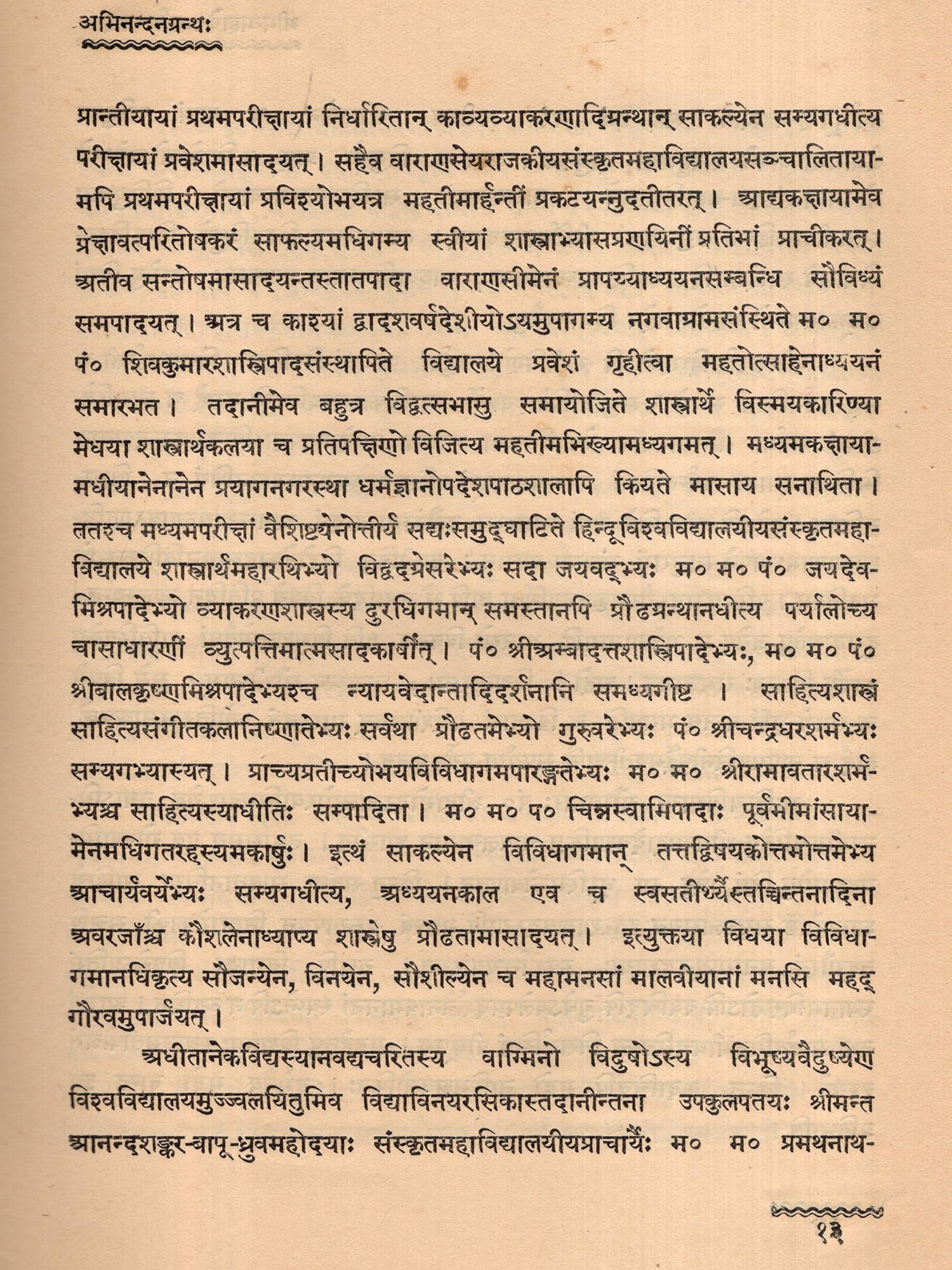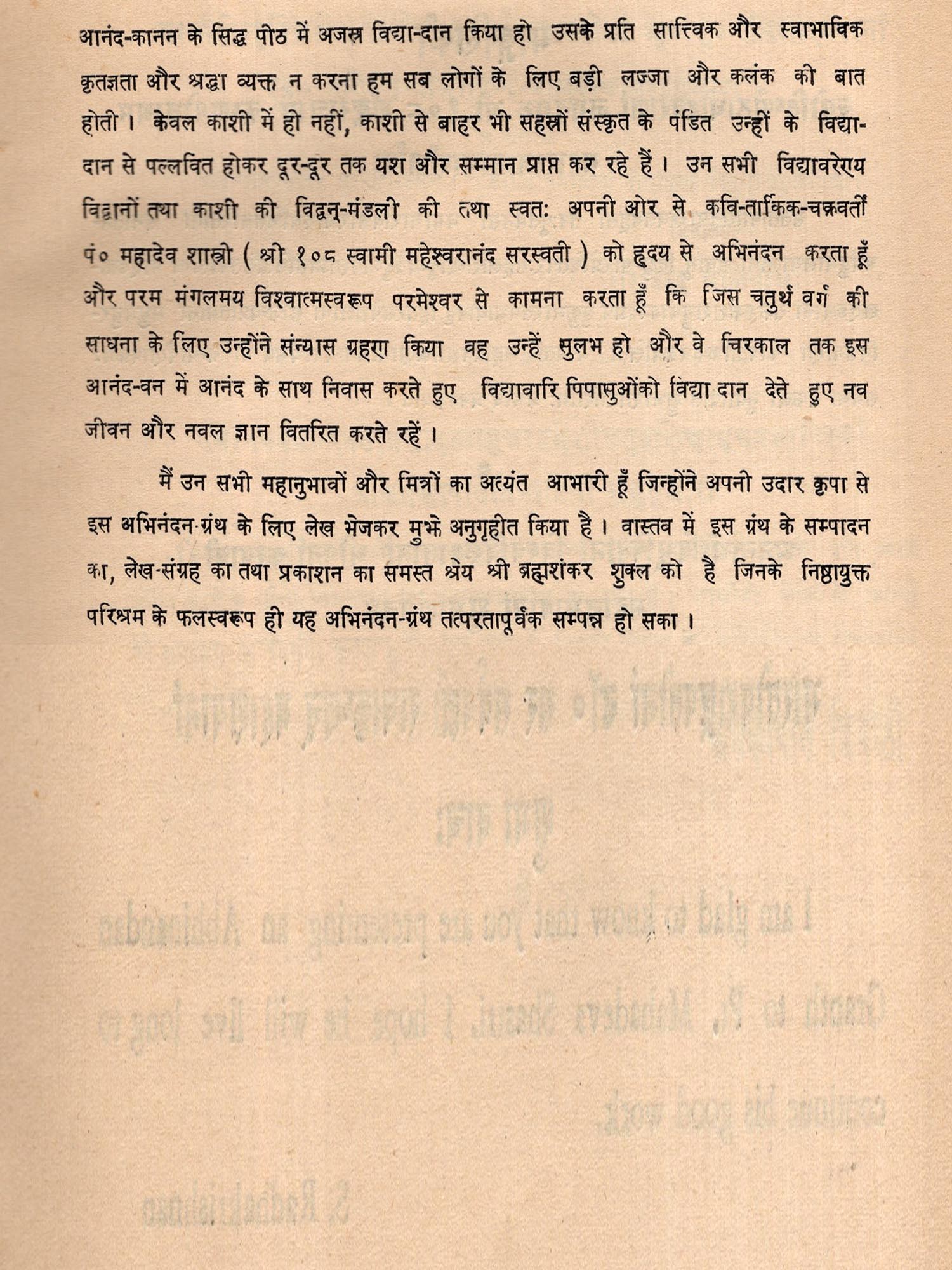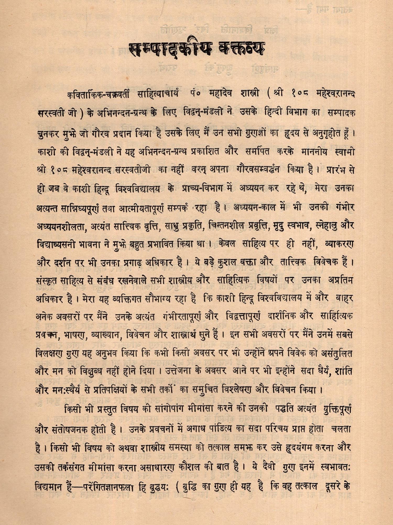 कविताकिक-चक्रवर्ती साहित्याचार्य पं० महादेव शास्त्री (श्री १०८ महेश्वरानन्द सरस्वती जो) के अभिनन्दन-ग्रन्य के लिए विद्वन्-मंडली ने उसके हिन्दी विभाग का सम्पादक चुनकर मुझे जो गौरव प्रदान किया है उसके लिए मैं उन सभी गुणज्ञों का हृदय से अनुगृहीत हूँ। काशी की विद्वन्-मंडली ने यह अभिनन्दन-ग्रन्थ प्रकाशित और सपित करके माननीय स्वामो श्री १०८ महेश्वरानन्द सरस्वतीजी का नहीं वरन् अपना गौरवसम्वर्द्धन किया है। प्रारंभ से ही जब वे काशी हिन्दू विश्वविद्यालय के प्राच्य-विभाग में अध्ययन कर रहे थे, मेरा उनका अत्यन्त सान्निध्यपूर्ण तया आत्मीयतापूर्ण सम्पर्क रहा है। अध्ययन काल में भी उनकी गंभीर अध्ययनशीलता, अत्यंत सात्त्विक वृत्ति, साधु प्रकृति, चिन्तनशील प्रवृत्ति, मृदु स्वभाव, स्नेहालु और विद्याध्यसनी भावना ने मुझे बहुत प्रभावित किया था। केवल साहित्य पर ही नहीं, व्याकरण और दर्शन पर भी उनका प्रगाढ़ अधिकार है। ये बड़े कुशल वक्ता और तात्त्विक विवेचक हैं। संस्कृत साहित्य से संबंध रखनेवाले सभी शास्त्रीय और साहित्यिक विषयों पर उनका अप्रतिम अविंकार है। मेरा यह व्यक्तिगत सौभाग्य रहा है कि काशी हिन्दू विश्वविद्यालय में और बाहर अनेक अवसरों पर मैंने उनके अत्यंत गंभीरतापूर्ण और विद्वत्तापूर्ण दार्शनिक और साहित्यिक प्रवचन, भाषण, व्याख्यान, विवेचन और शास्त्रार्थ सुने हैं। इन सभी अवसरों पर मैंने उनमें सबसे विलक्षण गुण यह अनुभव किया कि कभी किसी अवसर पर भी उन्होंने अपने विवेक को असंतुलित और मन को विद्युब्ध नहीं होने दिया। उत्तेजना के अवसर आने पर भी इन्होंने सदा धैर्य, शांति और मनःस्थैर्य से प्रतिपक्षियों के सभी तर्कों का समुचित विश्लेषण और विवेचन किया ।