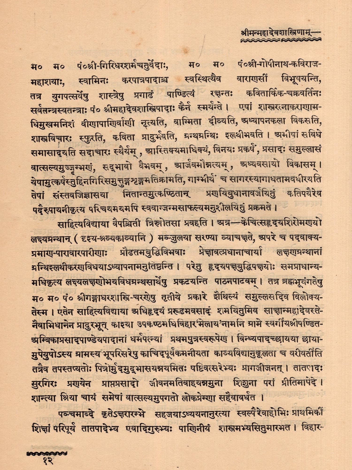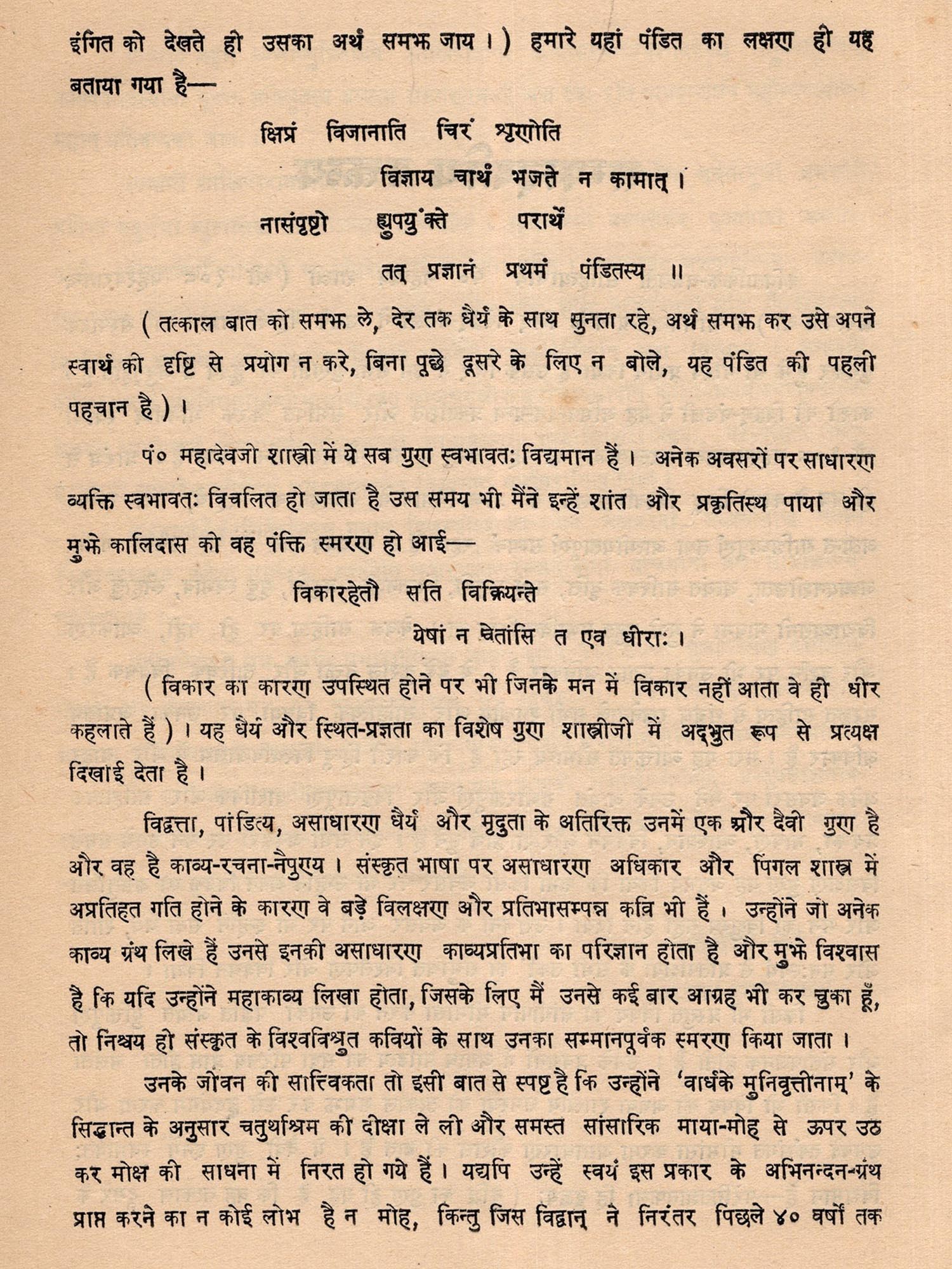 पं० महादेवजी शास्त्री में ये सब गुण स्वभावतः विद्यमान हैं। अनेक अवसरों पर साधारण व्यक्ति स्वभावतः विचलित हो जाता है उस समय भी मैंने इन्हें शांत और प्रकृतिस्थ पाया और मुझे कालिदास को वह पंक्ति स्मरण हो आई-