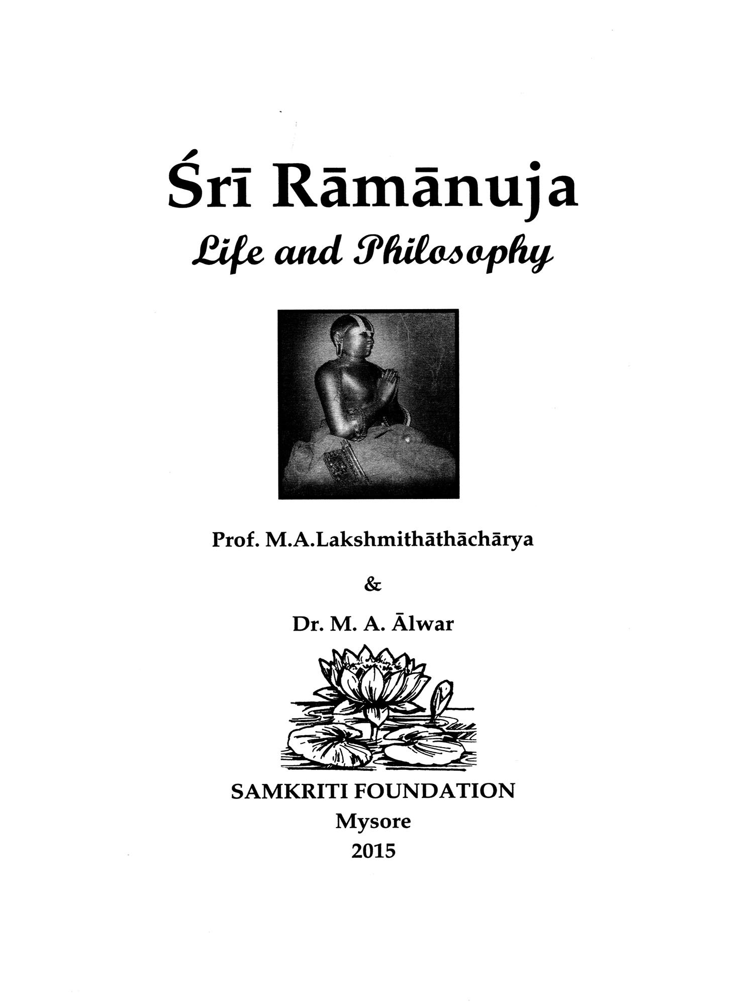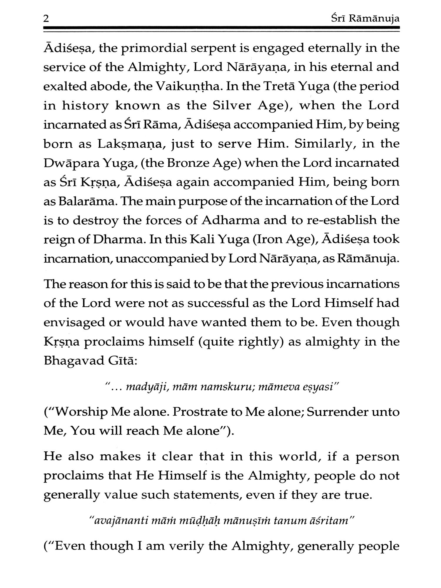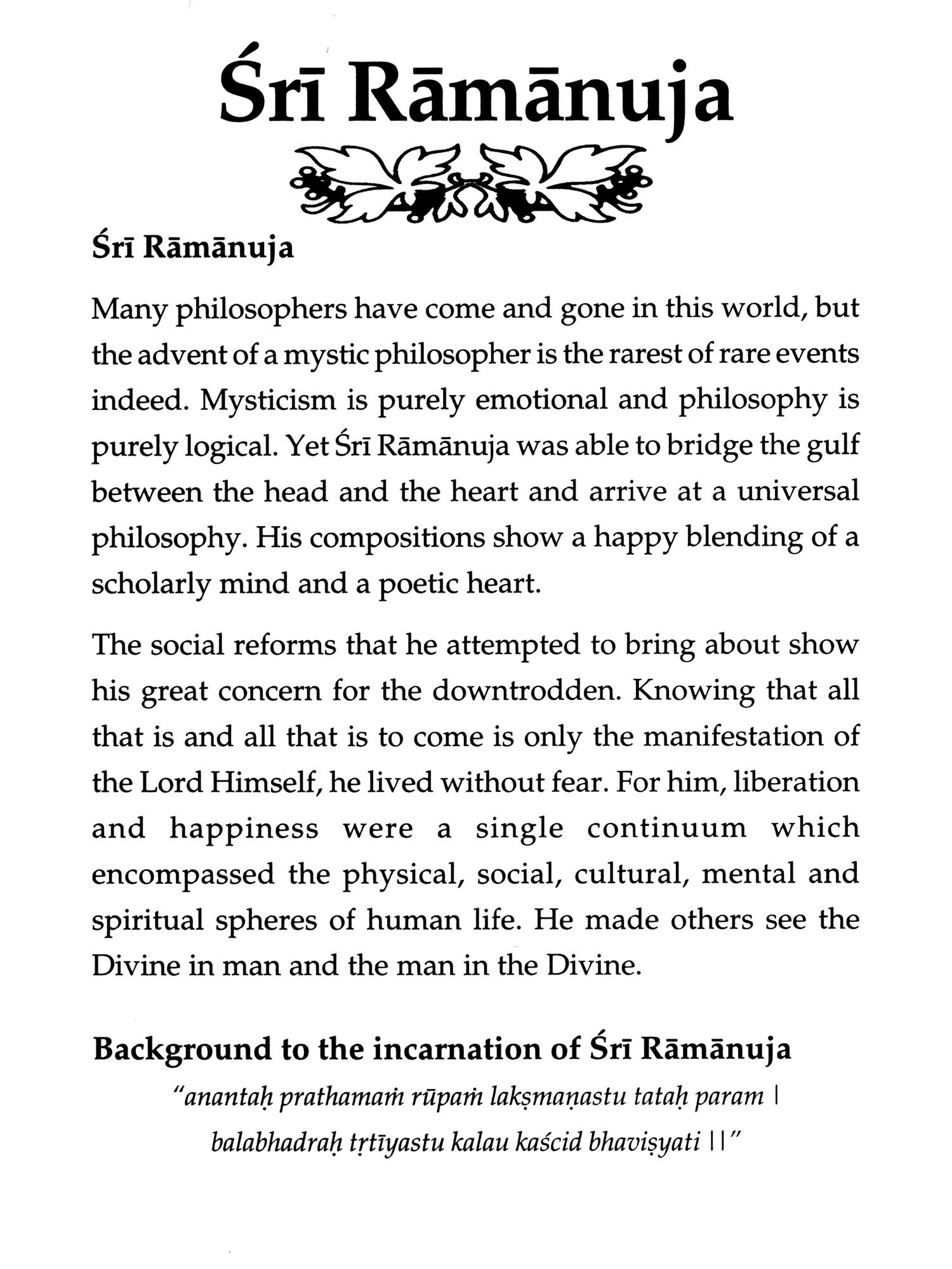 When I first embarked upon writing a life history of the divine personality of Ramanuja, I knew that there were already quite a number of books on this topic, written by great stalwarts in the field. So I asked myself the question: ‘Should I really write a separate book on this topic? Might another book not be redundant? I was familiar with three other works in particular. The first was the one by Sri Alkondavilli Govindacharya published in the I920s and republished recently. The second one was published by the Ramakrishna Order, written by one of its members Sri Ramakrishnananda, originally from Bengal. Another text was by a Sri Naimisharanya Das belonging to the ISKCON tradition. Each hook, I felt, had its own uniqueness, but I felt that none of them provided the general overview of Ramanuja's life and philosophy which I felt was missing. The aims of this new hook were to give a totally authentic account of the life of Ramanuja in simple and lucid English language while also illustrating some of the unique aspects of the distinctive system of philosophy he propagated. In many places in this text, details about how Ramanuja practiced and demonstrated the philosophy he himself preached have been recounted. How far I have succeeded in these aims is for the readers and critics to judge.