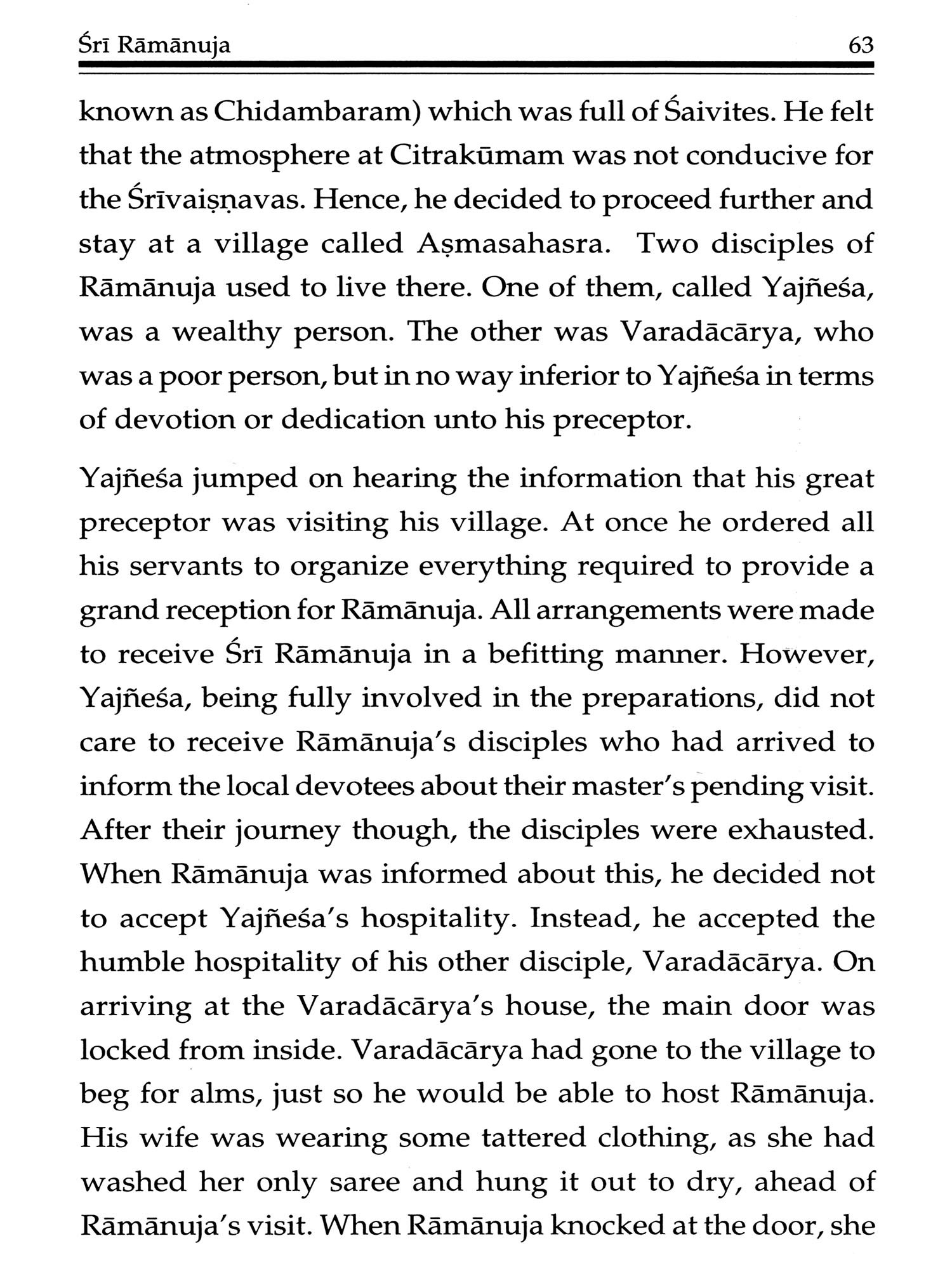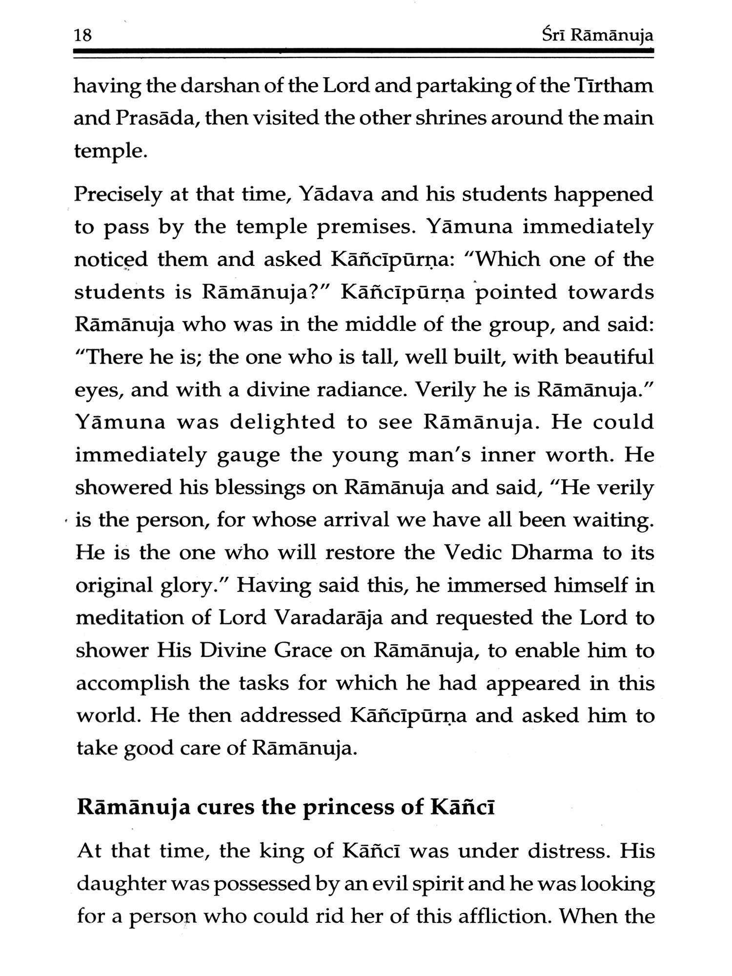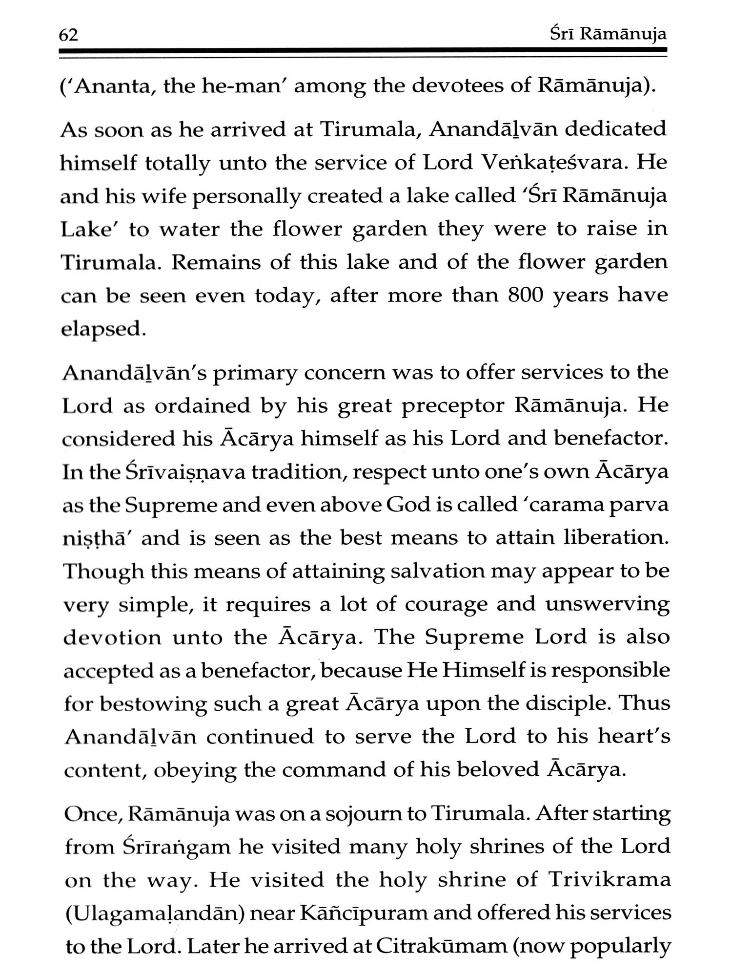 When I first embarked upon writing a life history of the divine personality of Ramanuja, I knew that there were already quite a number of books on this topic, written by great stalwarts in the field. So I asked myself the question: ‘Should I really write a separate book on this topic? Might another book not be redundant? I was familiar with three other works in particular. The first was the one by Sri Alkondavilli Govindacharya published in the I920s and republished recently. The second one was published by the Ramakrishna Order, written by one of its members Sri Ramakrishnananda, originally from Bengal. Another text was by a Sri Naimisharanya Das belonging to the ISKCON tradition. Each hook, I felt, had its own uniqueness, but I felt that none of them provided the general overview of Ramanuja's life and philosophy which I felt was missing. The aims of this new hook were to give a totally authentic account of the life of Ramanuja in simple and lucid English language while also illustrating some of the unique aspects of the distinctive system of philosophy he propagated. In many places in this text, details about how Ramanuja practiced and demonstrated the philosophy he himself preached have been recounted. How far I have succeeded in these aims is for the readers and critics to judge.