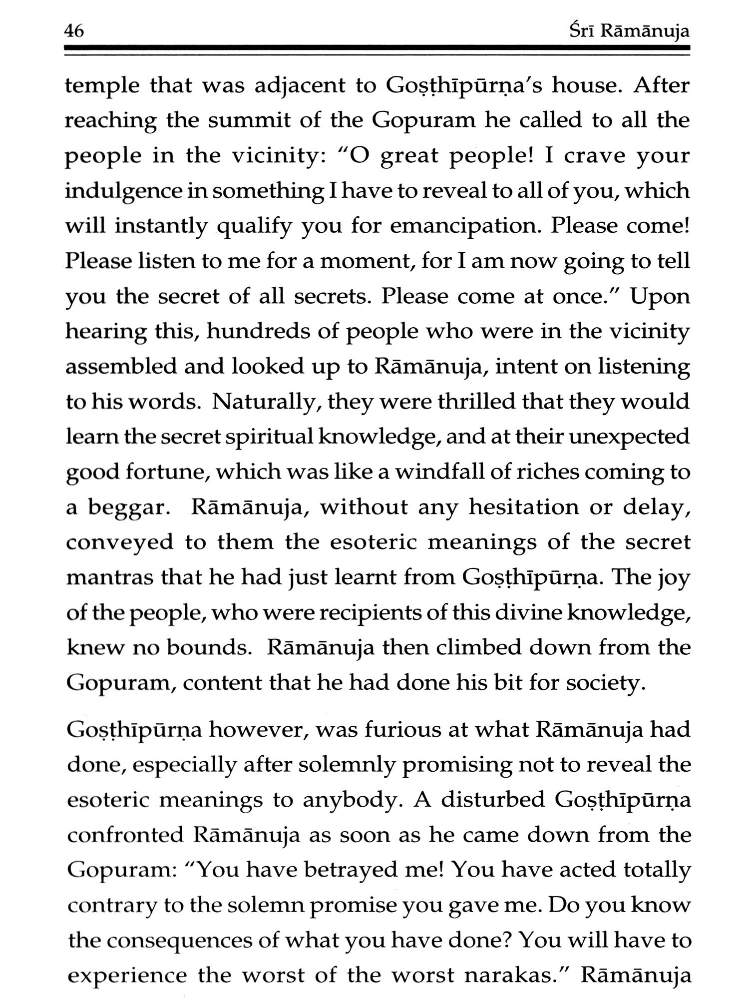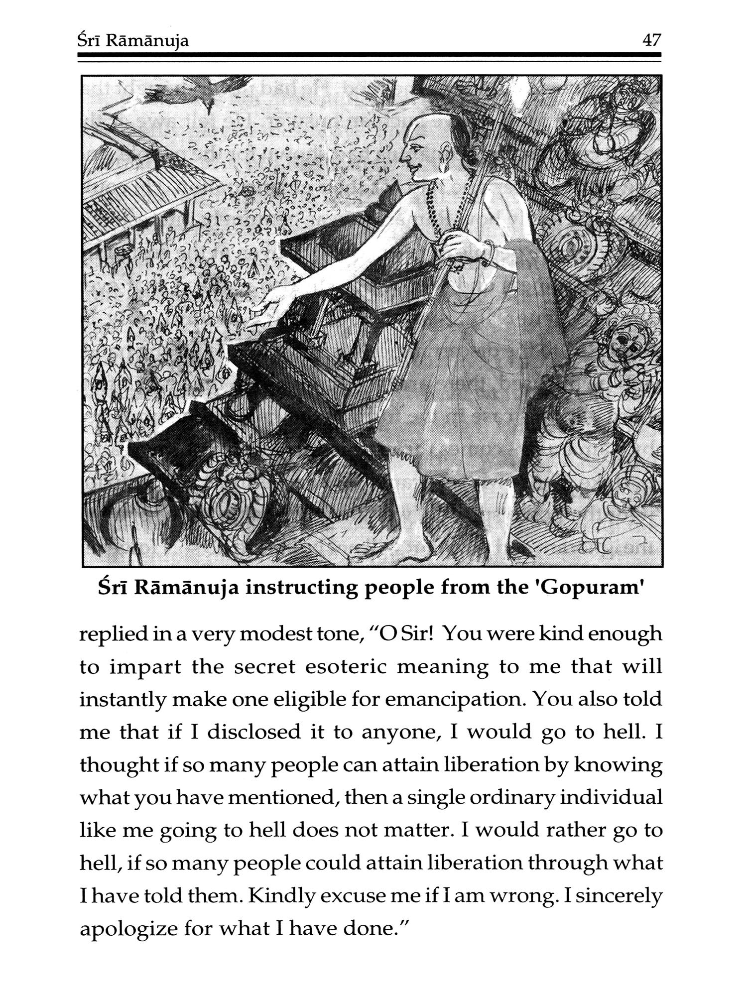 Ramanuja answered, "l am sure to be condemned to go to hell, since I have transgressed the vow that I had given to my Acharya, but l could not resist the temptation to divulge this to those people when I saw the sufferings of the frail human beings who were caught in the net of transmigration. Since these suffering human beings, who have received these teachings, are sure to get liberation, I am prepared even to go to hell. Should not one sacrifice his spiritual benefits for the spiritual well being of hundreds of people?"