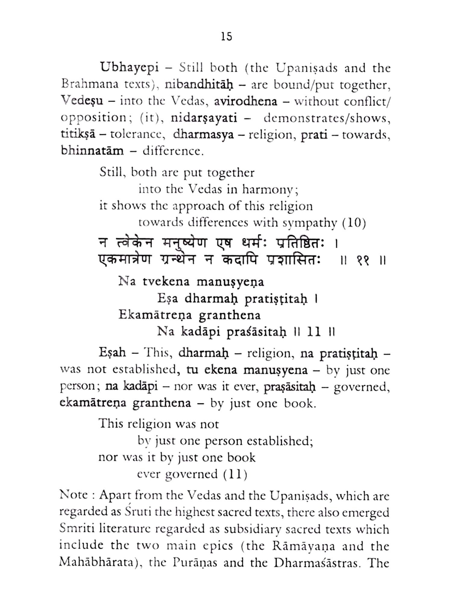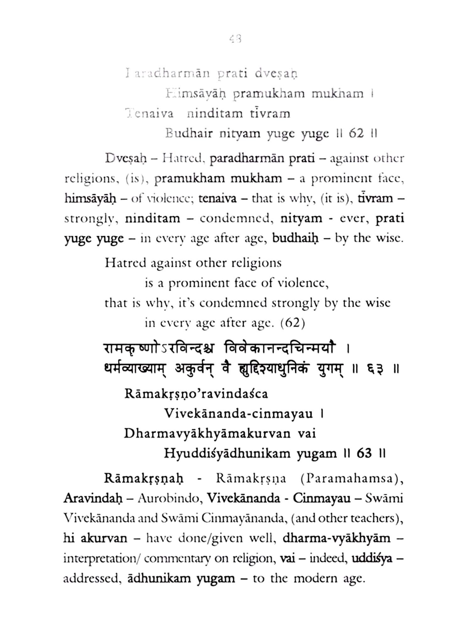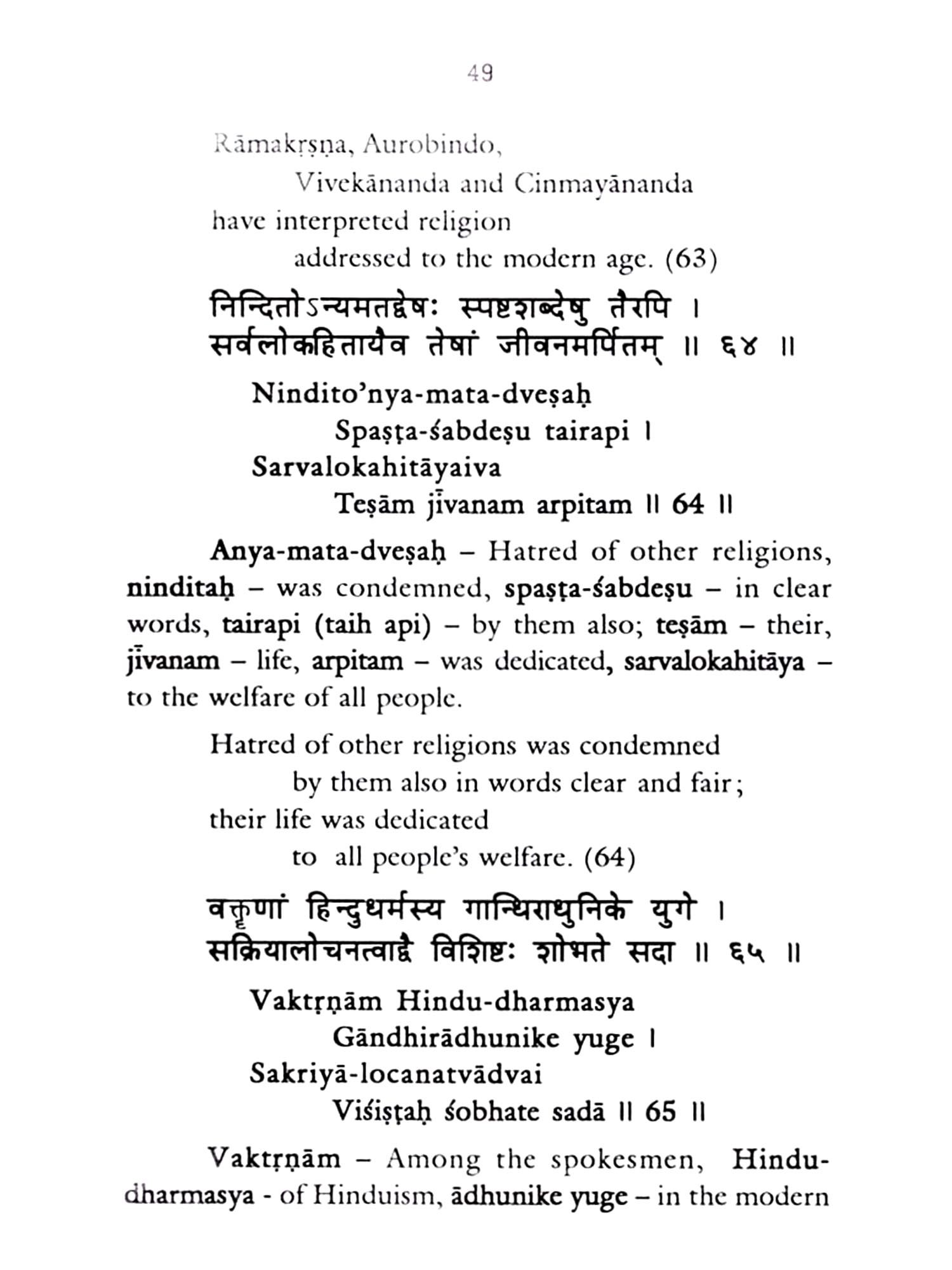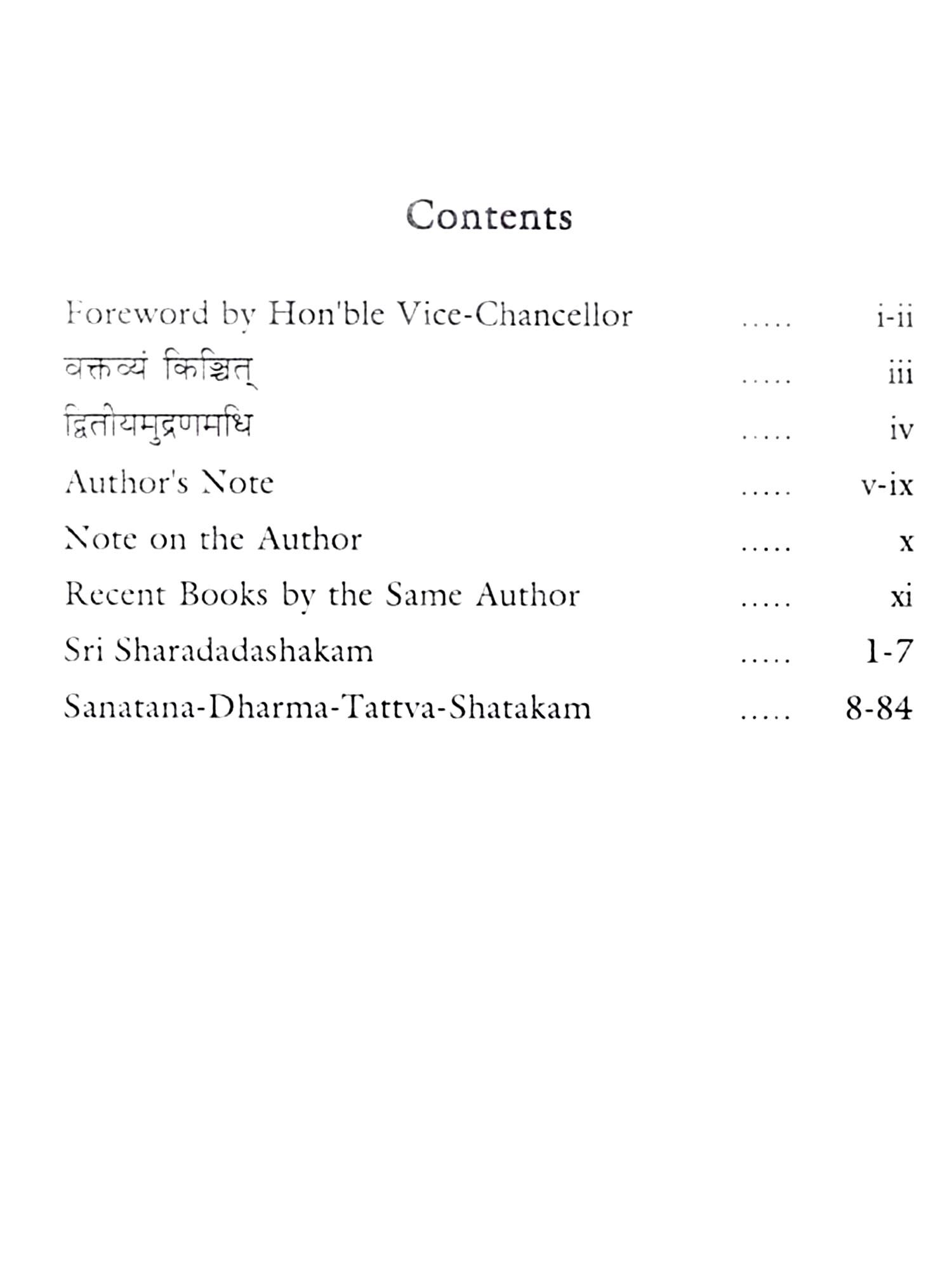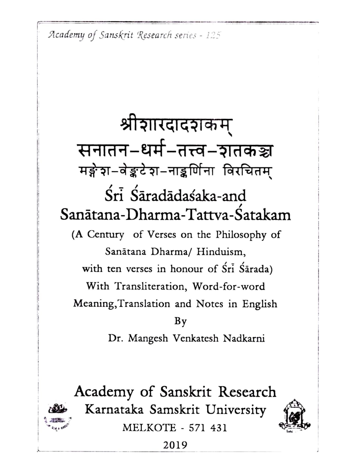 The present author Prof. M.V. Nadkarni having been inspired by such great works of yore and with a great inclination to Gandhain values, has produced a notable work 'Sanatana-dharma-tattva-shatakam'. As is the trait of a creative mind, he has aptly expressed the eternal values of an eternal religion with a strong advice to wipe out prevailing social discrimination. The translation and free rendition of the purport of his Sanskrit verses in English duly add value to the reading of a commoner.