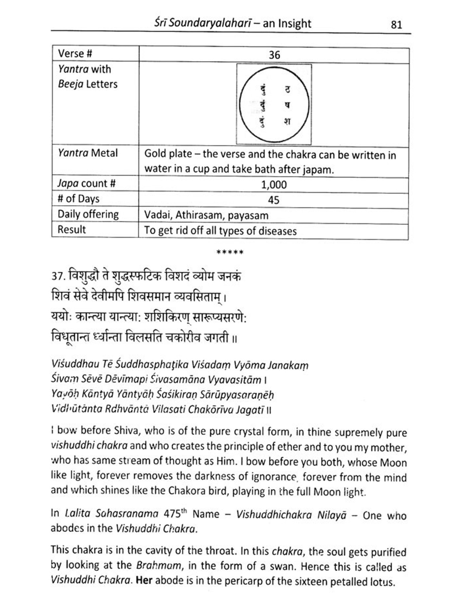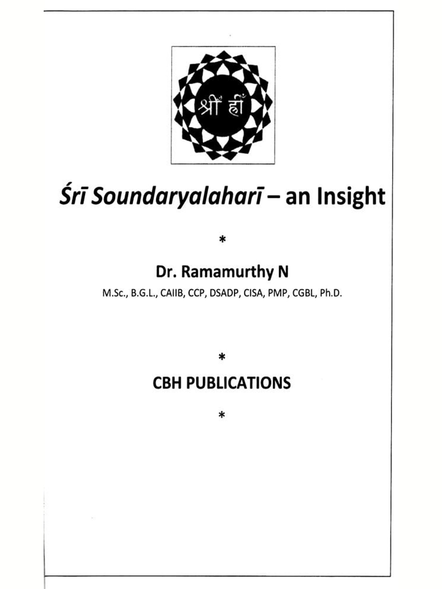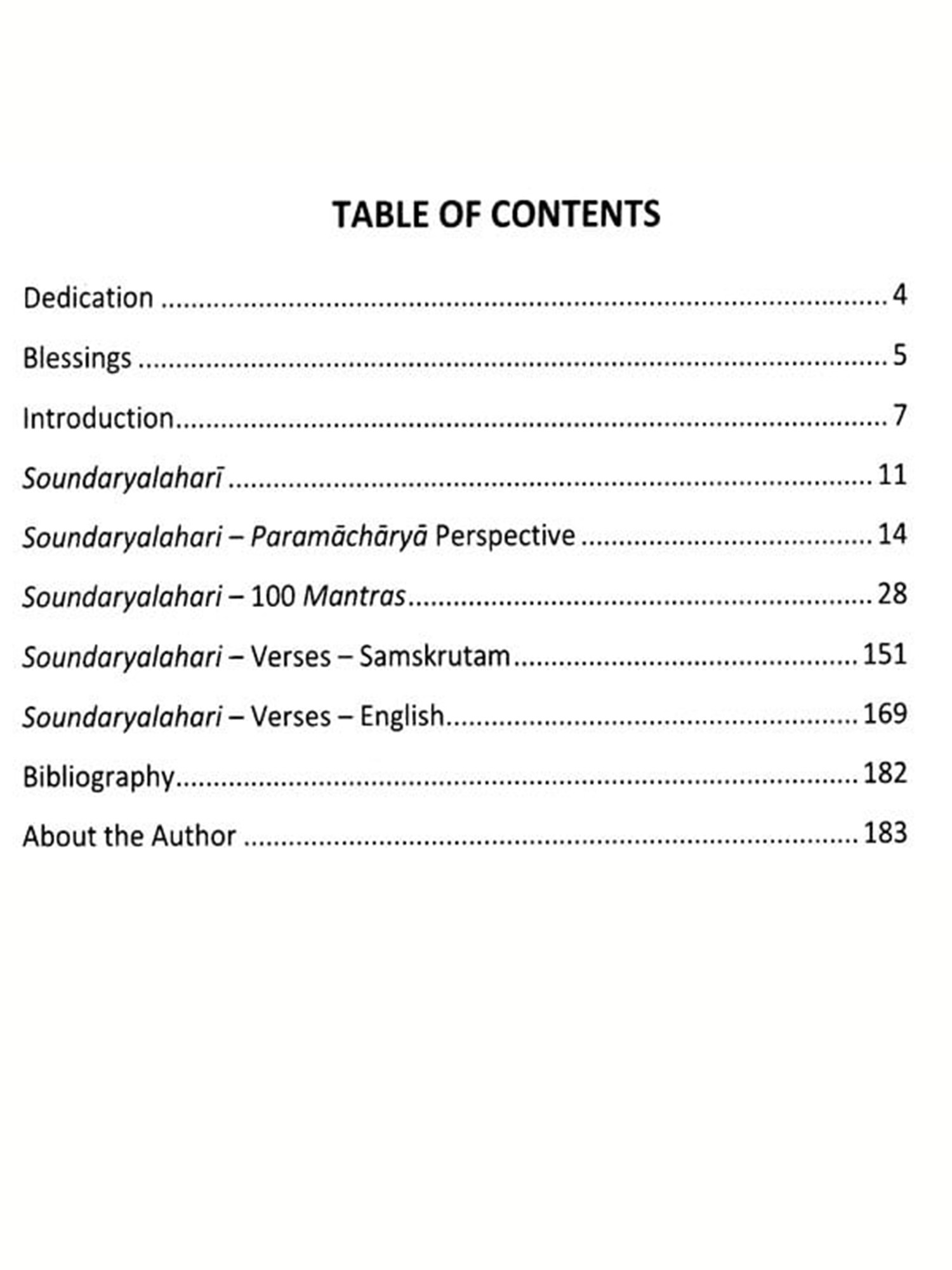 The Soundarya Lahari is not only a poetic text. It is a tantra text, giving instructions on Puja and offerings, many Yantras, one to each shloka; describing the tantra techniques of performing devotion connected to each specific shloka and details, the results ensuing therefrom. There are many interpretations and commentaries but best of these are arguably those that provide word to word translations, as also the Yantra, the devotion to be performed and the results of the devotion. Original Samskruta Text of Soundarya Lahari with English Transliteration has been provided to make the book more useful.