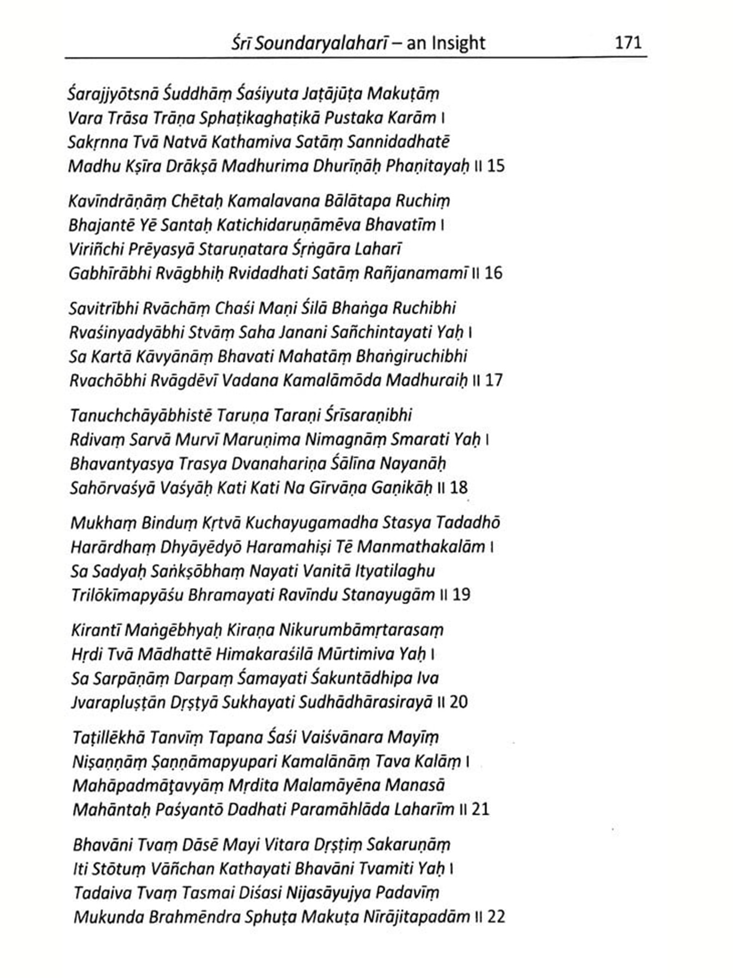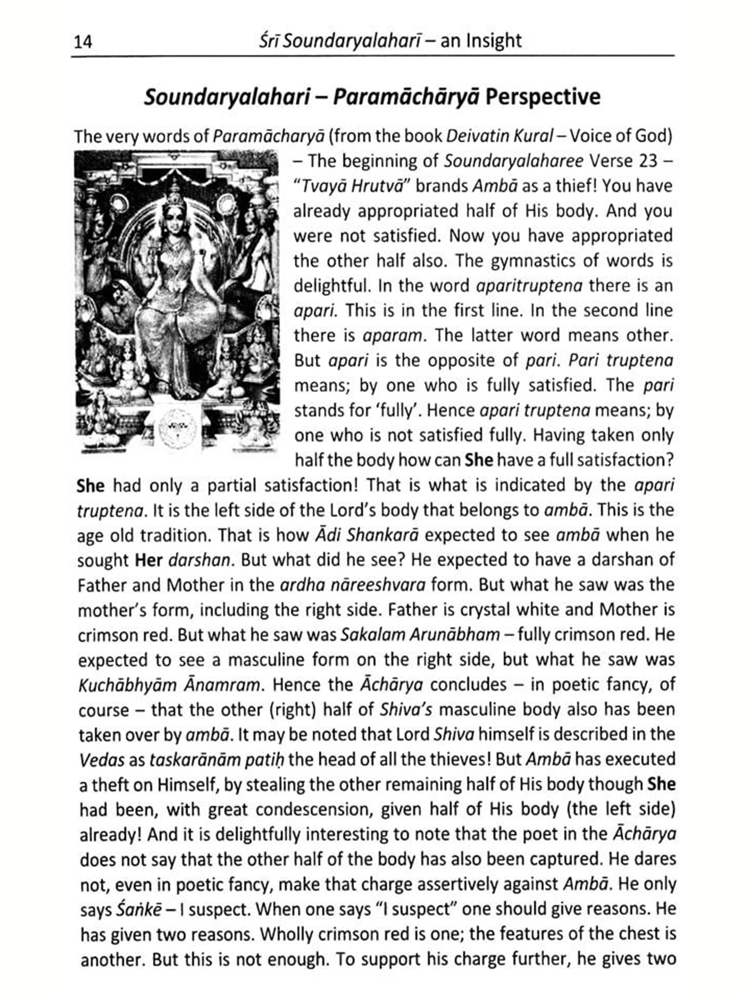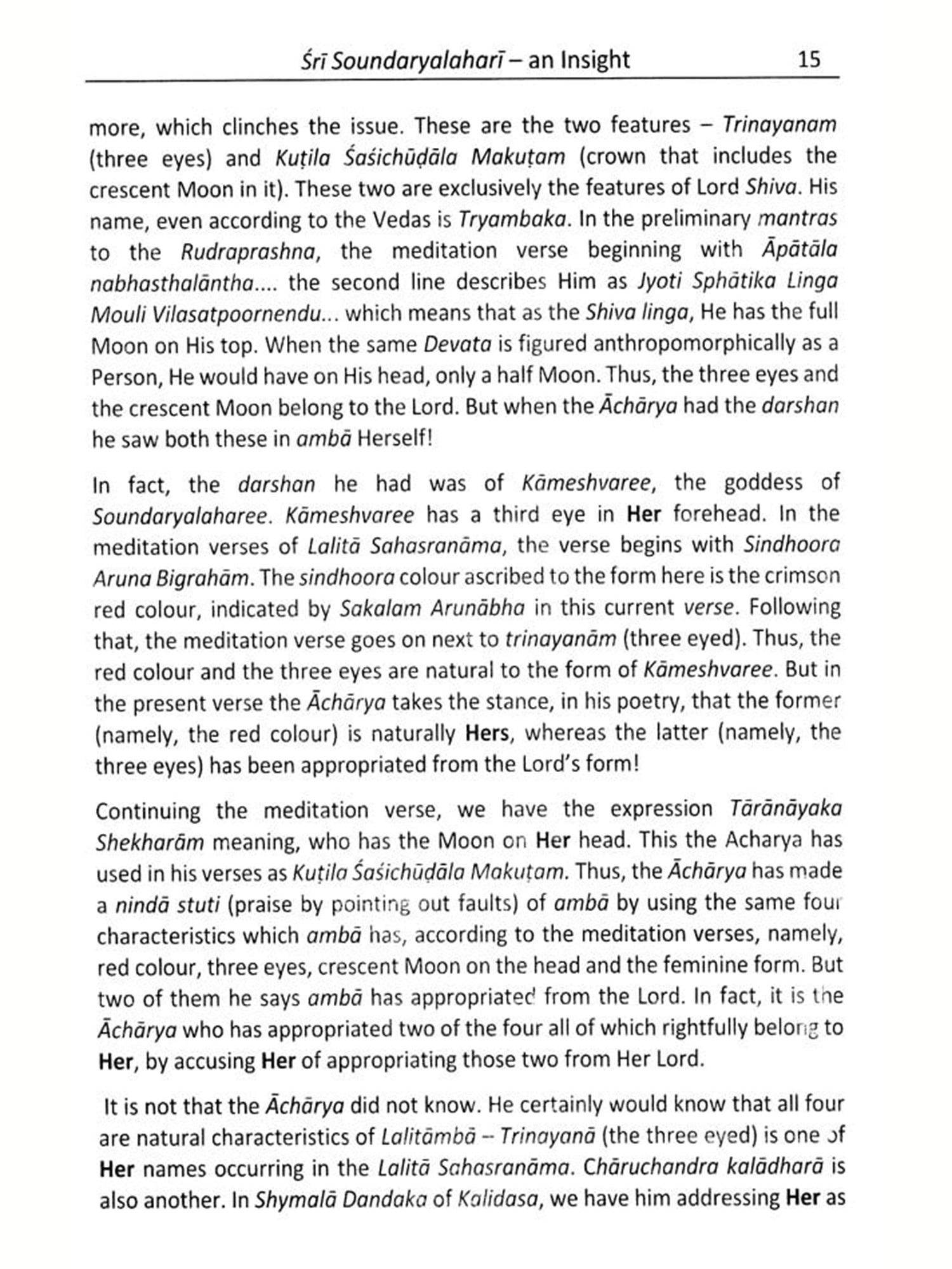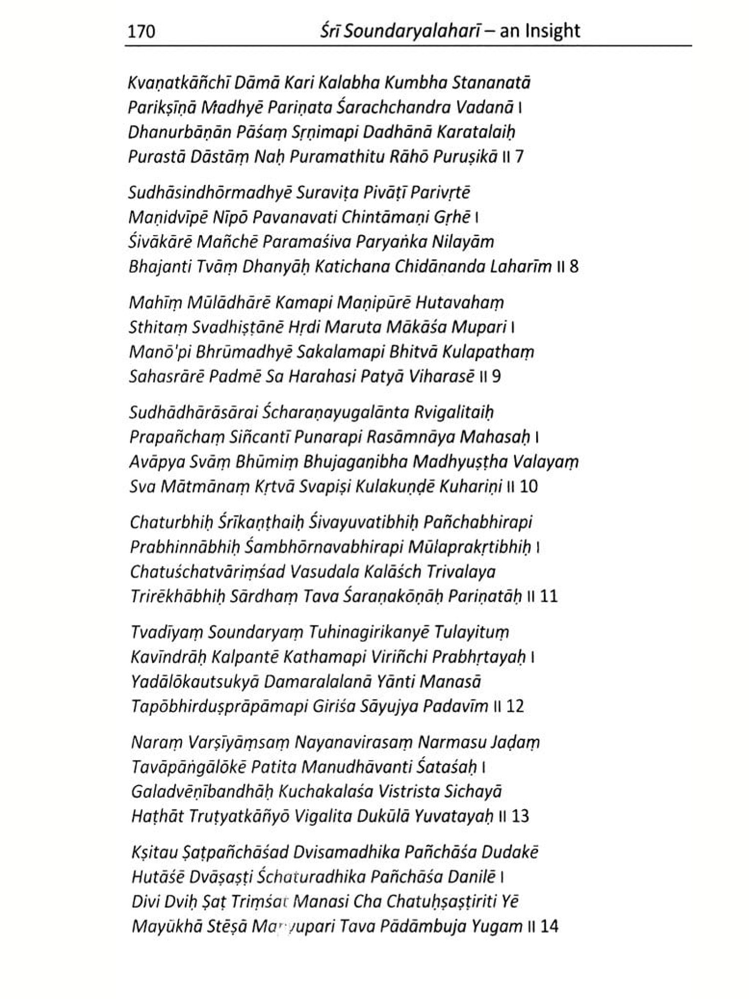 The Soundarya Lahari is not only a poetic text. It is a tantra text, giving instructions on Puja and offerings, many Yantras, one to each shloka; describing the tantra techniques of performing devotion connected to each specific shloka and details, the results ensuing therefrom. There are many interpretations and commentaries but best of these are arguably those that provide word to word translations, as also the Yantra, the devotion to be performed and the results of the devotion. Original Samskruta Text of Soundarya Lahari with English Transliteration has been provided to make the book more useful.