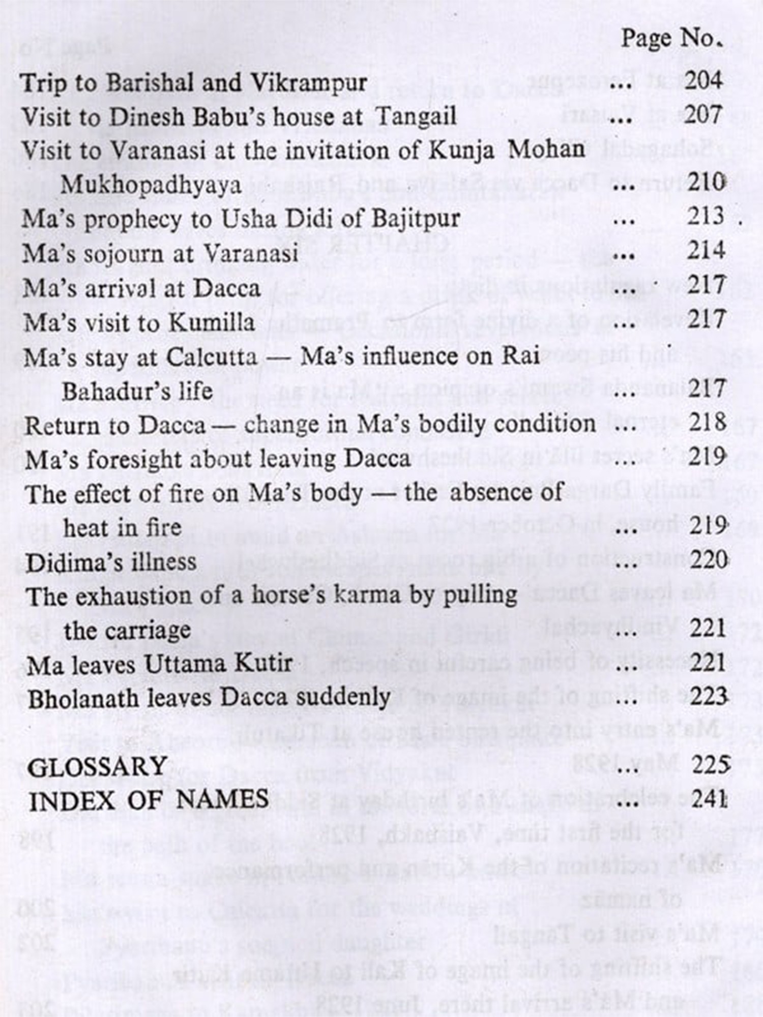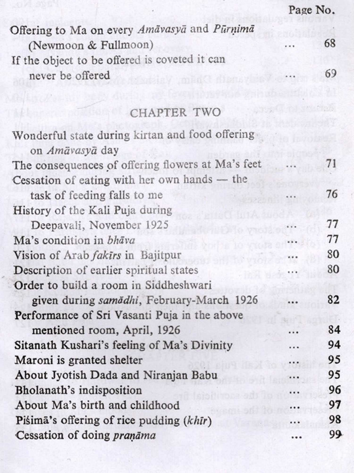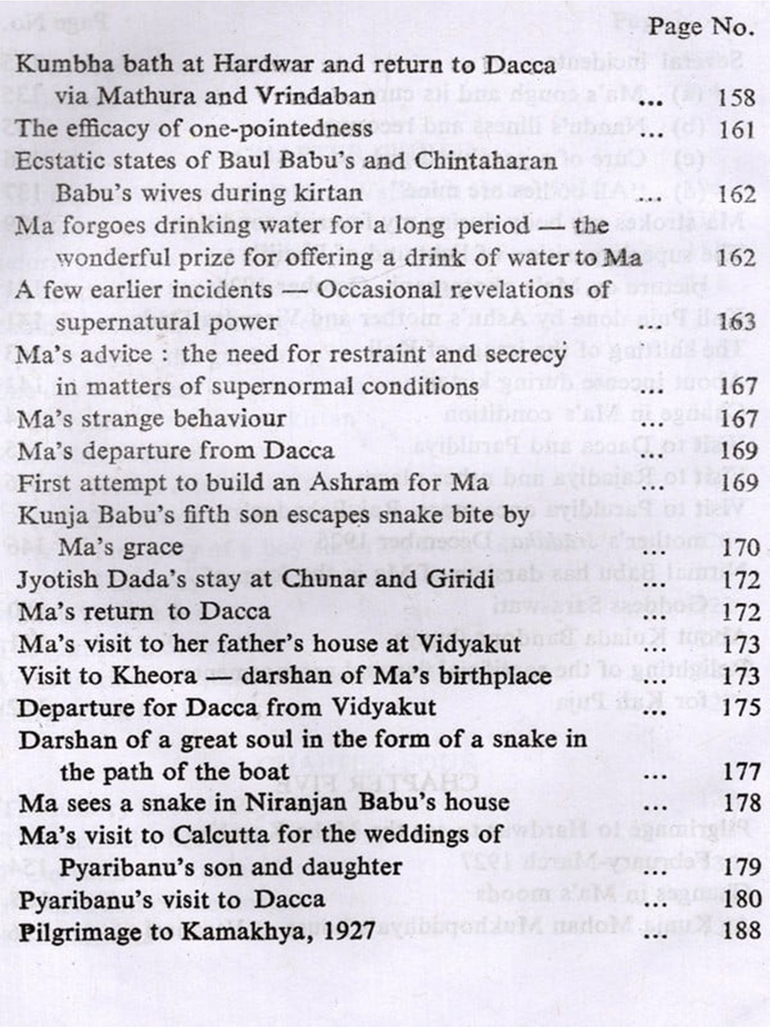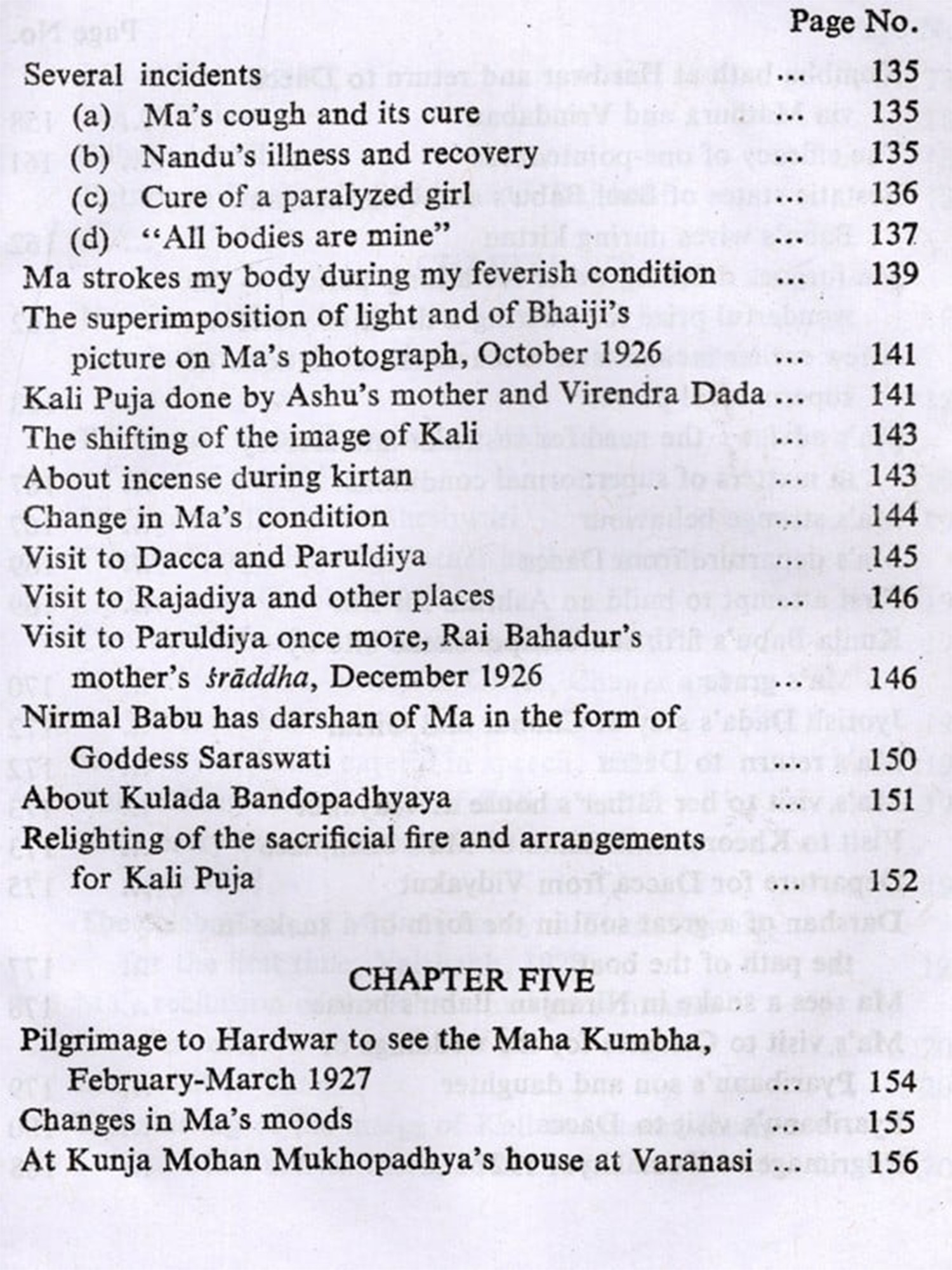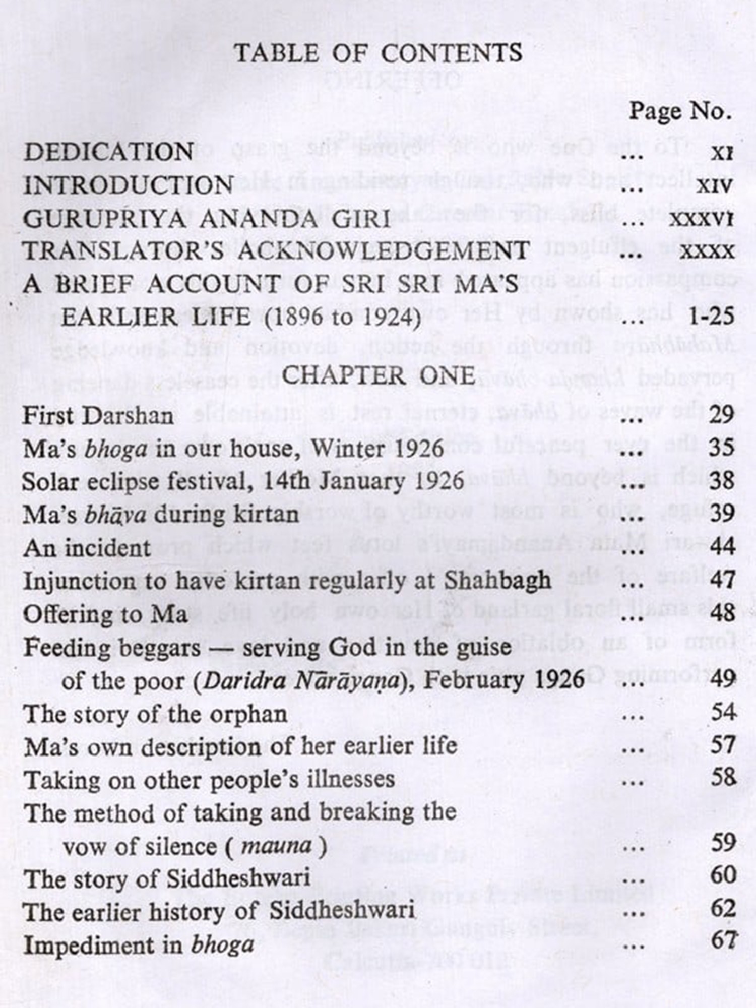 The authoress has delineated Ma's outward behaviour as skillfully as possible in this book, and has also noted the delightful teachings uttered by Ma Herself. The authors of ""Matri Darshan"" and ""Sri Sri Ma Anandamayi Prasanga"", have also made similar attempts in a beautiful way. A description of Ma's divine lila as performed by Her body will surely be obtained by reading all these books. Those who have had the good fortune of actually meeting Ma and hearing her speak, will derive a clearer picture.
