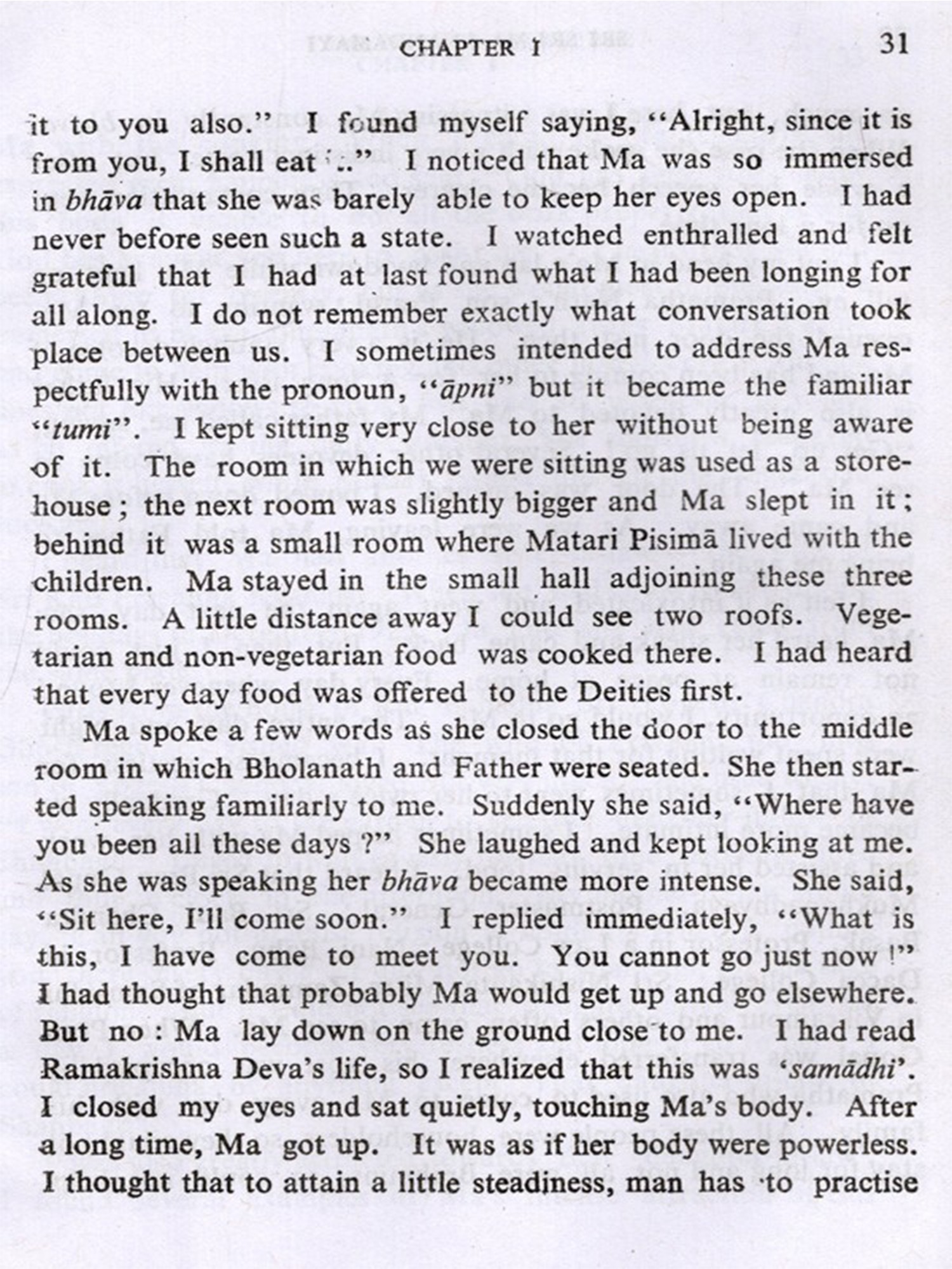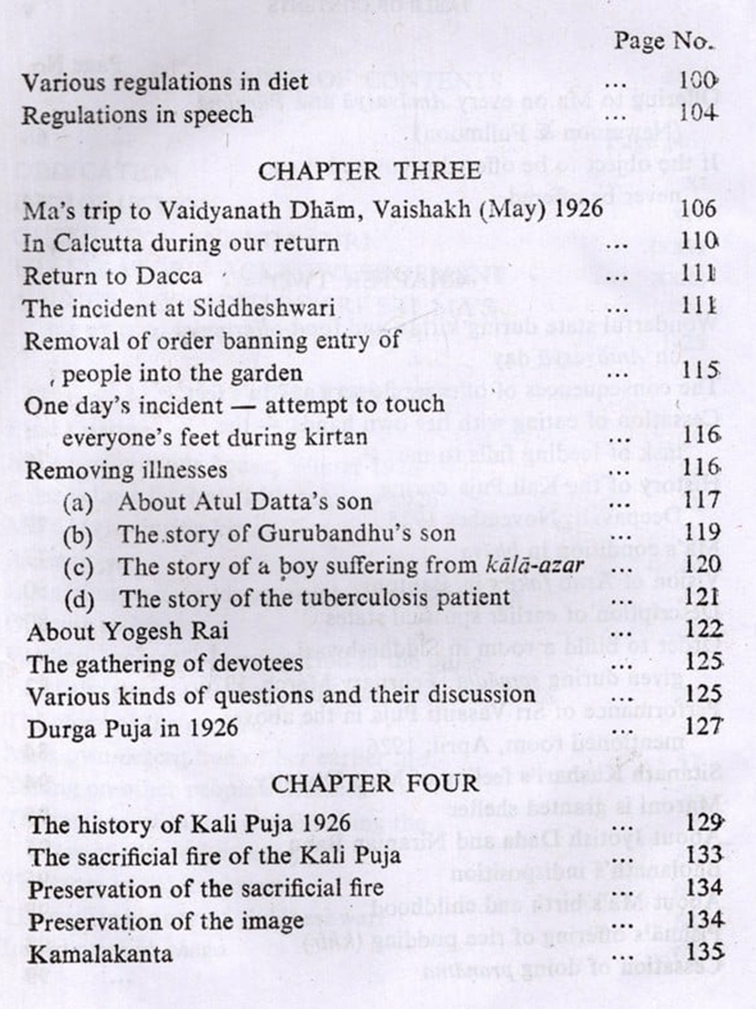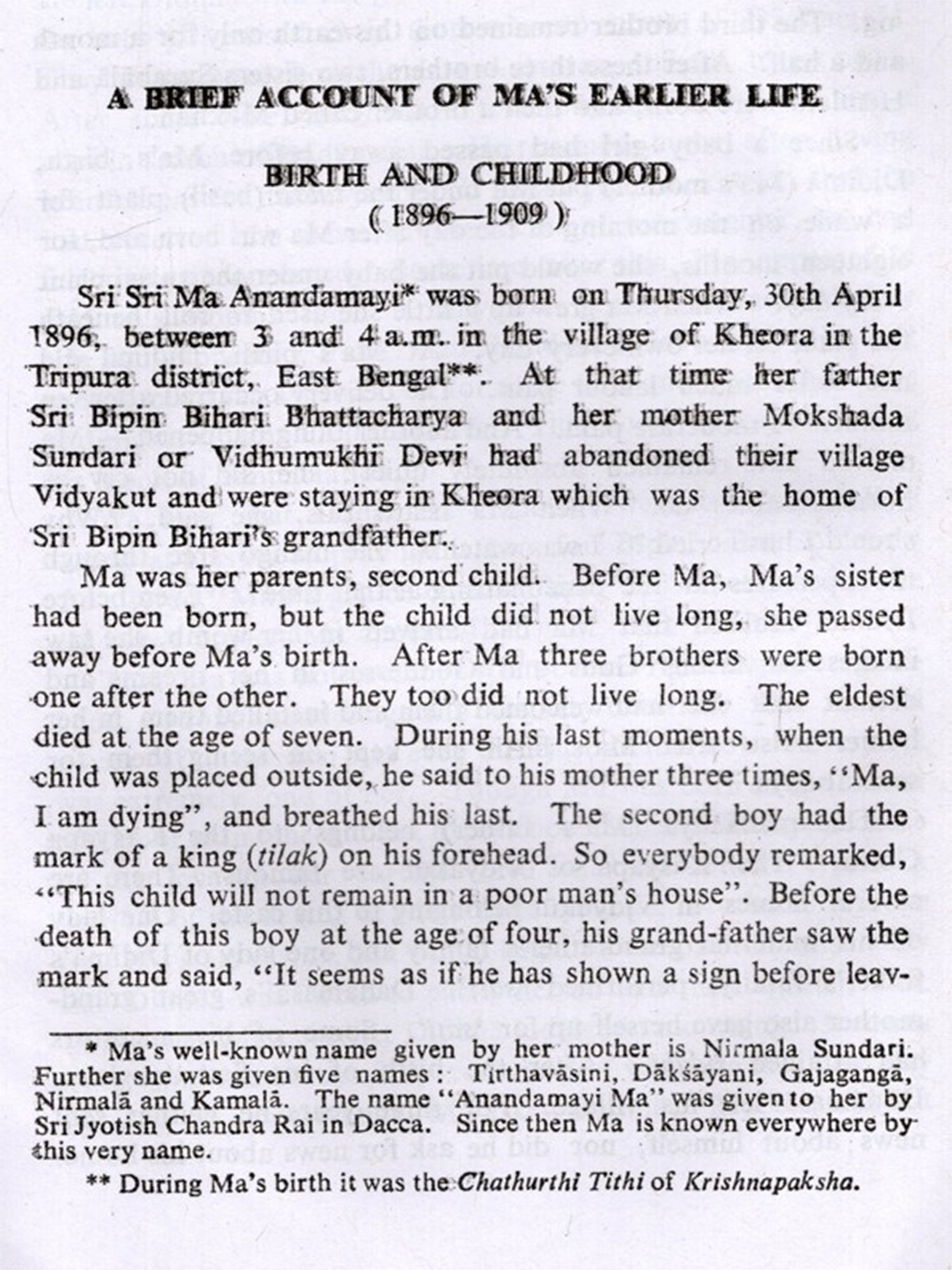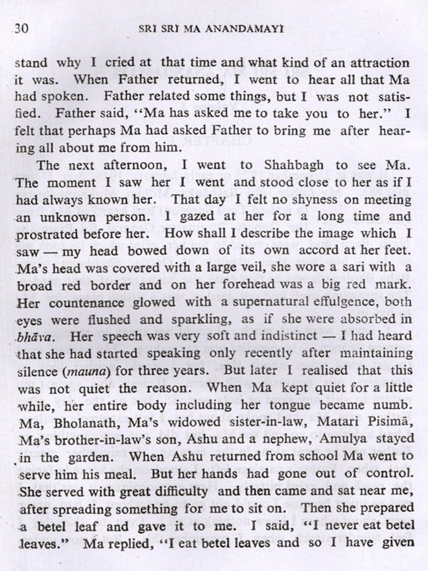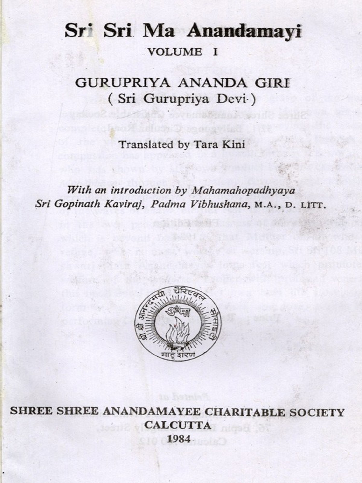 The authoress has delineated Ma's outward behaviour as skillfully as possible in this book, and has also noted the delightful teachings uttered by Ma Herself. The authors of ""Matri Darshan"" and ""Sri Sri Ma Anandamayi Prasanga"", have also made similar attempts in a beautiful way. A description of Ma's divine lila as performed by Her body will surely be obtained by reading all these books. Those who have had the good fortune of actually meeting Ma and hearing her speak, will derive a clearer picture.