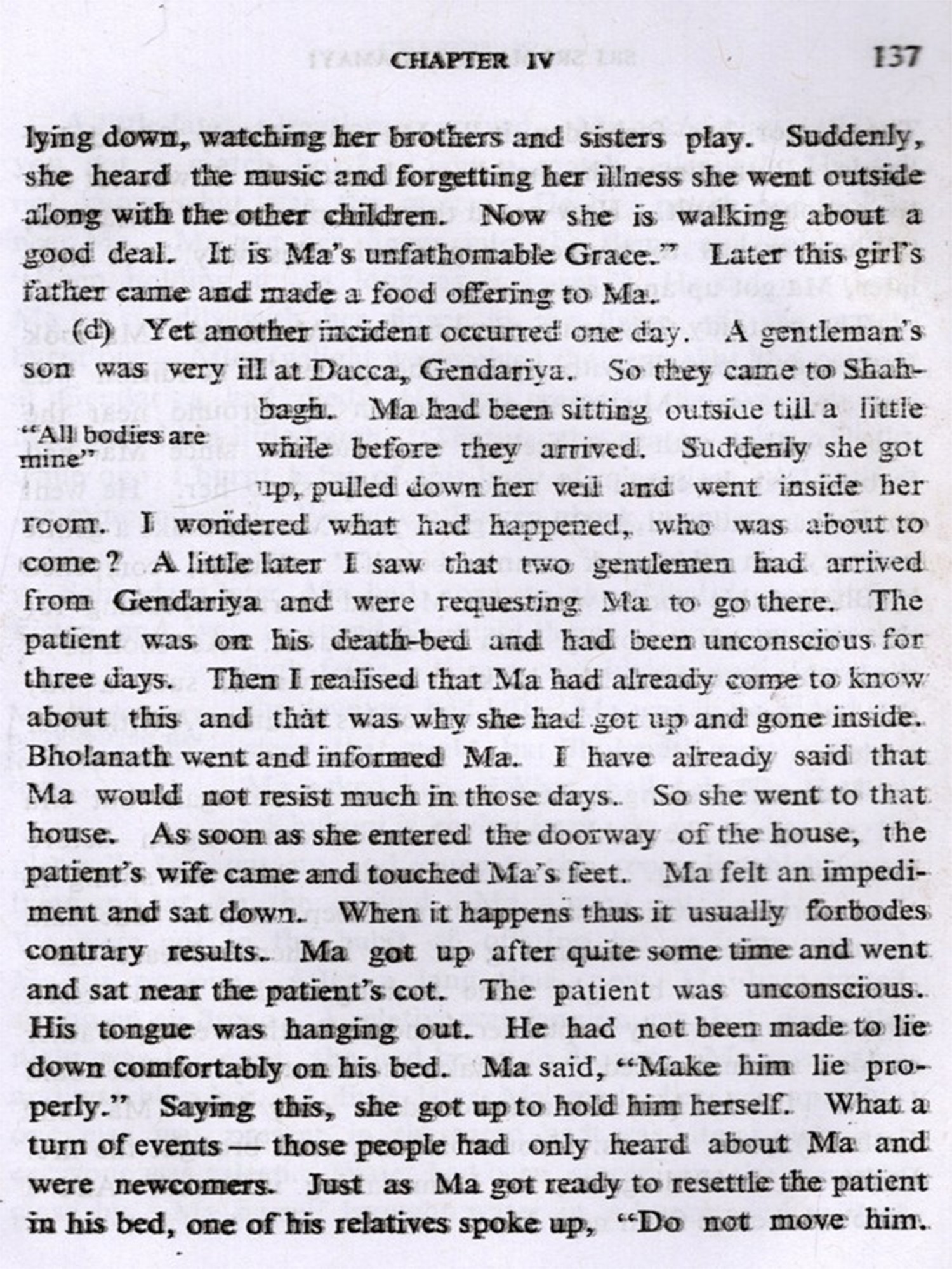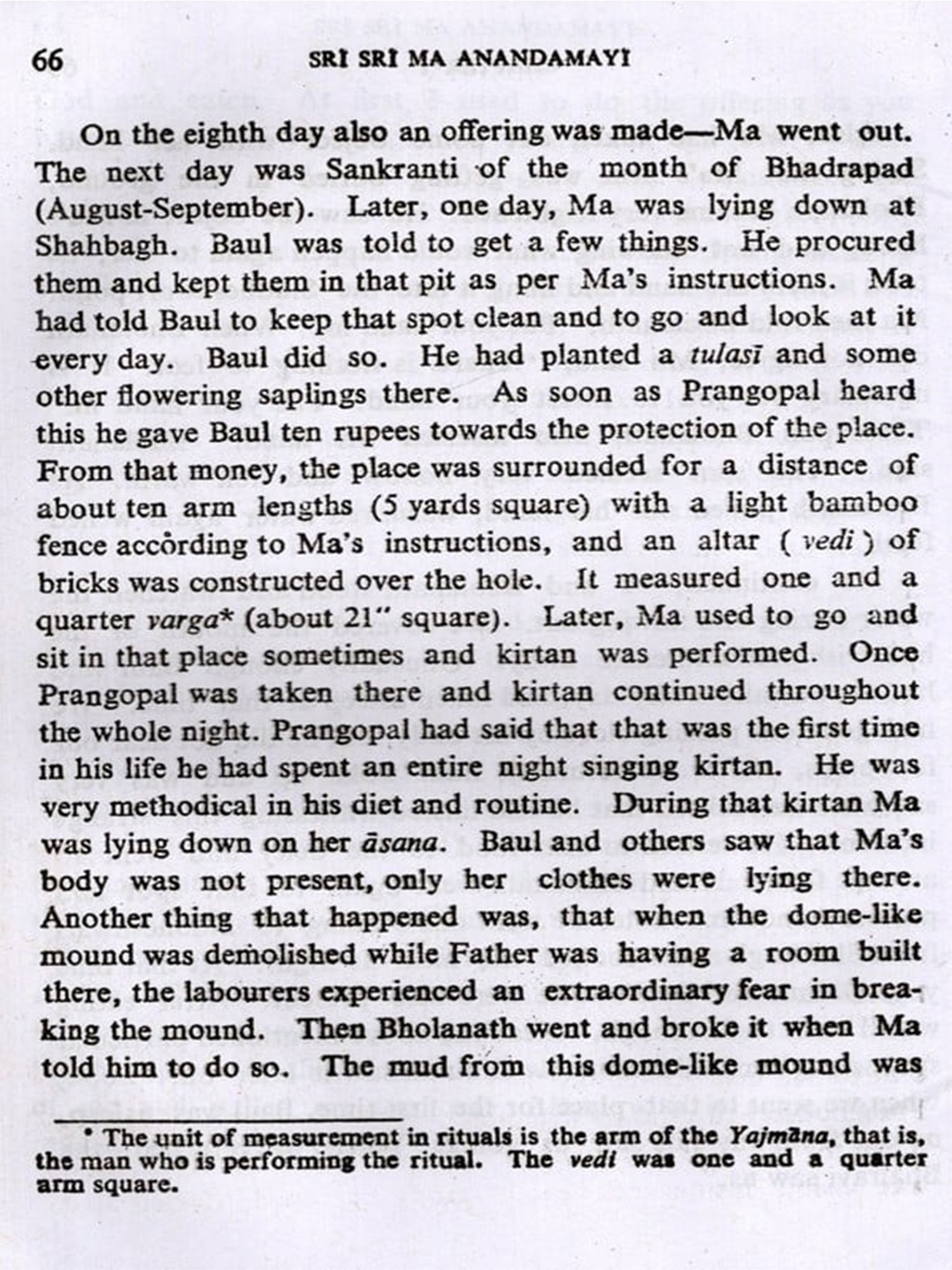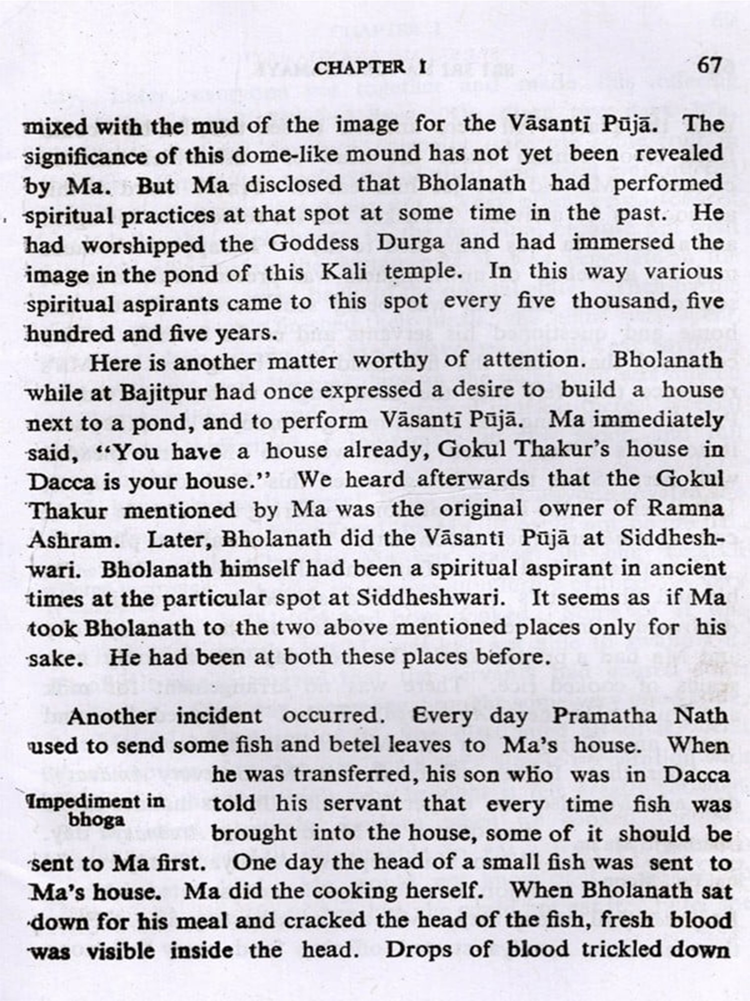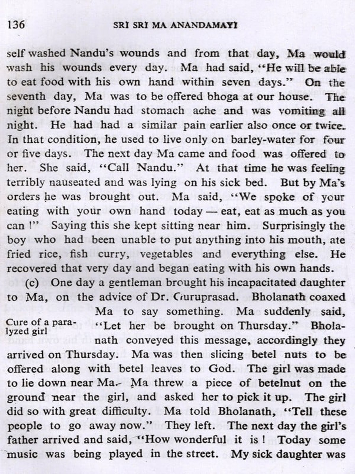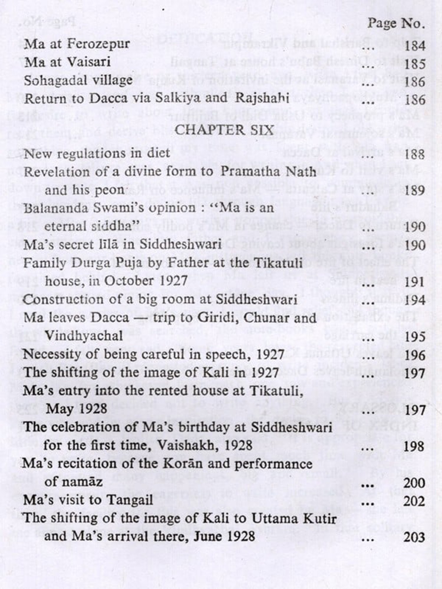 The authoress has delineated Ma's outward behaviour as skillfully as possible in this book, and has also noted the delightful teachings uttered by Ma Herself. The authors of ""Matri Darshan"" and ""Sri Sri Ma Anandamayi Prasanga"", have also made similar attempts in a beautiful way. A description of Ma's divine lila as performed by Her body will surely be obtained by reading all these books. Those who have had the good fortune of actually meeting Ma and hearing her speak, will derive a clearer picture.