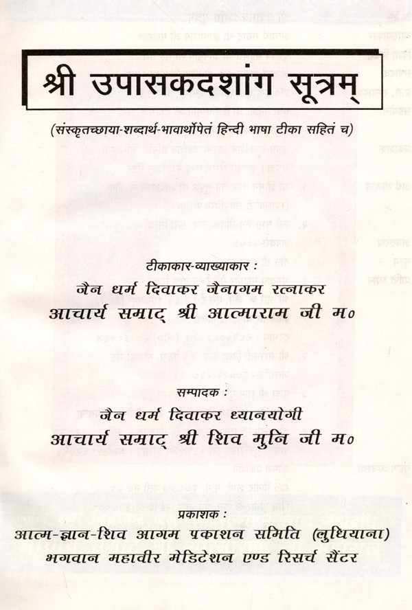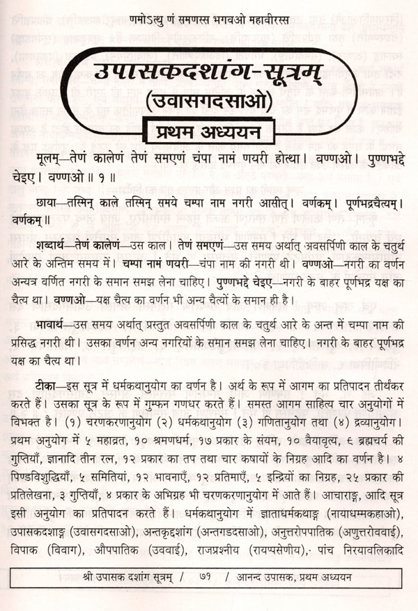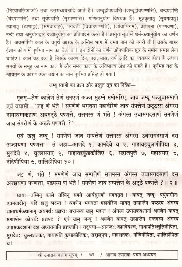 किसी ग्रन्य की प्रस्तावना लिखते समय हमारे सामने उसके दो रूप आते हैं बहिरङ्ग और अन्तरङ्ग। बहिरङ्ग रूप का अर्थ है उस ग्रन्य के रचनाकाल, कर्ता, भाषा, एवं बाह्य आकार से सम्बन्ध रखने वाली अन्य बातों का निरुपण। उपासकदशाङ्ग सूत्र सातवां अङ्ग है और सभी अङ्ग श्री सुधर्मा स्वामी की रचना माने जाते हैं। उनका निरुपण प्रस्तावना के पहले खण्ड में किया जाएगा।