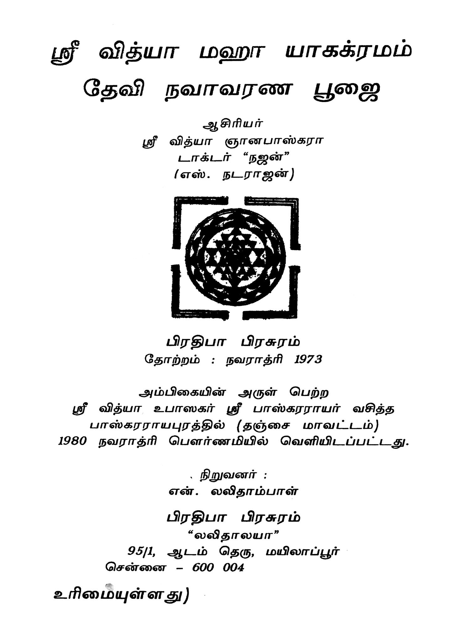 ஸ்ரீ மஹா மேரு மண்டலியின்- ஸ்ரீவித்யா நவாவரண பூஜா பத்ததி: Sri Maha Meru Mandaliyin Sri Vidhya Navavarana Pooja Bhaddhathi (Tamil)