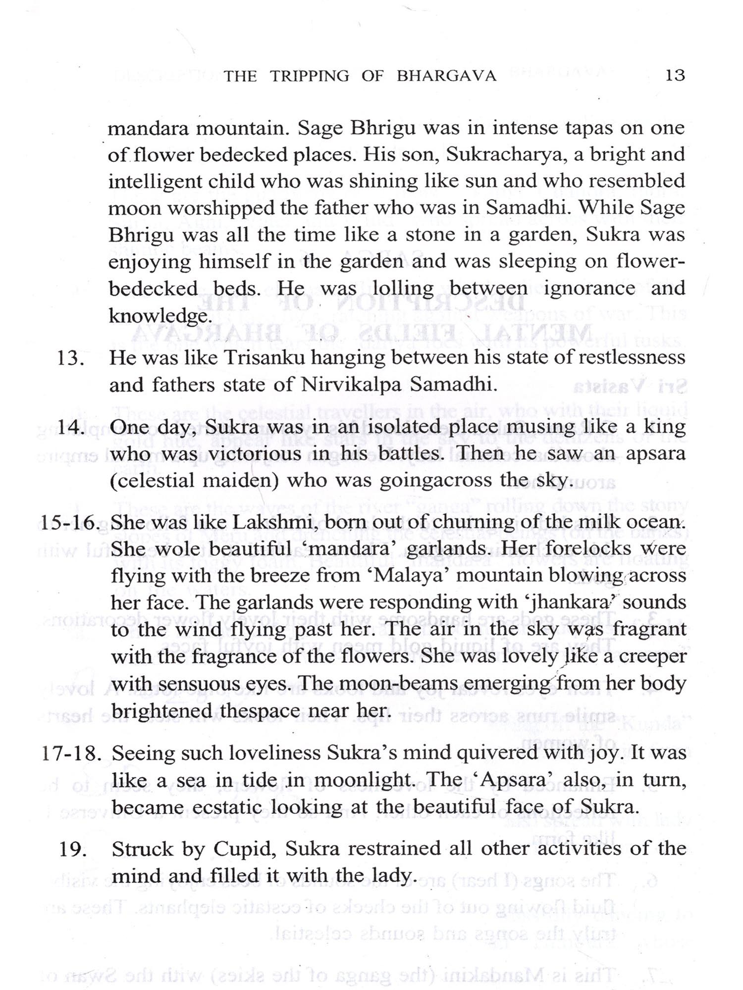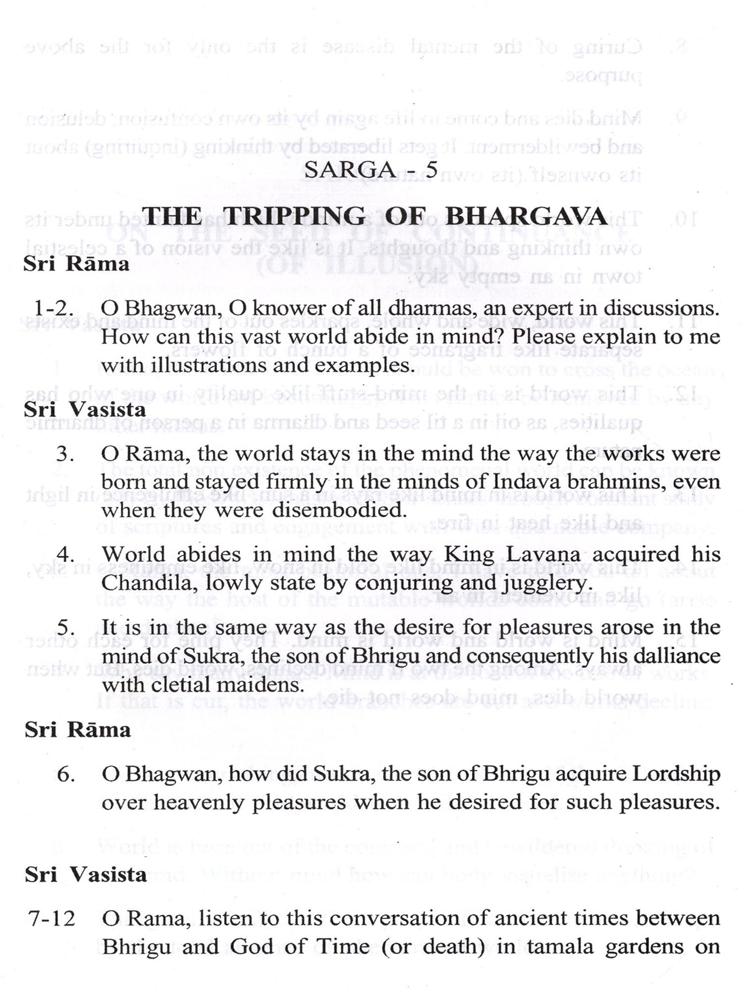 Viswamitra, the great sage of many spiritual attainments and achievements, comes to the court of Dasaratha, King of Ayodhya, to request for the help of his son Prince Rama for protecting his Sacrificial site from the ravaging onslaughts of the Rakshas (demons). Dasaratha, the aged king, was initially hesitant to send Rama to the battlefield. He pleads with Viswamitra 'Rama is only sixteen years now. He does not have the experience of a battle, and least of all, with the ferocious Rakshas. I shall come instead with all my armies. Viswamitra concedes that Dasaratha is an experienced battle-scarred warrior of significant successes. Even so he can not replace Rama who, though young, is highly skilled in warfare. He requests Sage Vasishta, the Guru of Raghu clan, the dynasty of Dasaratha and Rama, to intervene on his behalf. Sage Vasishta explains to Dasaratha that Rama is no ordinary person and suggests that he accedes to the request of Sage Viswamitra. Unable to counter Vasishta, since the word of a Guru is like command, Dasaratha agrees to send Rama and tells Rama to accompany Sage Viswamitra. But Rama was averse to undertake the expedition even though he is a dutiful son. He has just returned from a pilgrimage to various holy places of India and the result of the tour was a conviction that there is very little to commend the pursuing of activity in an ephemeral world. Thus starts the famous dialogue between Sage Vasishta and Rama. This dialogue was recorded by Sage Valmiki as Vasishta Maharamayana. The span and spread of this dialogue is voluminous running into 32000 slokas (couplets) in Sanskrit divided into six books: