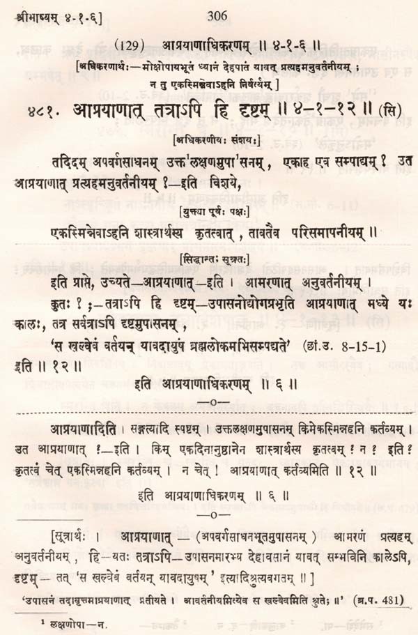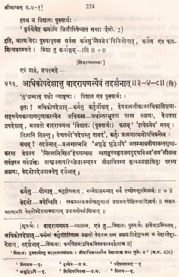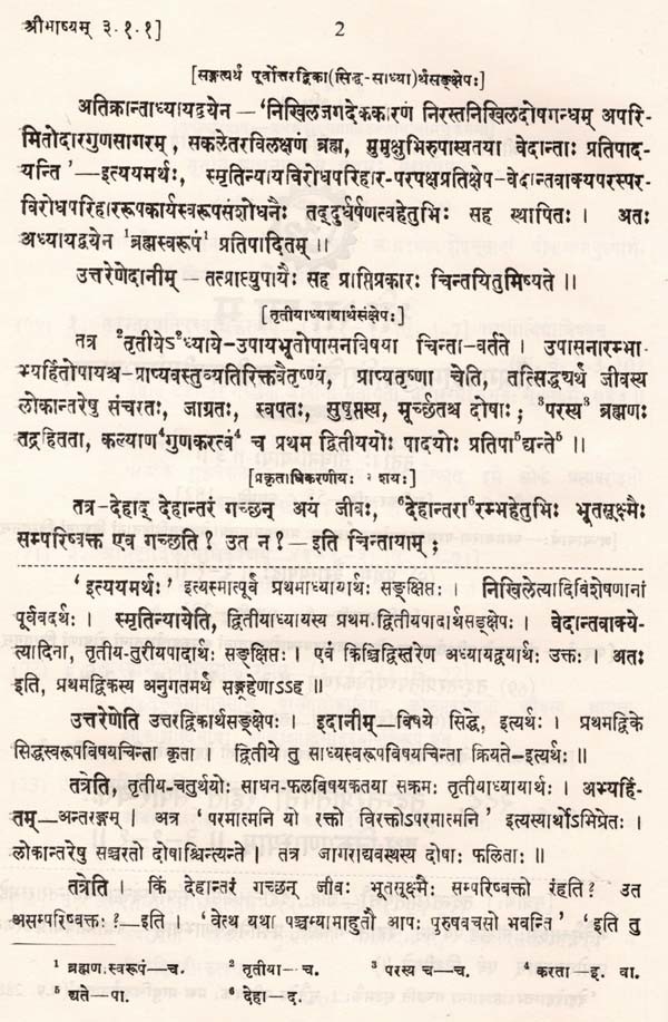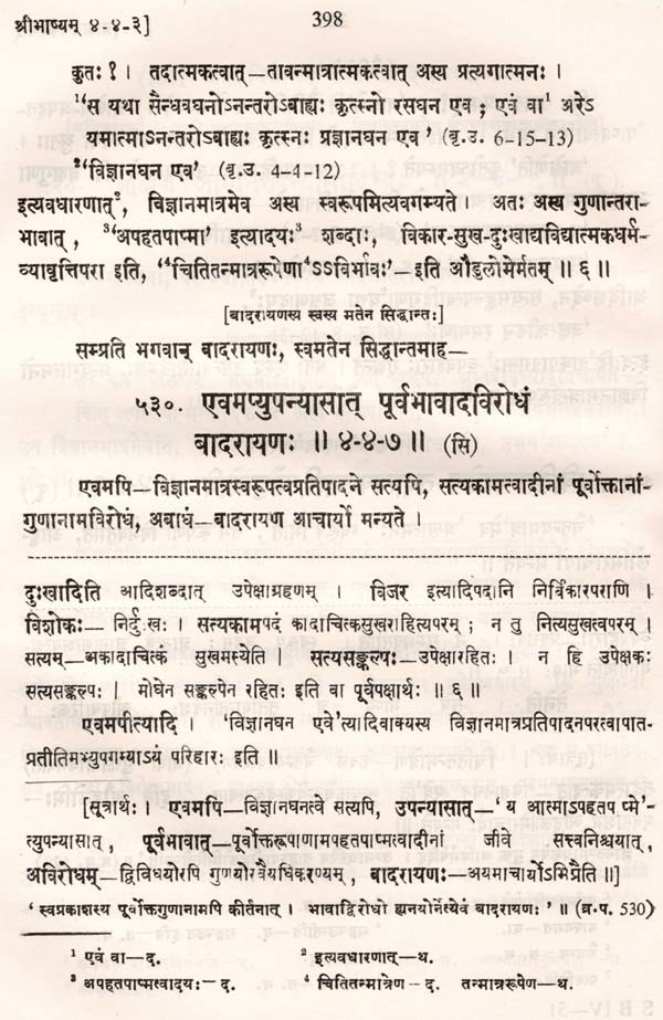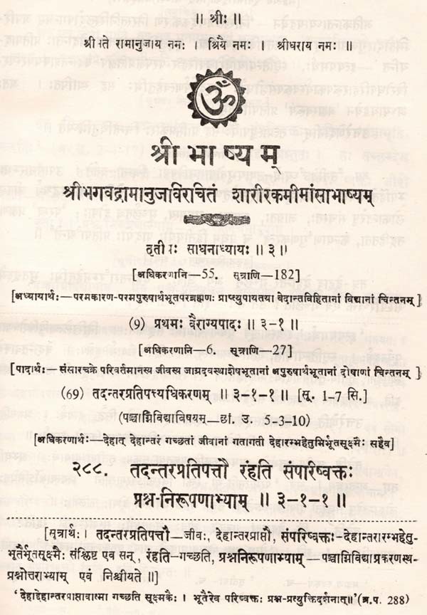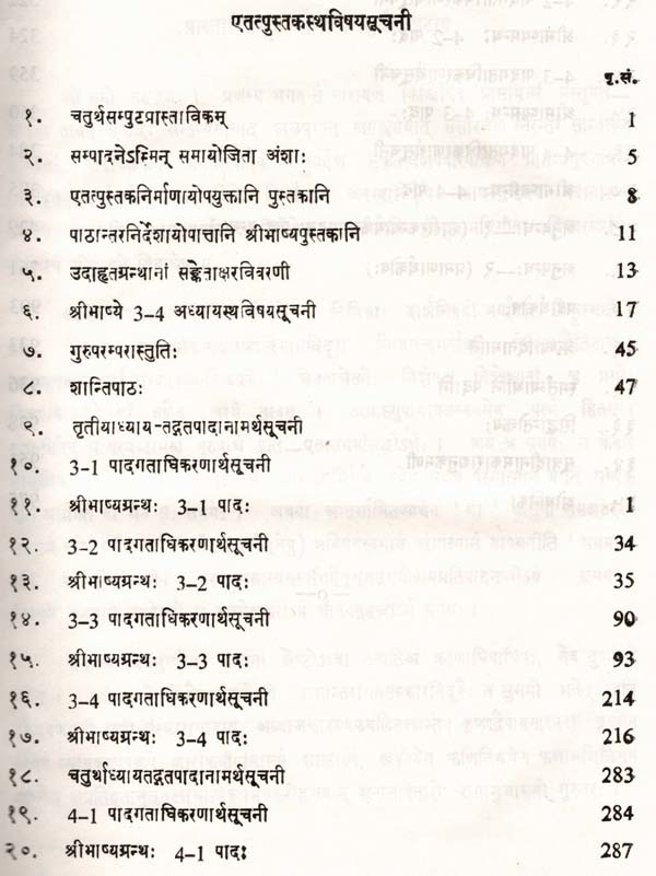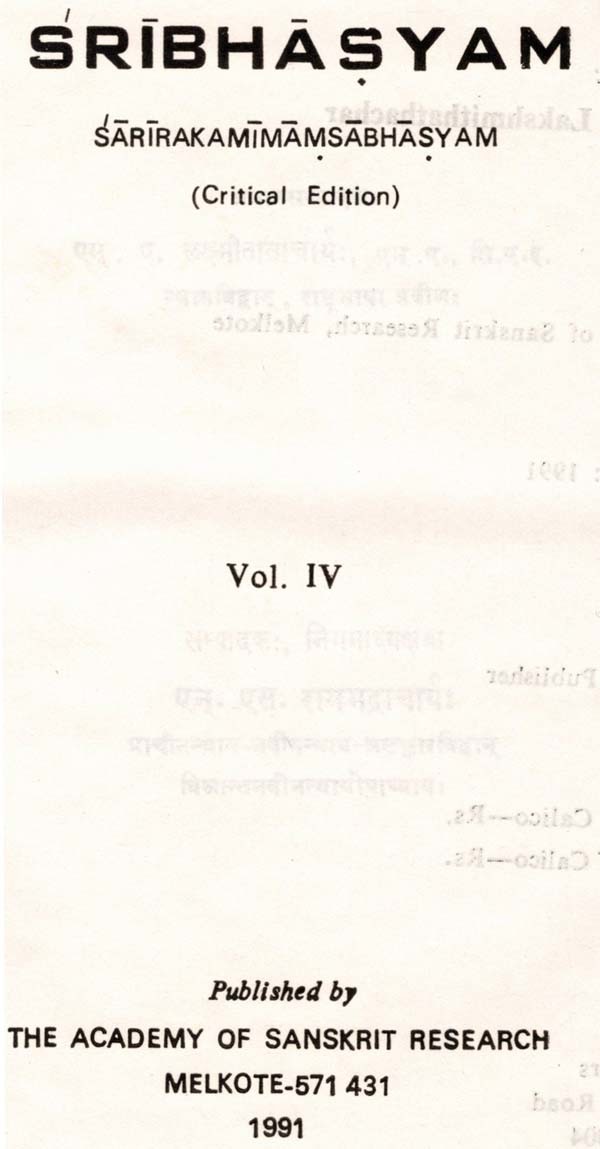 It is with a feeling of satisfaction that the Academy is placing in the hands of the esteemed public this final volume (Volume IV) of the critical edition of Sribhashyam. The three earlier volumes were released in 1985, 87 and 90 respectively. The present volume covers chapters 3 & 4 of Sribhashyam. While chapter 3 deals with the pathway to the goal of life (Sadhana) the concluding chapter explains the goal itself (Phala).