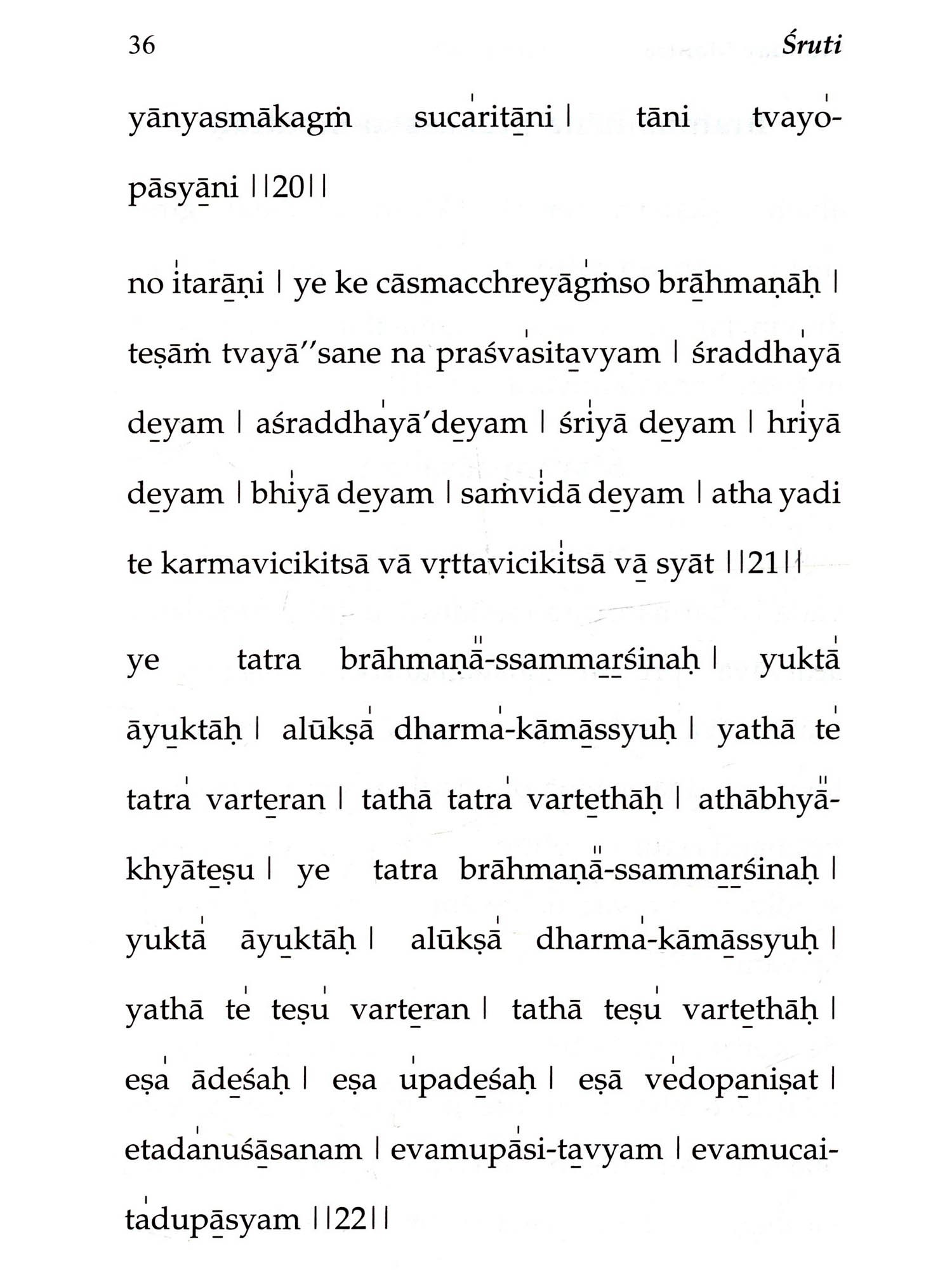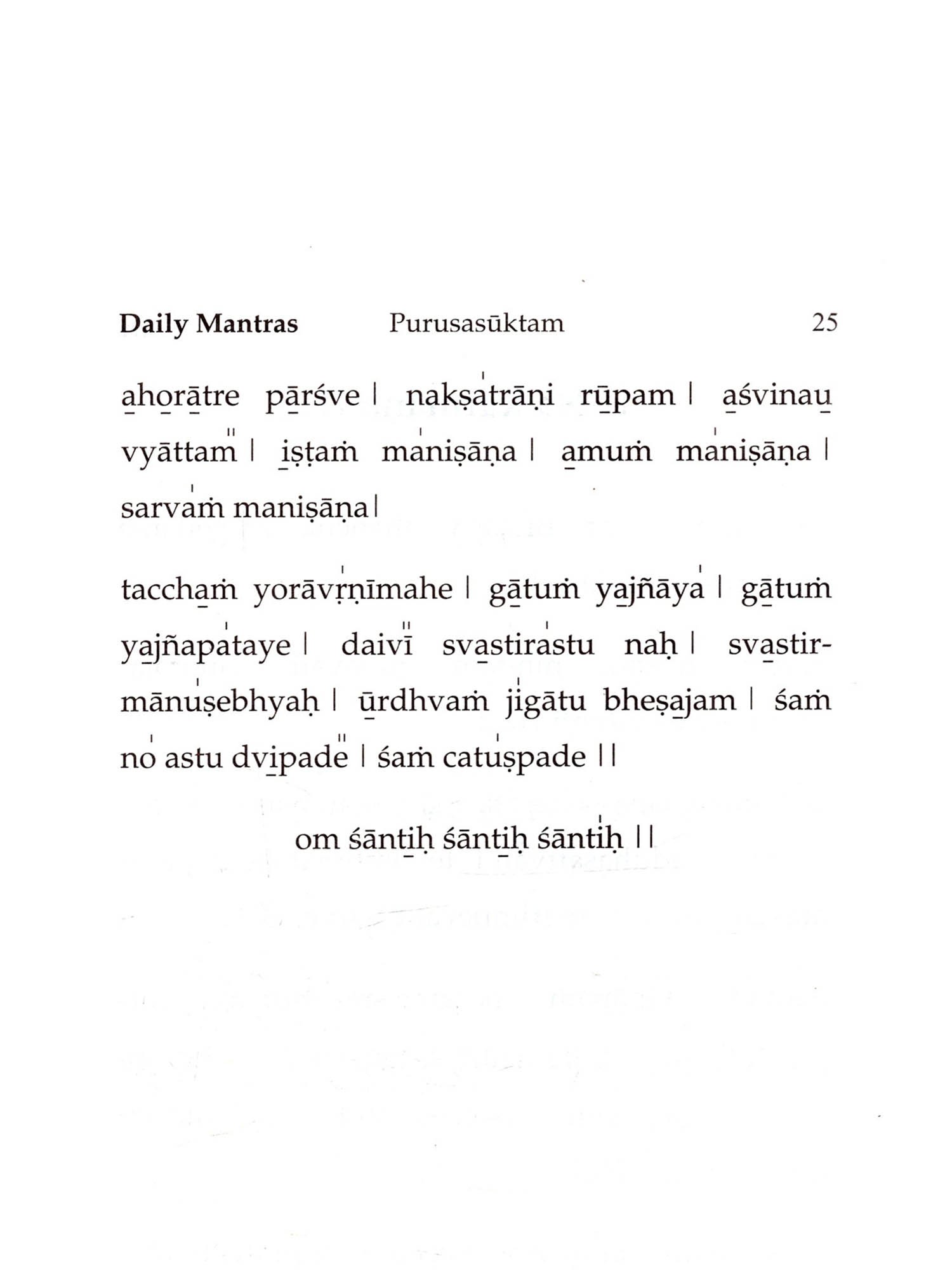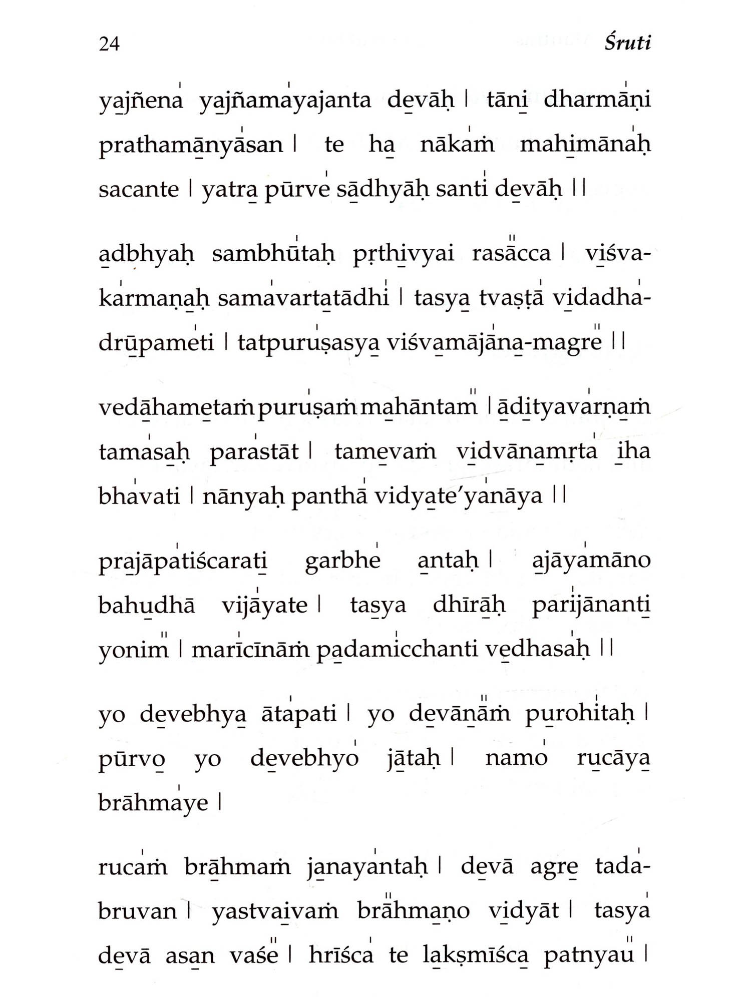 Aum is the primordial sound - God in the reverberating form of sound eternally, from which emanated all the Vedas. They are not authored by human beings. They are timeless, and infinite in number. Proper chanting of Vedic Mantras removes the blemishes and difficulties of both the person who chants and the entire world. Bhagawan has advised: "The Vedas are the very form of God. There are many mantras to propitiate the five elements. The five elements are our very life-breath. They sustain our life... Everyone should necessarily learn the Vedas, contemplate on them and chant them wholeheartedly. When all people chant the mantras in unison and in perfect harmony, Brahman will manifest right in front of you. The sound of the Vedas is highly sacred. Whatever Vedic mantras you learn, you should be able to chant them properly. It is compulsory for everyone to learn the Vedas." Sruti is a unique book that helps you to follow and chant the Vedic Mantras day-wise, as they echo and reverberate every day in the Prasanthi Nilayam Mandir. With its help, any new aspirant can easily learn these Vedic Mantras with a little effort. This book has an introduction to Vedas, a transliteration scheme for the English version, an intonation lesson, the correct method of chanting, and also a caution on incorrect chanting. Starting with Ganapati Prarthana, it has 55 major Vedic Chants, including Sri Rudram (namakam and chamakam), several important suktams like Purushasuktam, Mahanarayananopanishad and other upanishadic mantras, ghanapathas, Aruna Prasnah, Sarva Devata Gayatri, svasti vachaka shloka and kshama prarthana.