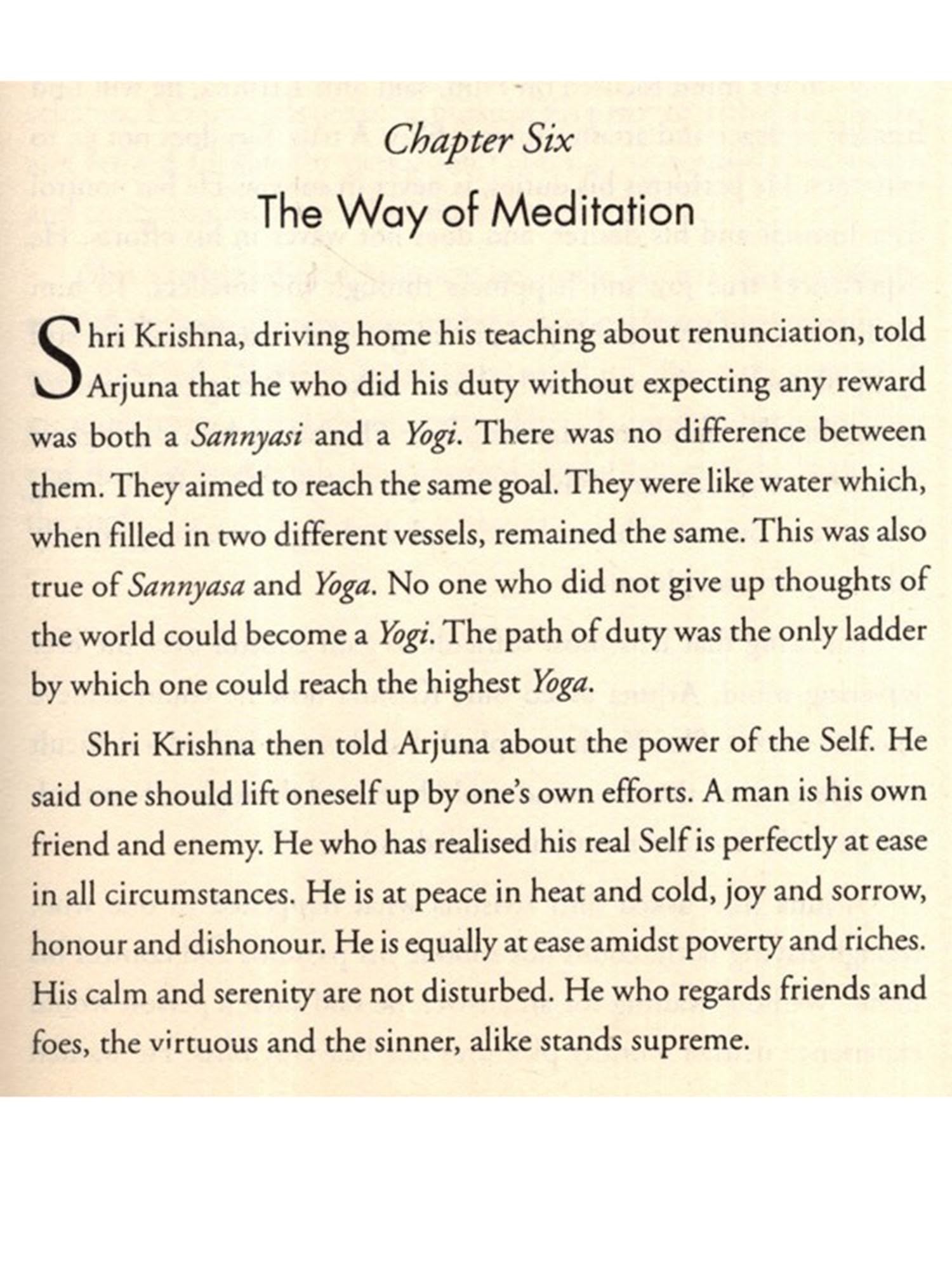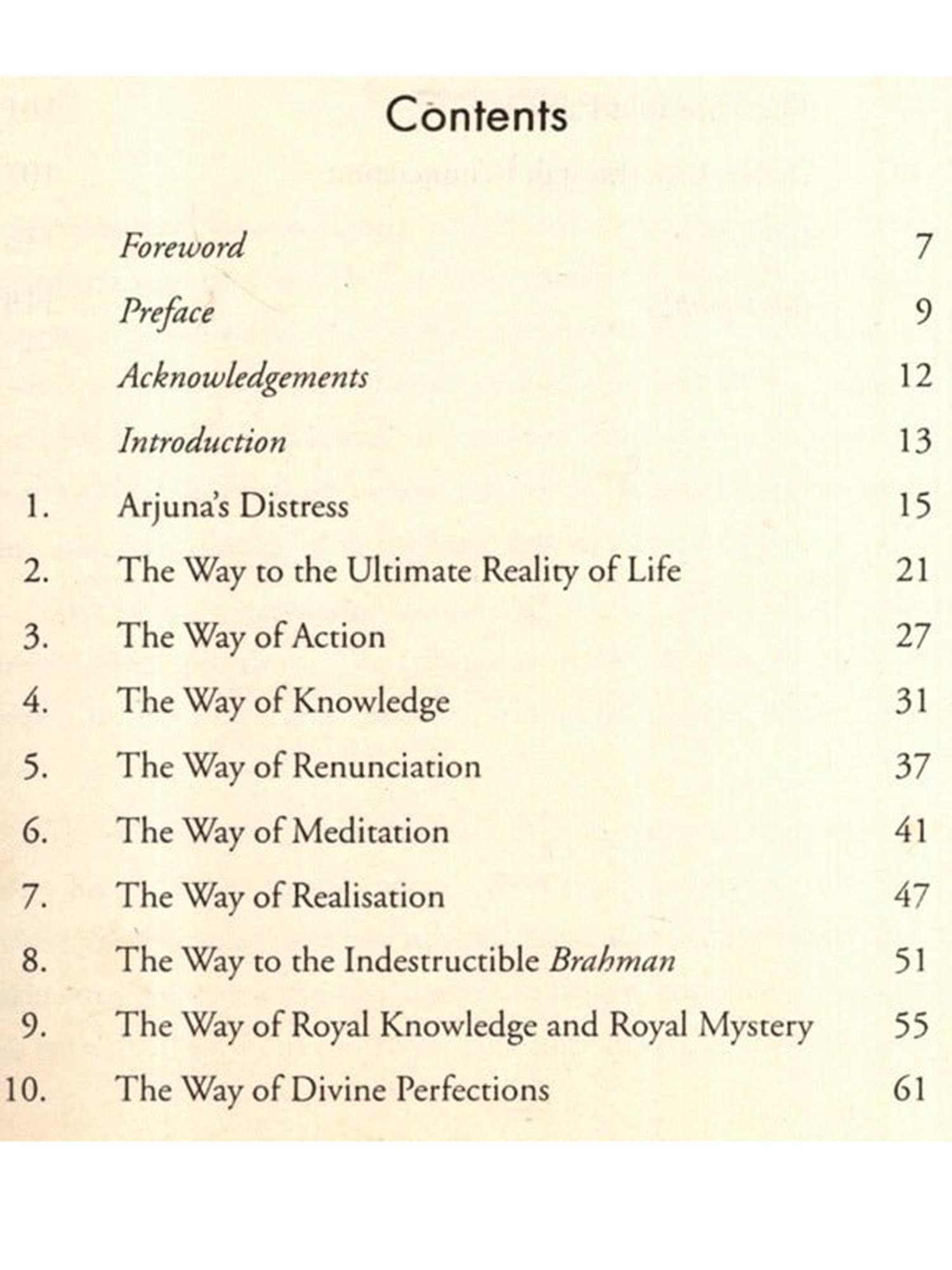 The quintessence of Krishna's teaching is the practice of self-control, selfless work and surrender to God. These form the foundations of happiness and peace of mind. In short, the Bhagavad Gita presents the Science of Being and the Art of Living. It is a complete guide to mastering the problems of day-to-day life-indispensable to all human beings in all ages. The teachings of the Gita inspire all to realise the reality within them. True fulfilment lies in the simultaneous development of the heart and the mind. The Gita presents the timeless wisdom and a way of life by following which any person, irrespective of his/her faith, culture or nationality, can enjoy the blessings of the paths of knowledge, action and devotion.