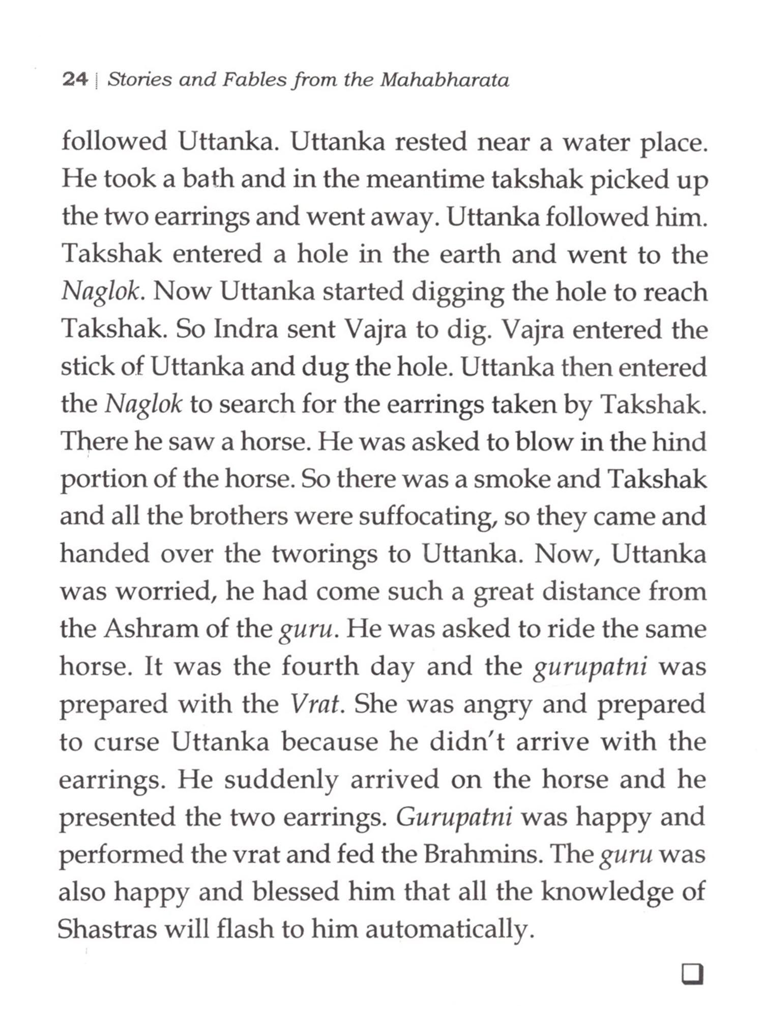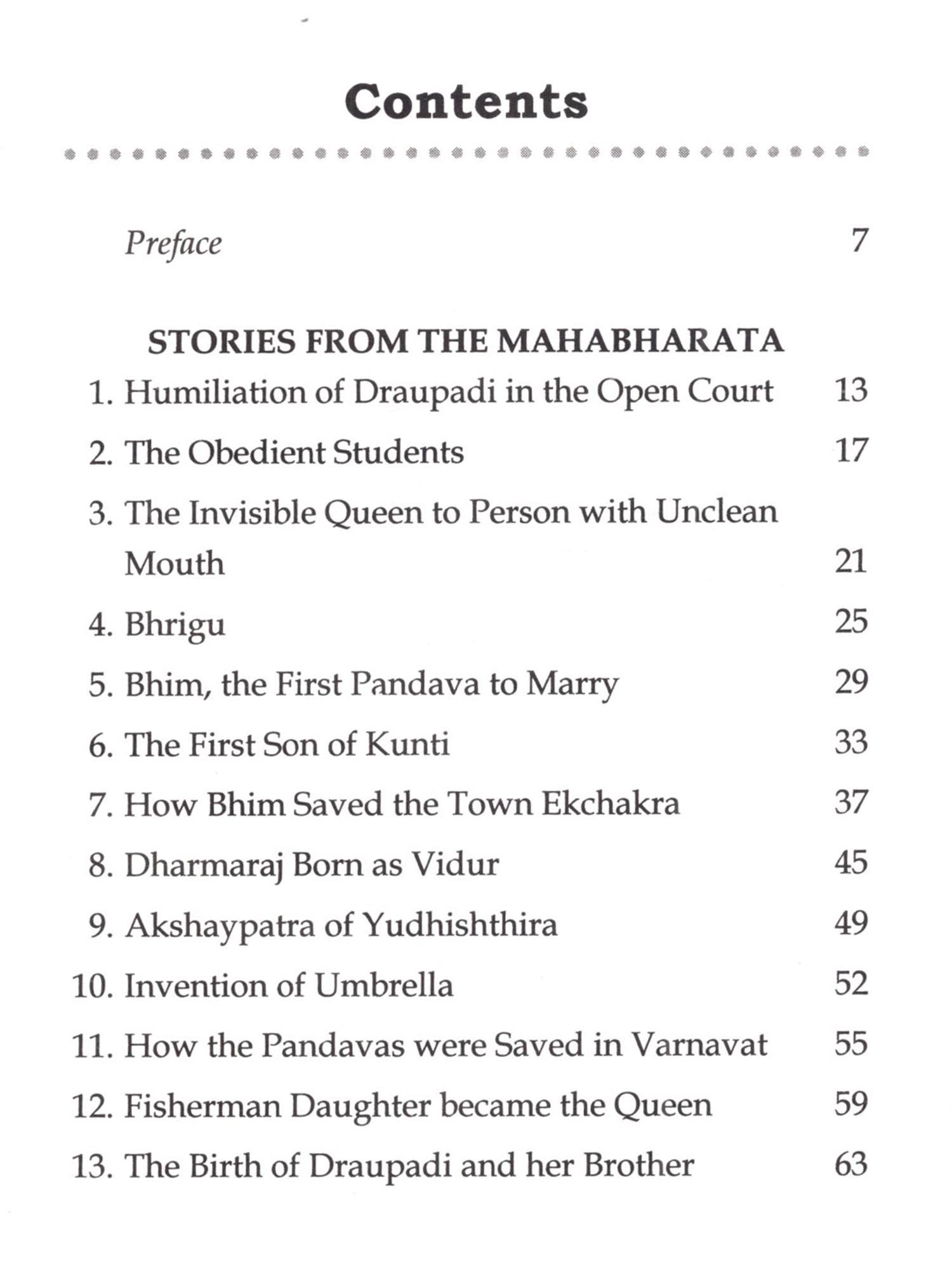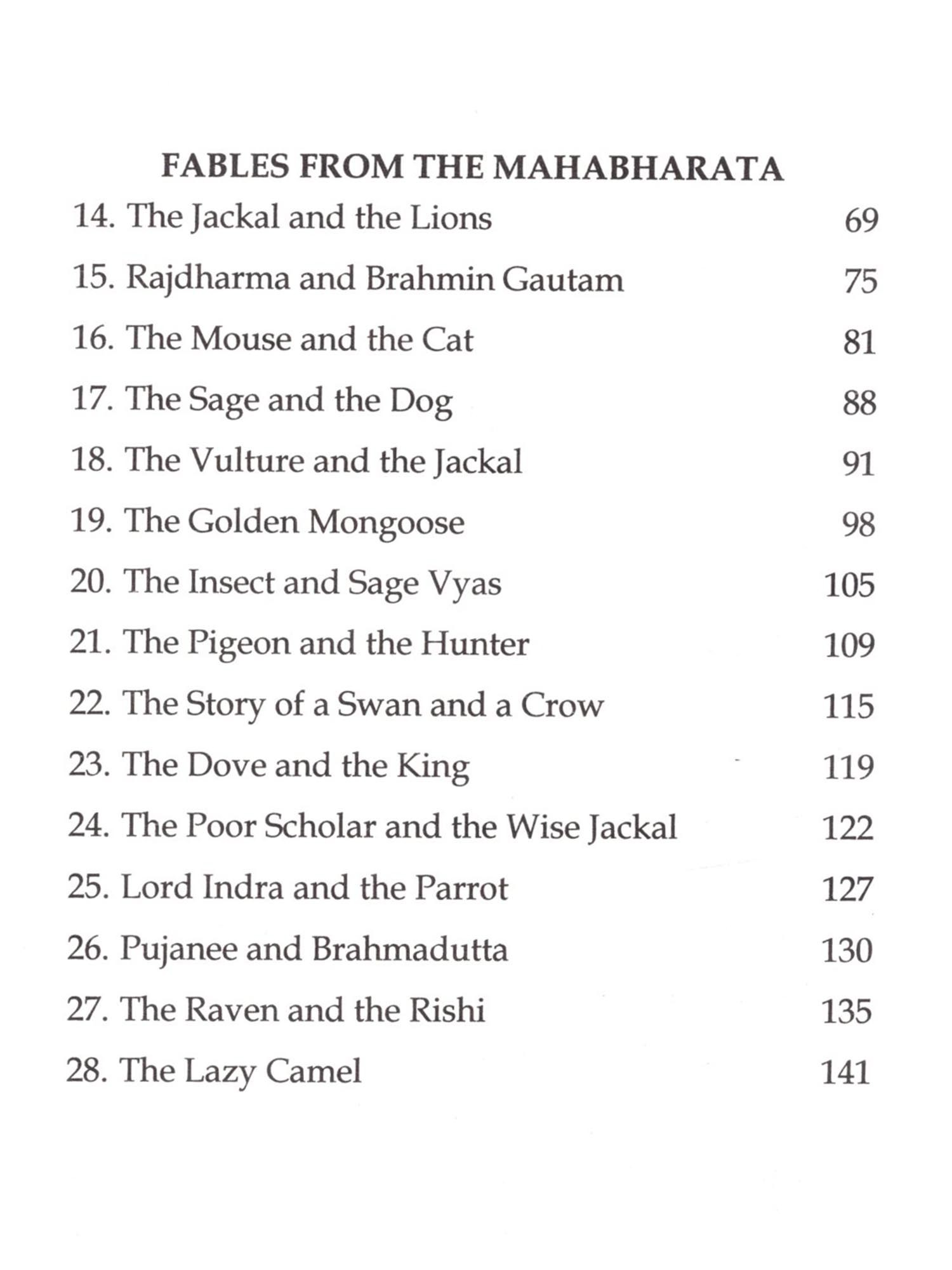 To The Mahabharata is the "book of books". It is an encyclopedia of ancient Bharat (India). That is why it is said, "What is not in the Mahabharata is not in Bharat (India)". Expanse and depth of thoughts and ideas in this book are bewildering. The highest and lowest of human nature are painted in glowing colors. The stories of gods, men, demons, birds, beasts, insects and plants are spread on a big canvas. Conflicts of emotions and call of duty, the wisdom and foolishness of human endeavors described in the Mahabharata, stun the readers. The variety of characters and situations are perennial source of inspiration for politicians, poets, writers and scholars. Even for saints and sages. The Mahabharata is full of interesting and instructive fables. Much before the Aesop's fables, and the Panchtantras, the Mahabharata presented gems of political, diplomatic and humanitarian thoughts and ideas through the fables. They are used to impart valuable ethical and social lessons. The fables from the Mahabharata provide us practical knowledge and also elevate as to higher ethical standards.