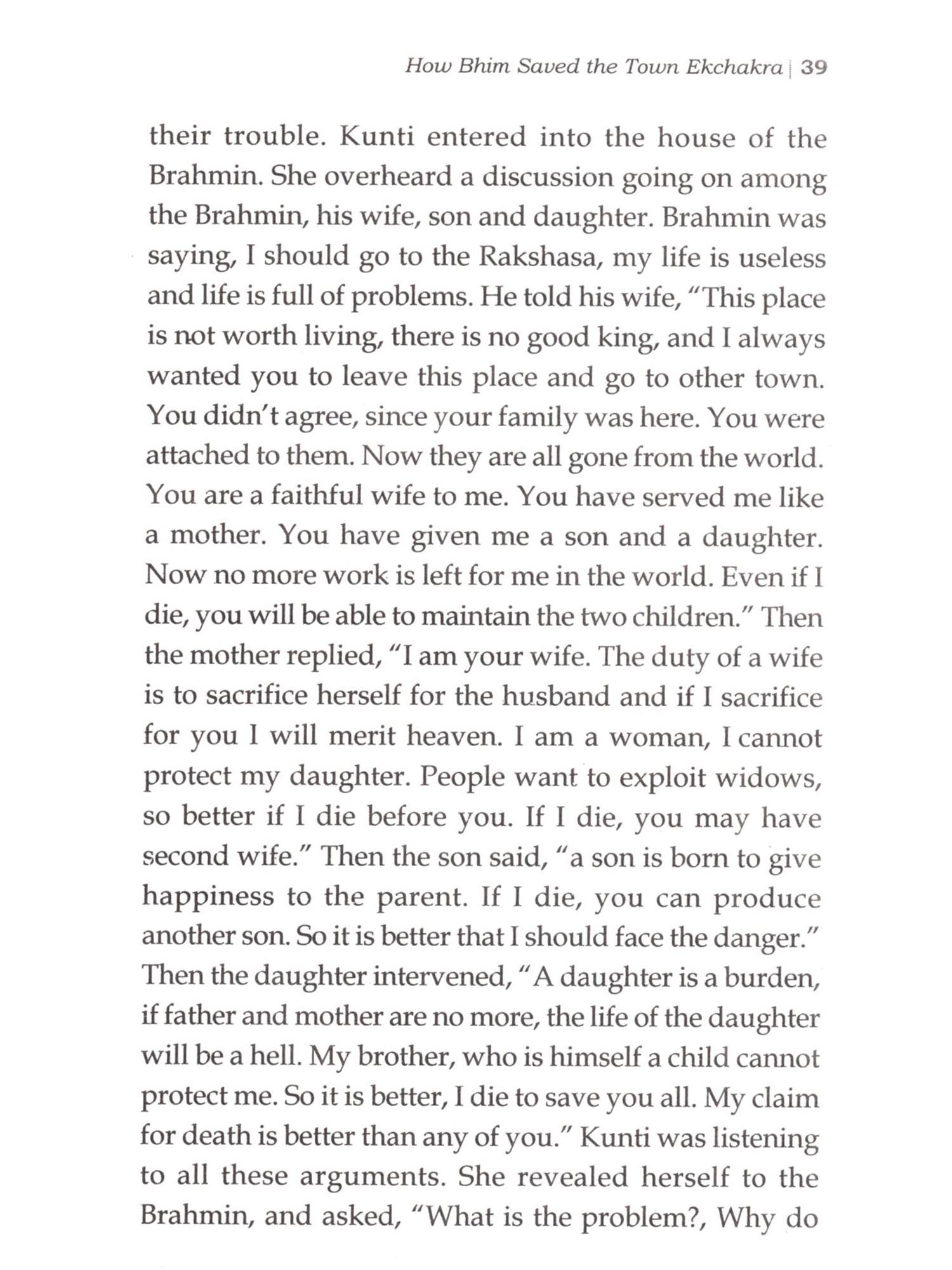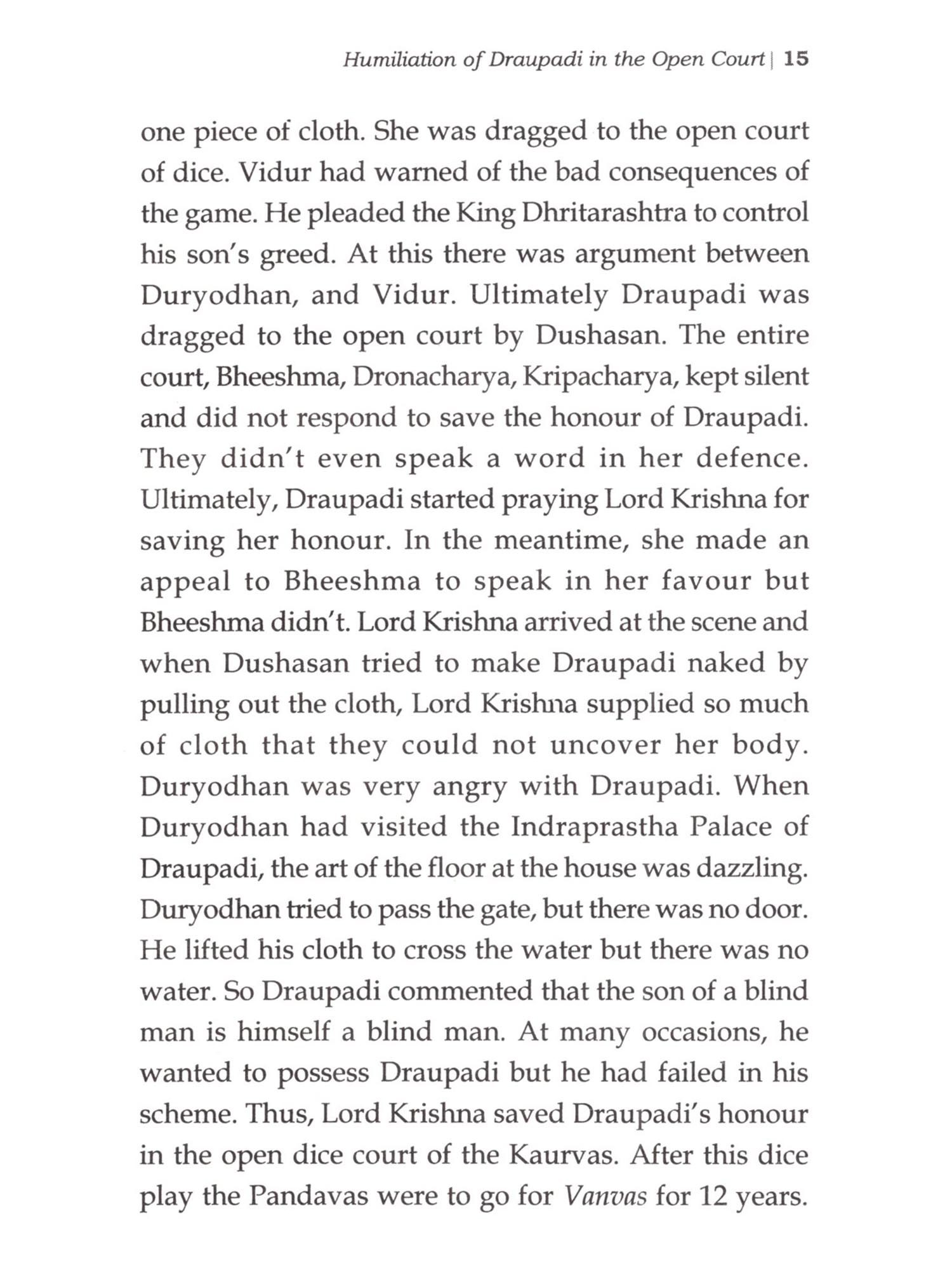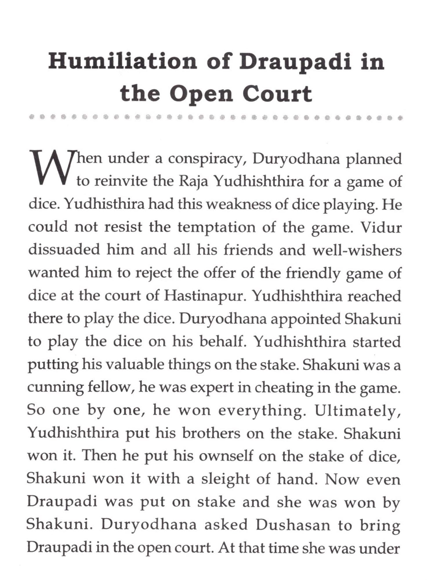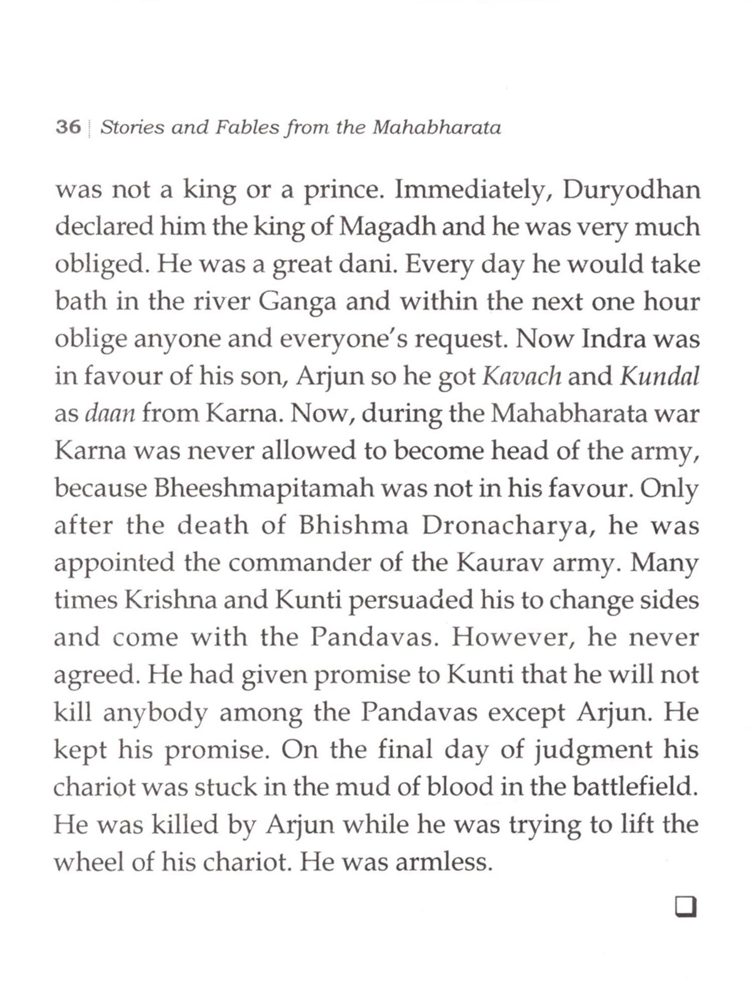 To The Mahabharata is the "book of books". It is an encyclopedia of ancient Bharat (India). That is why it is said, "What is not in the Mahabharata is not in Bharat (India)". Expanse and depth of thoughts and ideas in this book are bewildering. The highest and lowest of human nature are painted in glowing colors. The stories of gods, men, demons, birds, beasts, insects and plants are spread on a big canvas. Conflicts of emotions and call of duty, the wisdom and foolishness of human endeavors described in the Mahabharata, stun the readers. The variety of characters and situations are perennial source of inspiration for politicians, poets, writers and scholars. Even for saints and sages. The Mahabharata is full of interesting and instructive fables. Much before the Aesop's fables, and the Panchtantras, the Mahabharata presented gems of political, diplomatic and humanitarian thoughts and ideas through the fables. They are used to impart valuable ethical and social lessons. The fables from the Mahabharata provide us practical knowledge and also elevate as to higher ethical standards.