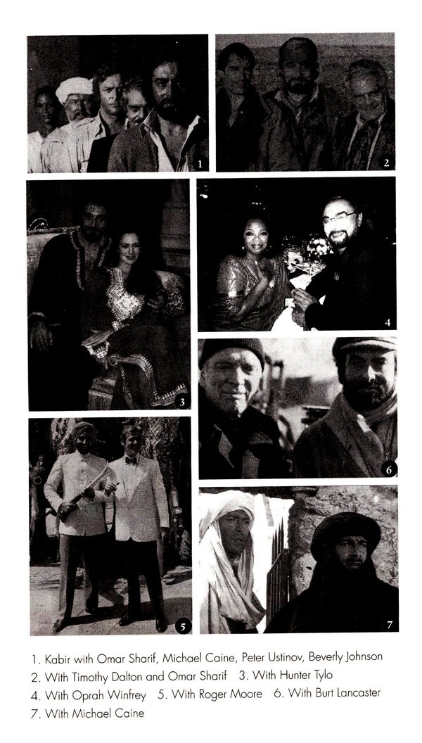 Kabir's credits include starring with Michael Caine in Ashanti and Roddy McDowall in Thief of Baghdad, and playing the title role in the Italian film The Black Pirate (II Corsaro Nero). On American television, he has acted in Highlander, Murder She Wrote, Magnum, P.I., Dynasty and many HBO mini-series. On stage, he starred in John Murrell's Taj at the Luminato Festival in Canada, and M.M. Kaye's The Far Pavilions in London's West End. In India, he has done close to seventy Bollywood films, famously starring with Rekha in Khoon Bhari Maang .