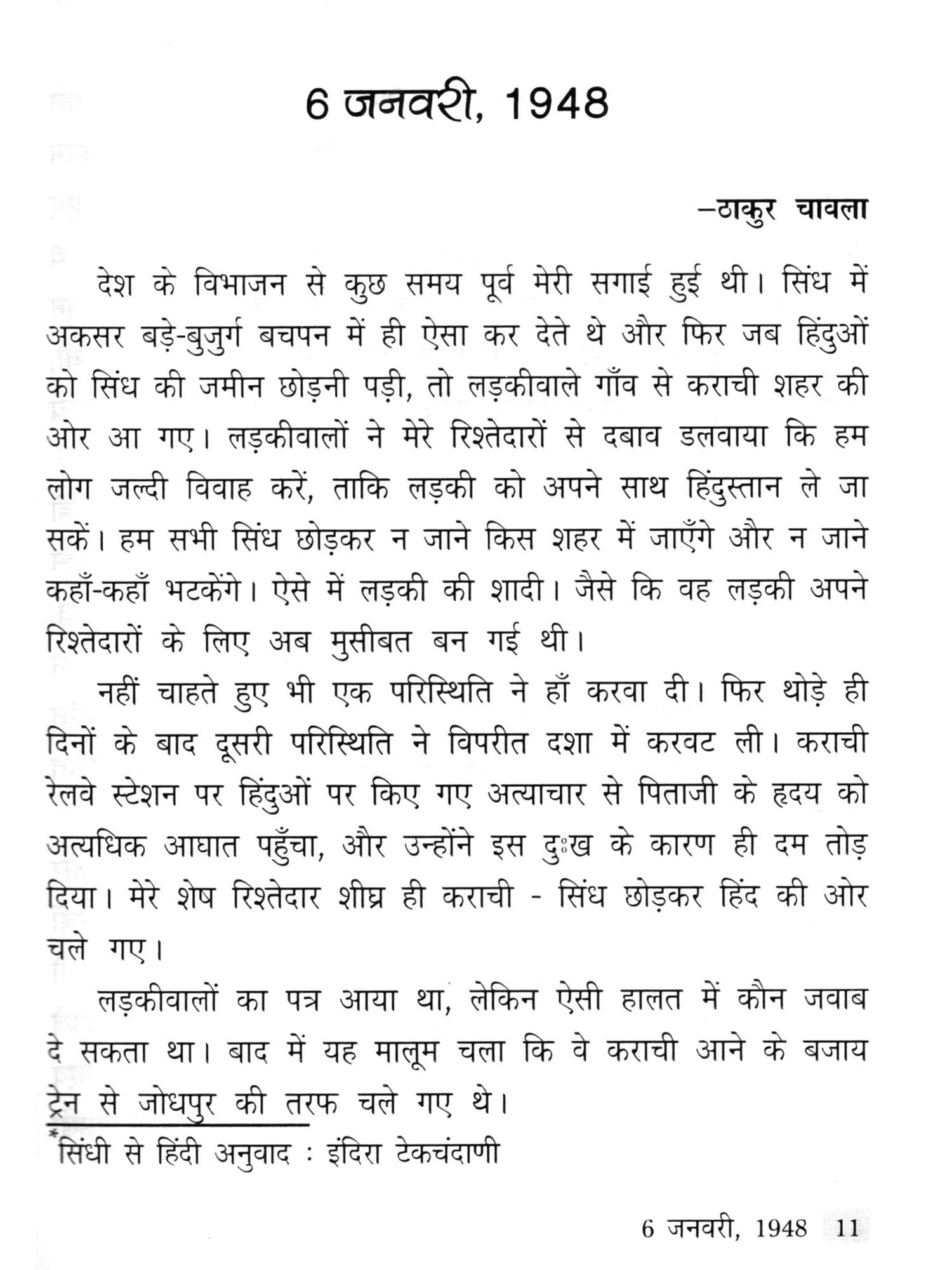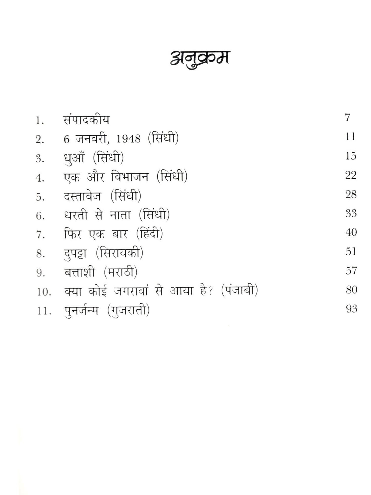 6 जनवरी 1948' शीर्षक से लिखी गई कहानी विभाजन के उपरांत उत्पन्न हुई अव्यवस्था की परतें खोलती है। कराची सिंध में घटी लूटमार की घटना का चित्र खींचती है। 'धुआं' कहानी 6 जनवरी 1948 की घटना को विस्तार देती है। मारकाट में तन के साथ-साथ मन भी घायल होता है। हिंदू-मुस्लिम के मध्य घृणा भाव बढ़ता है। हिंदू मुस्लिम संबंधों पर मनोवैज्ञानिक पक्ष को प्रदर्शित करती कहानी है धुआं। 'एक और विभाजन' कहानी में विस्थापन के दौरान सिंघ से हिंद की कठिन यात्रा करते समय हिंदू परिवार के बालक के बिछोह के दर्द का चित्रण किया गया है, बालक के खोजने का माता, पिता, चाचा के द्वारा किया गया जतन असफल रहता है।