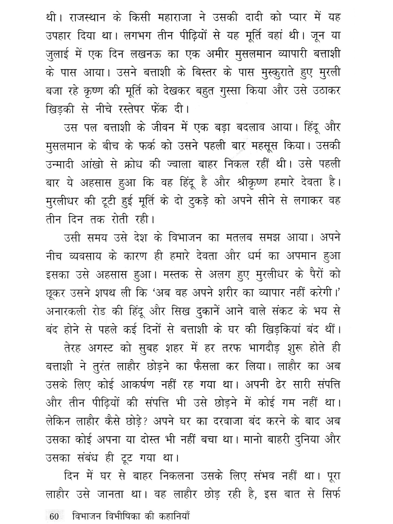 विभाजन विभीषिका की कहानियों में ऐसी ही मन की बातों को उद्धृत किया गया है। देश-काल, वातावरण, परिस्थिति के चित्रों को चित्रित किया गया है। हिंदी, सिंधी, पंजाबी, मराठी, गुजराती, सिराइकी, बांग्ला भाषा में लिखी गई कहानियों की कथावस्तु में एक तरफ चीख, खून, बलात्कार, बिछोह, विस्थापन, प्रव्रजन की पीड़ा प्रदर्शित की गई है तो दूसरी ओर अपने जन्म स्थान की गलियों, मोहल्लों, खेतों, खलिहानों, दोस्तों यारों के साथ बिताए पलों के रेखाचित्र अंकित किए गए हैं।