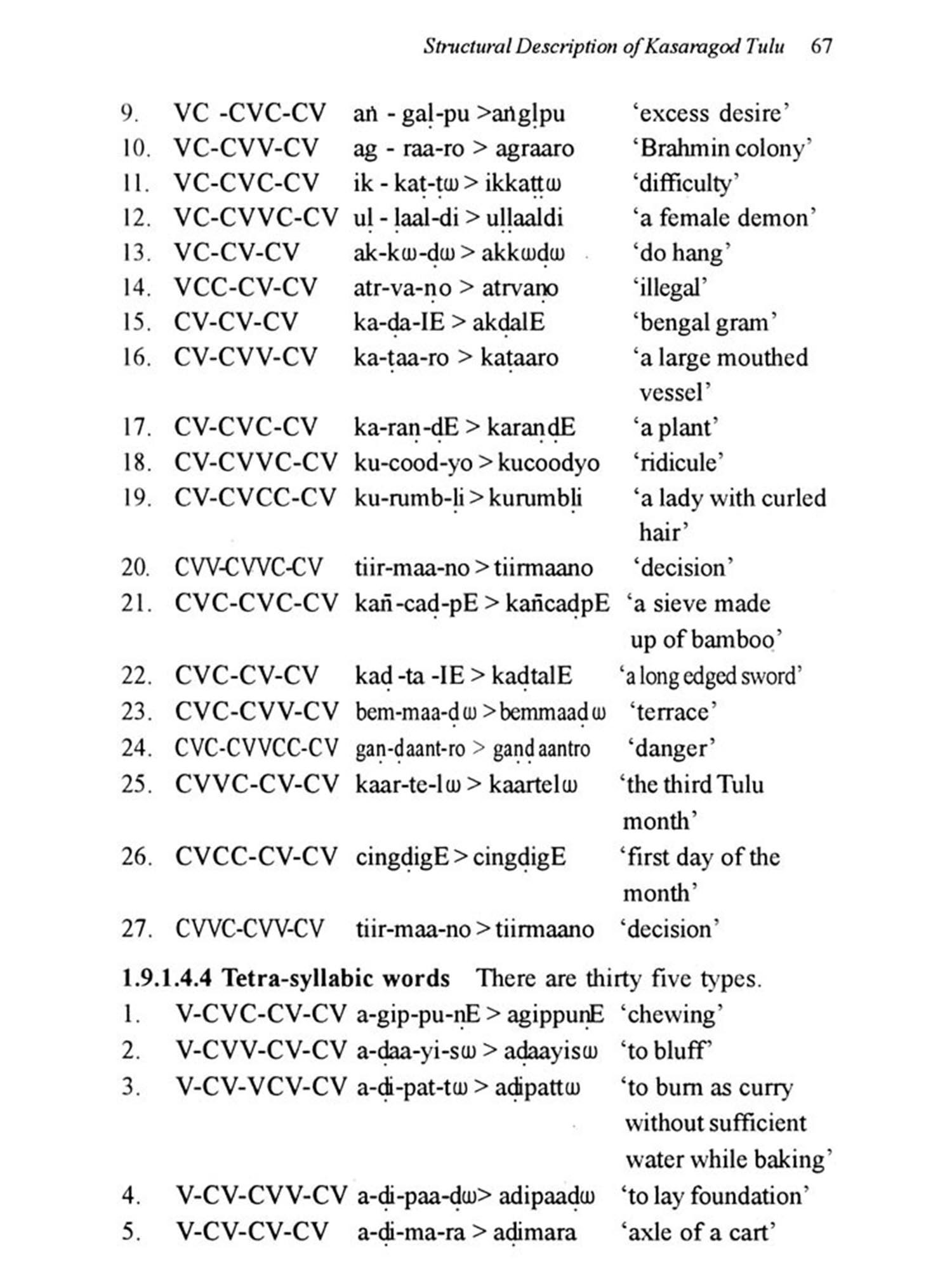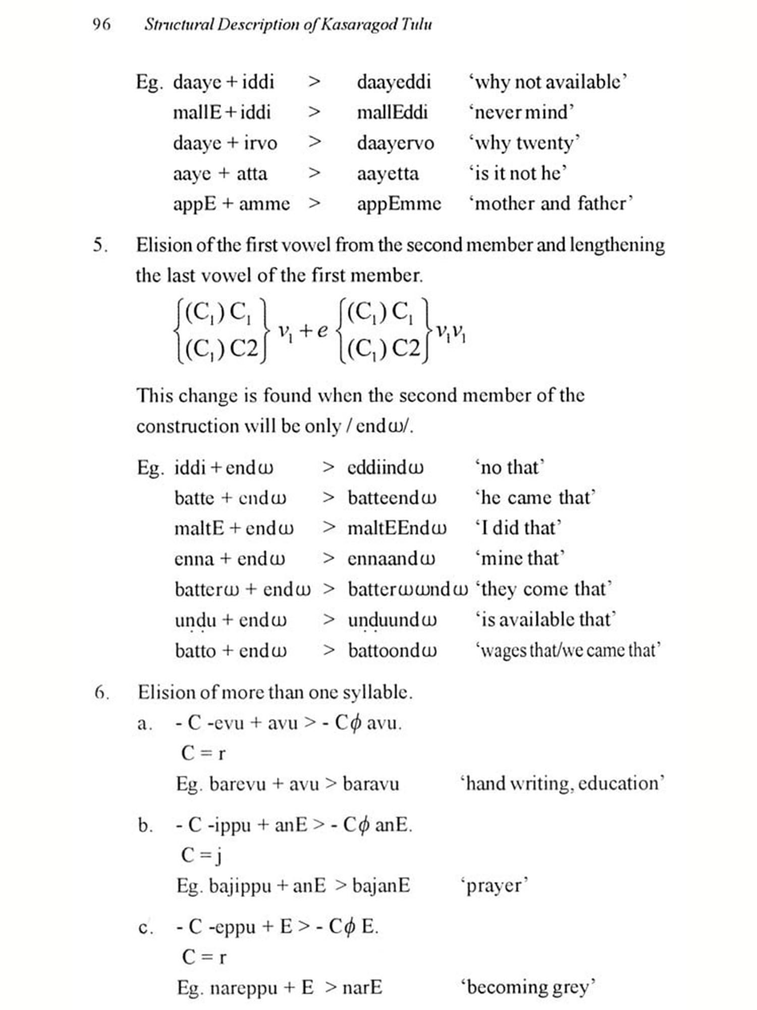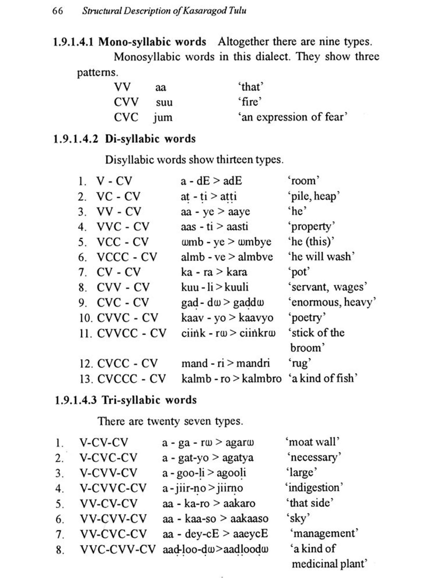 This book provides sufficient information on the dialect area and also on the grammatical structure of the Tulu dialect spoken by the non-Brahmin communities of Kasaragod region. The sample text and vocabulary provided in this book will be of immense help to pursue further research on Dravidian syntax and also for comparative studies.