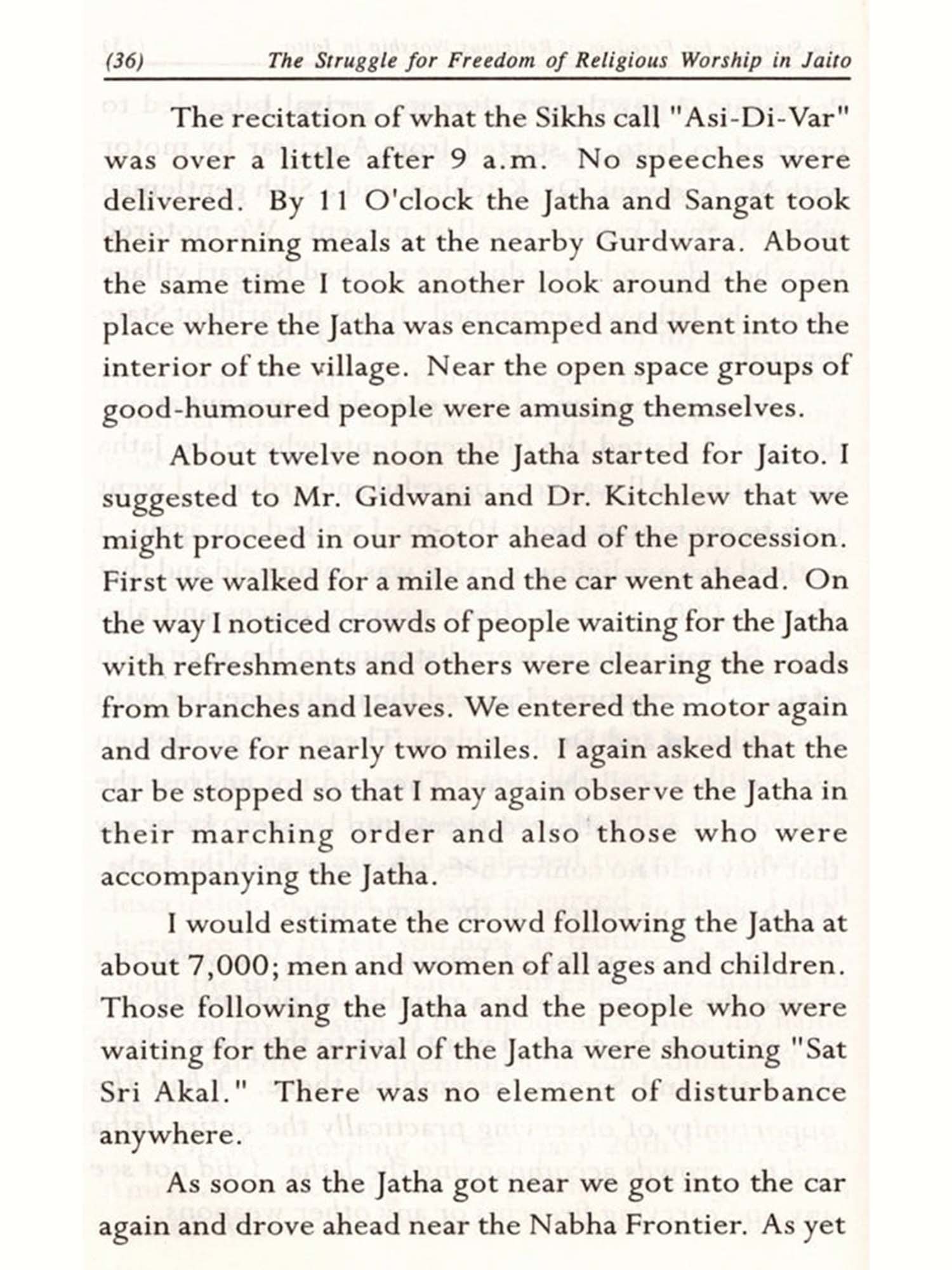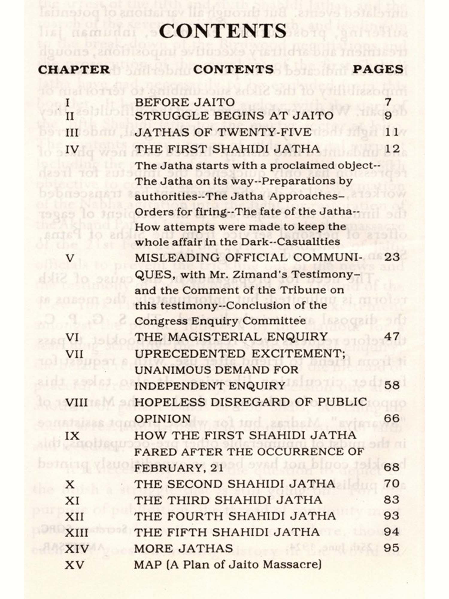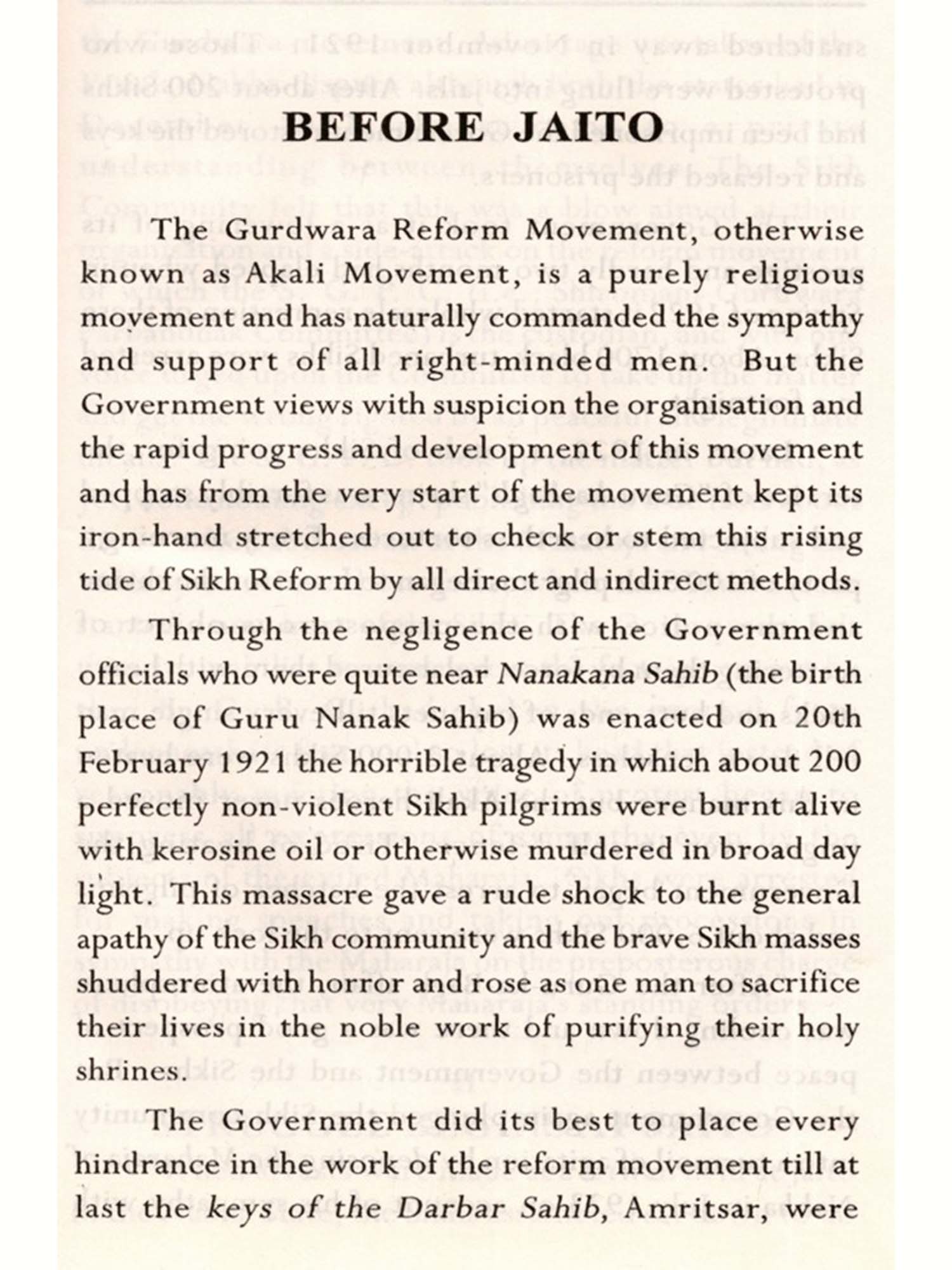 The Jaito struggle has had a career, beset with many ordeals and much martyrdom for the Sikhs. The details of the struggle have come up to public notice in press reports as they occurred from time to time. The attempt is made in the succeeding pages to piece them together in booklet form with a view to present a connected version capable of easy reference. In the following pages, only, revelations of first-hand authenticity have been included; nothing has been taken for granted; and the material published is drawn from the reports of actual sufferers or respectable eye-witnesses mainly of the moderate persuasion. The aim kept in view has been to eschew all tendency to advocacy one way or the other, and present the bare facts in their true sequence, leaving the reader to his own resources of judgement for the formation of independent opinion.