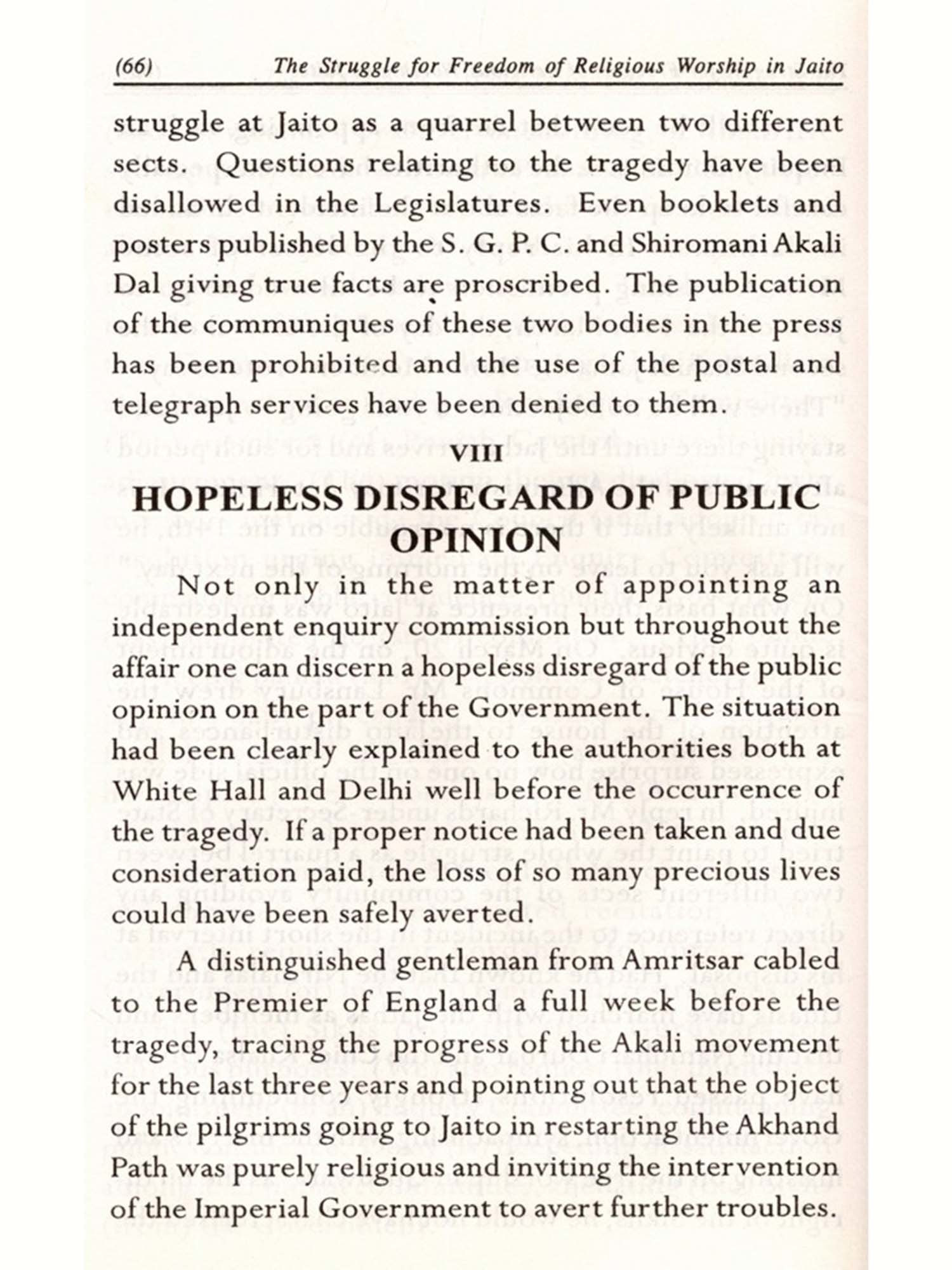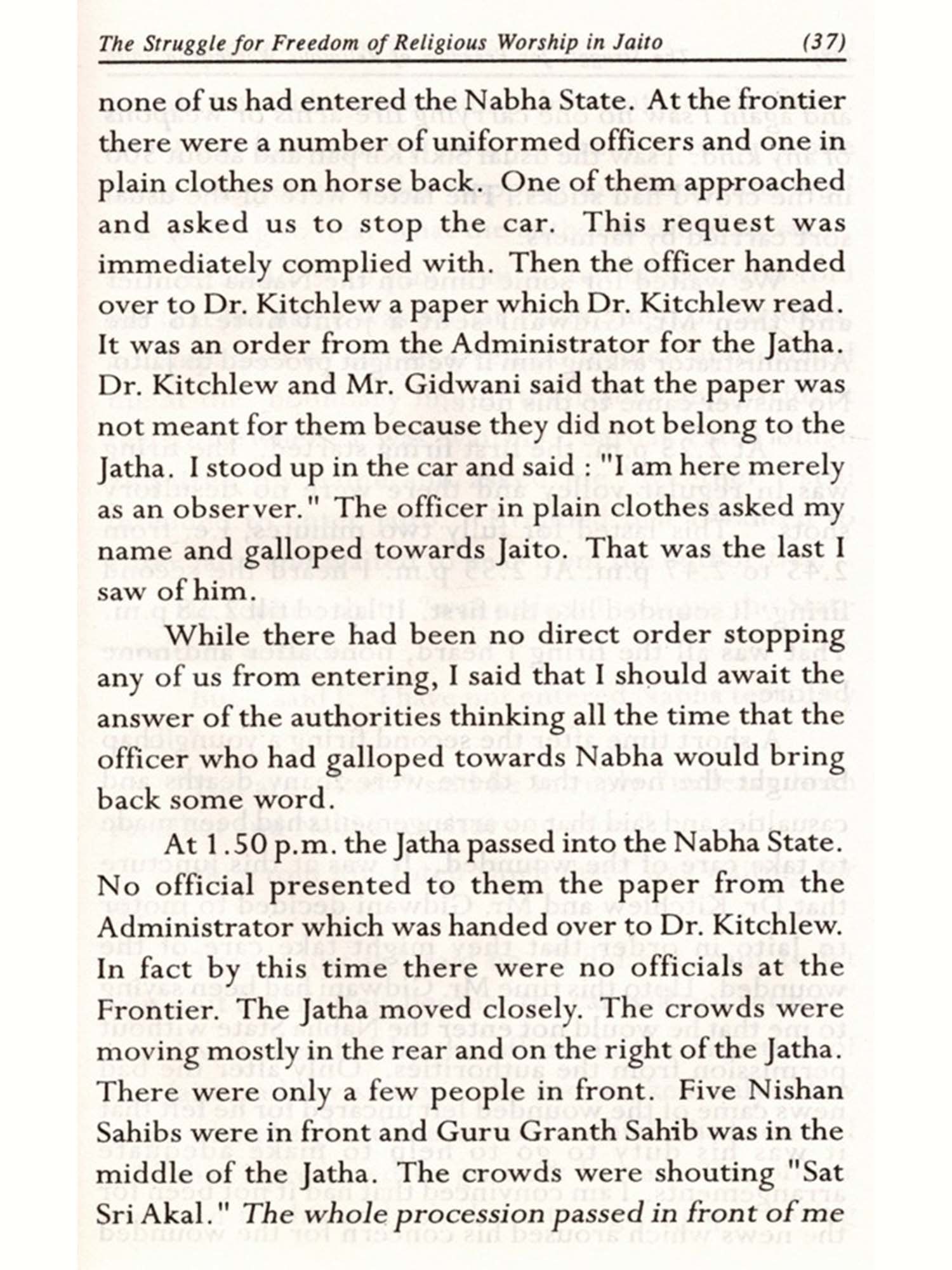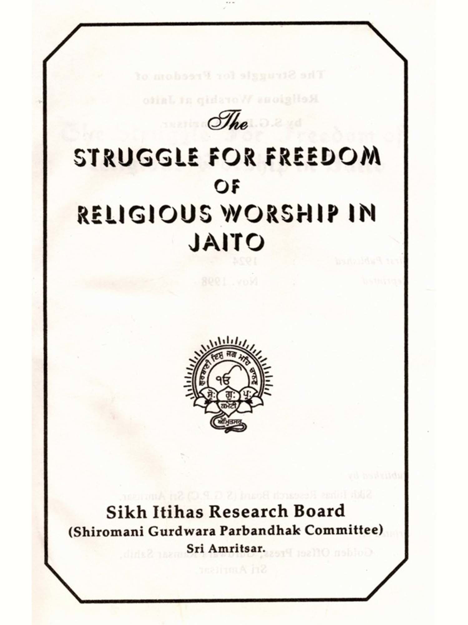 The Jaito struggle has had a career, beset with many ordeals and much martyrdom for the Sikhs. The details of the struggle have come up to public notice in press reports as they occurred from time to time. The attempt is made in the succeeding pages to piece them together in booklet form with a view to present a connected version capable of easy reference. In the following pages, only, revelations of first-hand authenticity have been included; nothing has been taken for granted; and the material published is drawn from the reports of actual sufferers or respectable eye-witnesses mainly of the moderate persuasion. The aim kept in view has been to eschew all tendency to advocacy one way or the other, and present the bare facts in their true sequence, leaving the reader to his own resources of judgement for the formation of independent opinion.