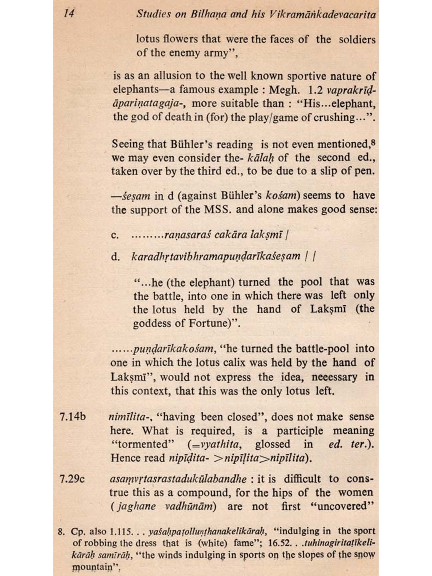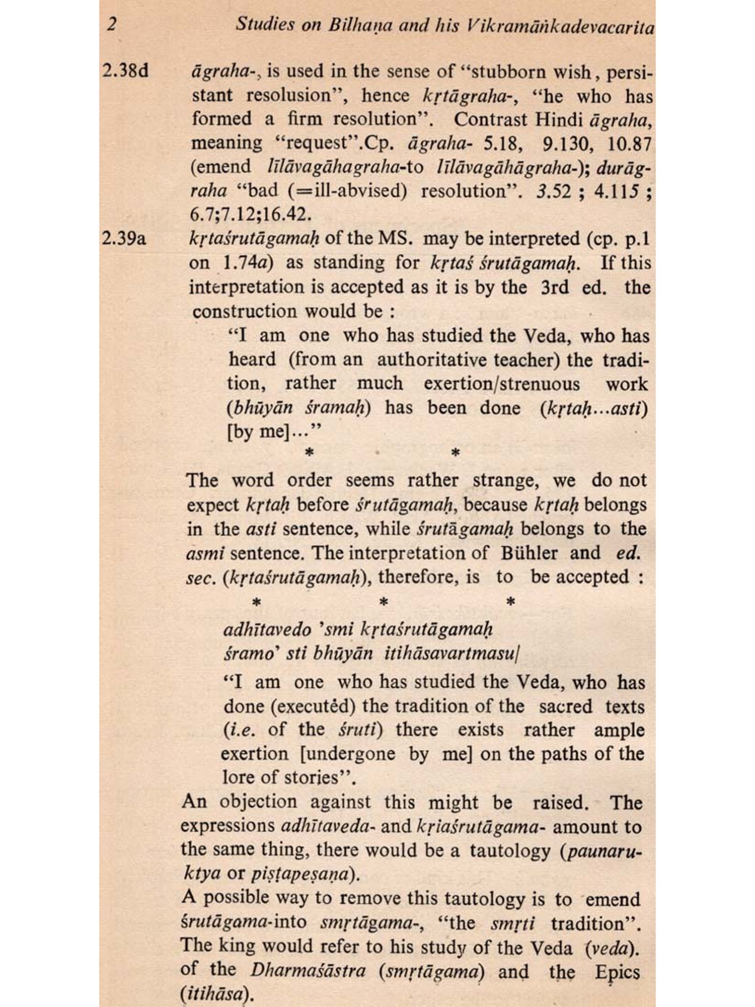 It is hoped that the treatment of certain lexicographical items in Chapter II, will not only help the understanding and interpretation of Bilhaņa, but will be welcome as a small contri-bution to the history of the Sanskrit vocabulary in the late Middle Ages. Now-a-days it will generally be accepted that the usage of individual poets is more differentiated than commen taries that rely exclusively on works like Amarakoša or even the PW. make us realize.