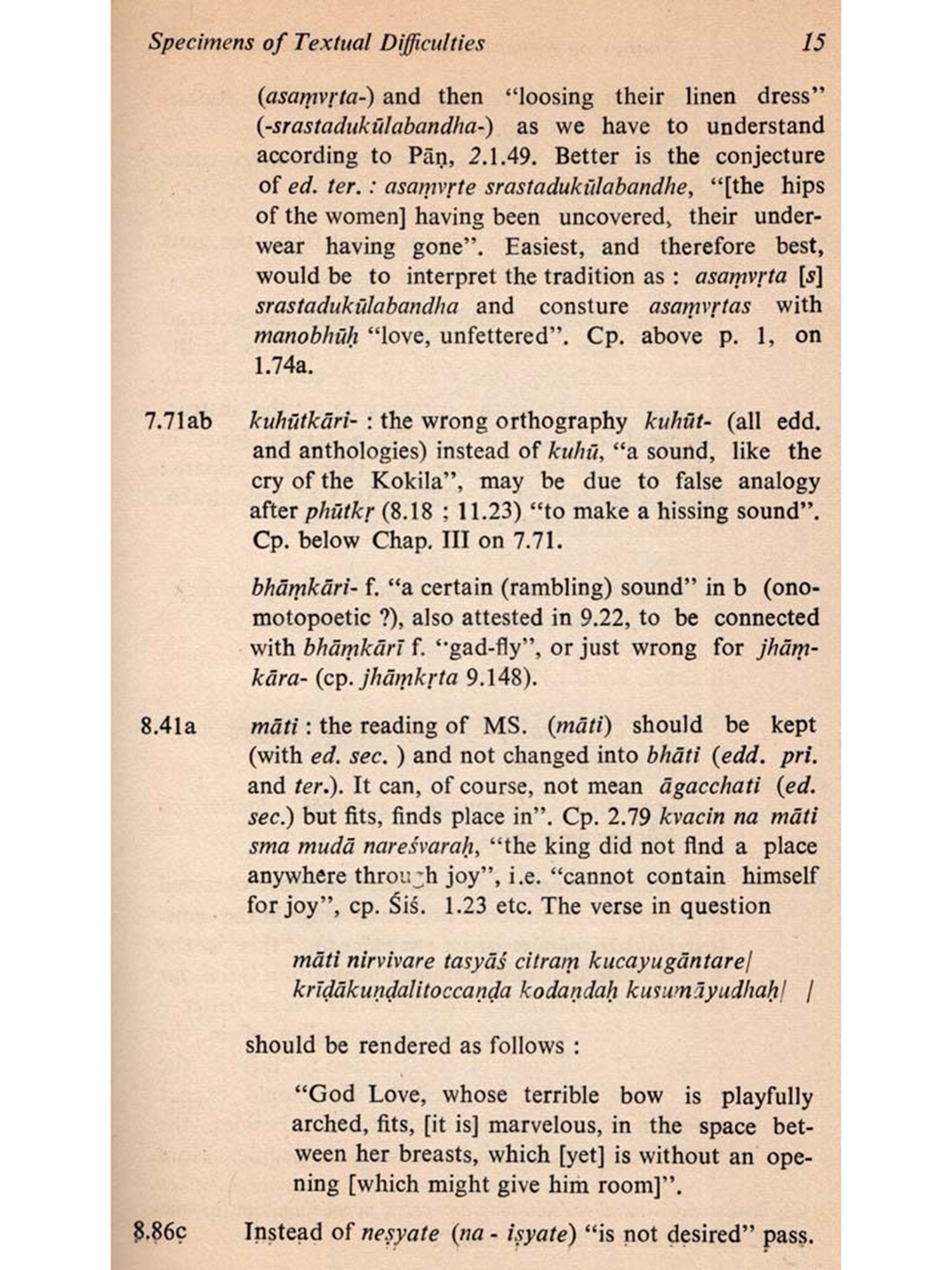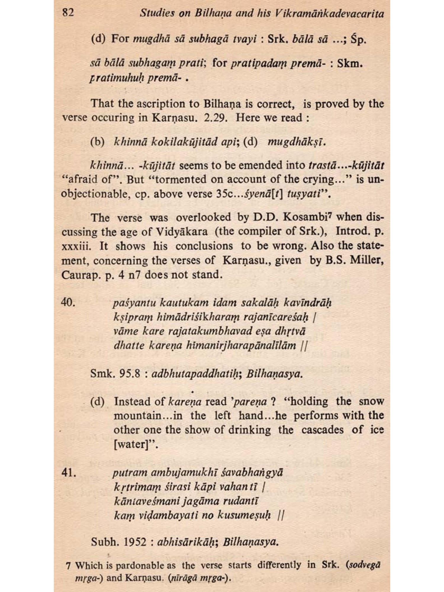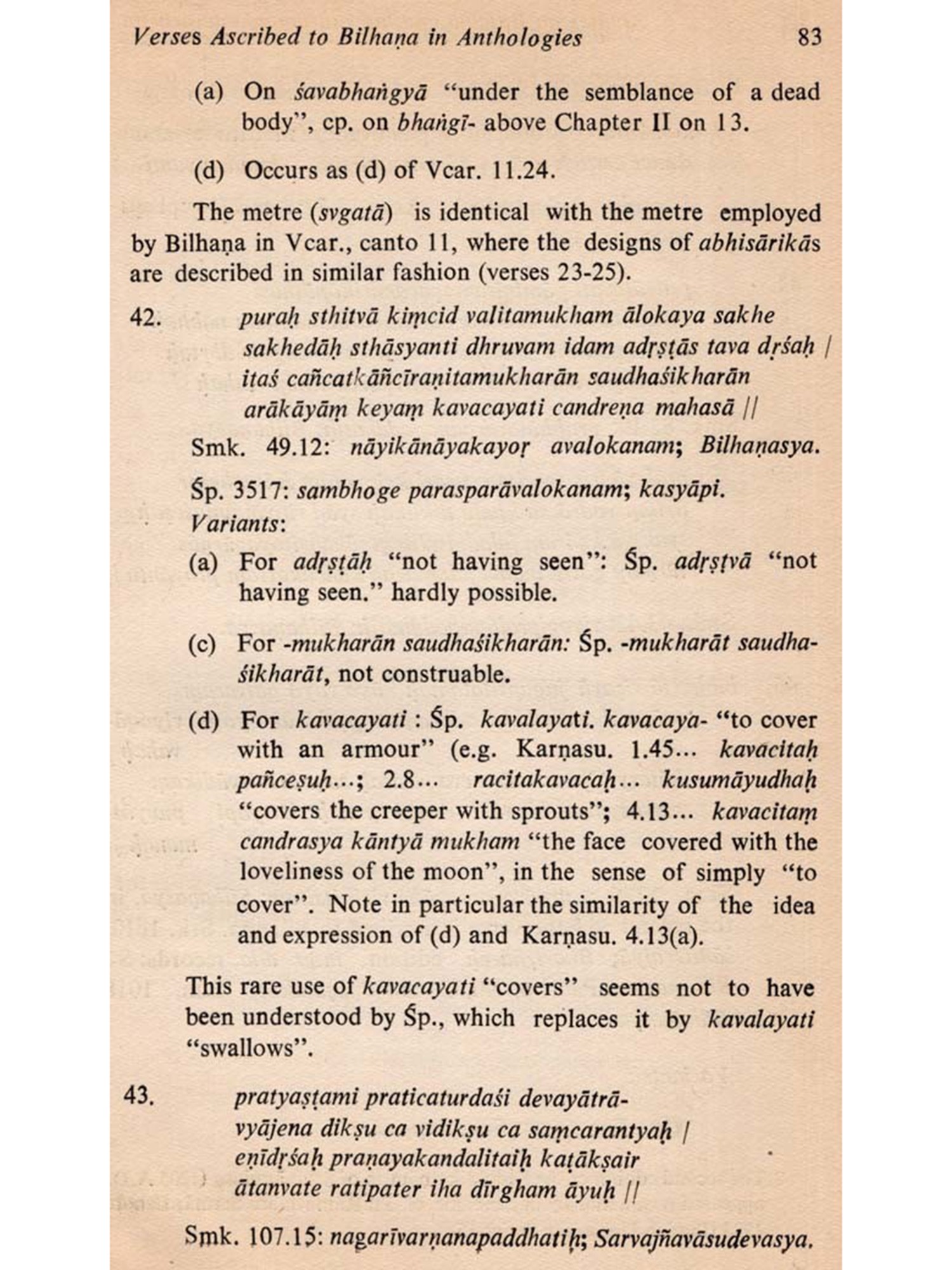 The secondary source material, dealt with in Chapter III, comprises a quantum of quotations from Vcar. in the five important Subhāşita-s, viz. Subhāşitaratnakośa (Srk.); Sadukti-karaņāmṛta (Skm.), Süktimuktāvalī (Smk.), Śārńgadharapad-dhati (Sp.) and Subhāṣitāvalī (Subh.). As far as can be made out, the readings of the anthologies are inferior or deliberate changes (cp. e.g. on 16.2). In fact the readings offered by the anthologies can hardly help us to correct the MS. readings. An exception may be formed by 8.37c; 8.71d and 16.51c. Some readings in the anthologies are due to the distinct intention of rendering a given verse a more general application (cp. on 16.44, 51, 52; 17.11, 12). Curiously enough, some of Bilhana's verses are quoted in anthologies anonymously. These are marked in the table of concordance of quotations on pp.65-68.