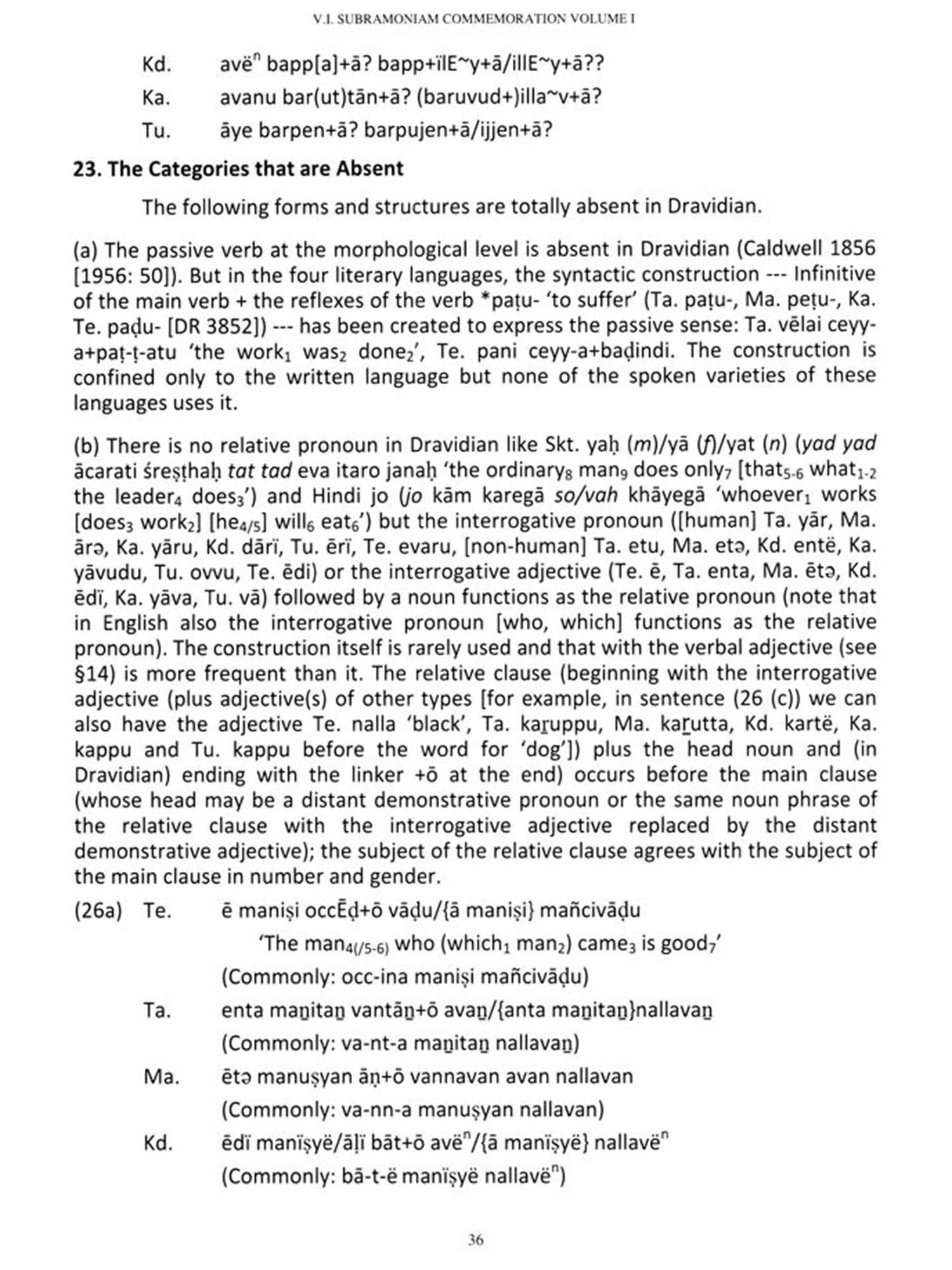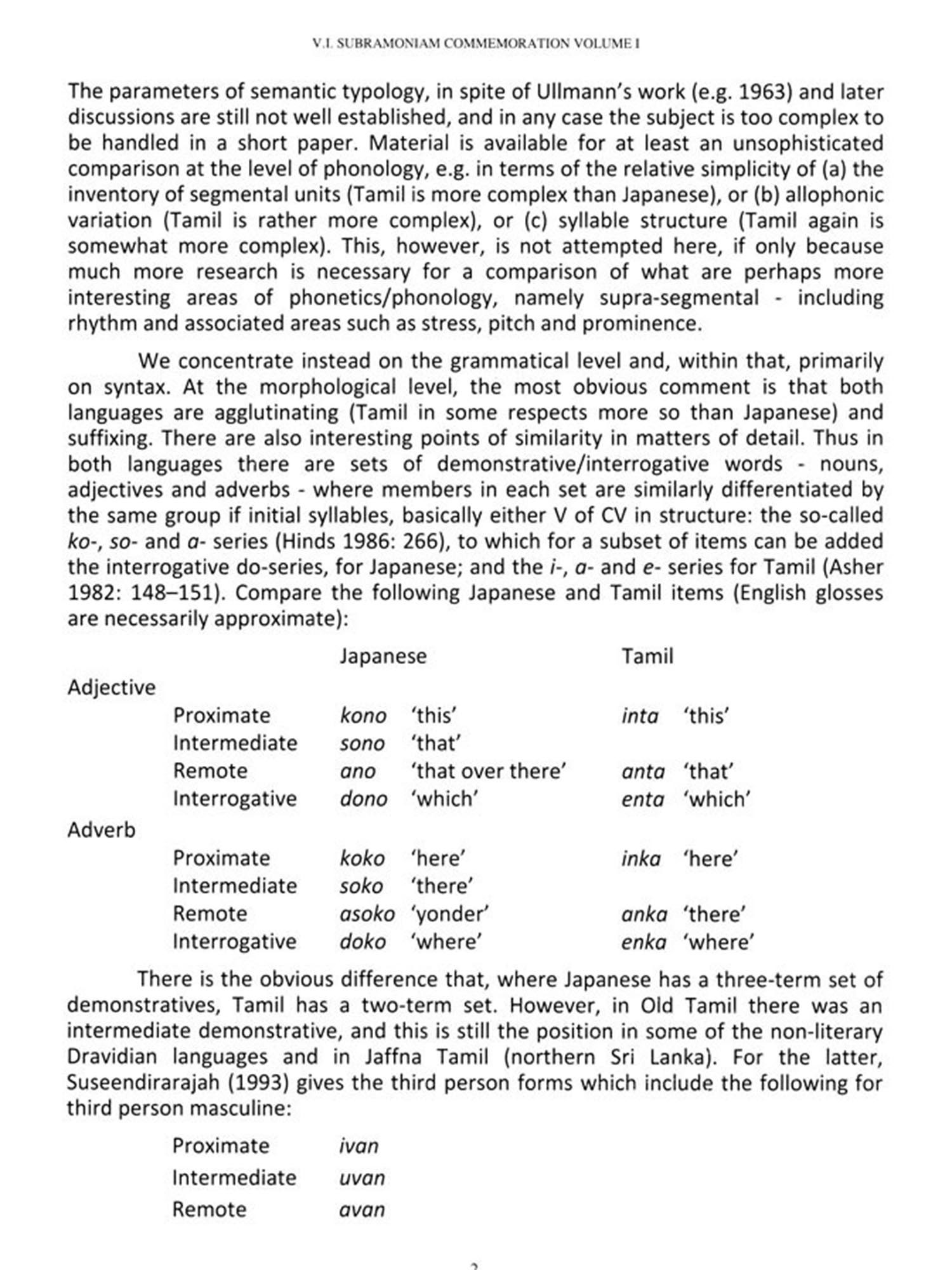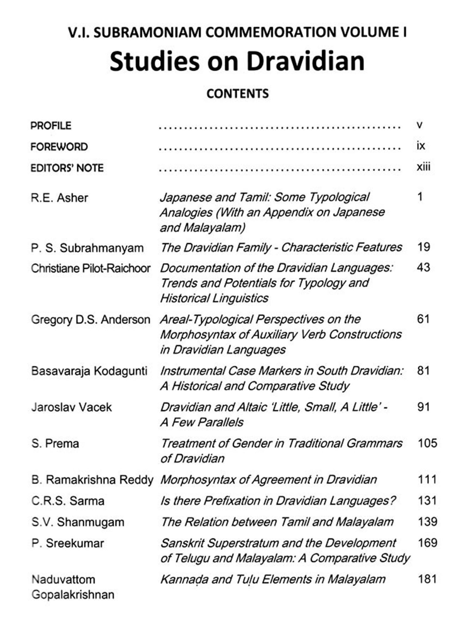 It is with great pride and pleasure that we publish the V.I.S. Commemoration Volume I and Volume II in honour of the late Prof. V.I. Subramoniam. The contributions of Prof. V.I. Subramoniam to Dravidian studies in general and to Dravidian linguistics in particular are invaluable. Being a versatile scholar and innovative researcher, he had a clear vision on the neglected areas of research in linguistics and interrelated disciplines such as cultural studies, folkloristics, anthropology etc.