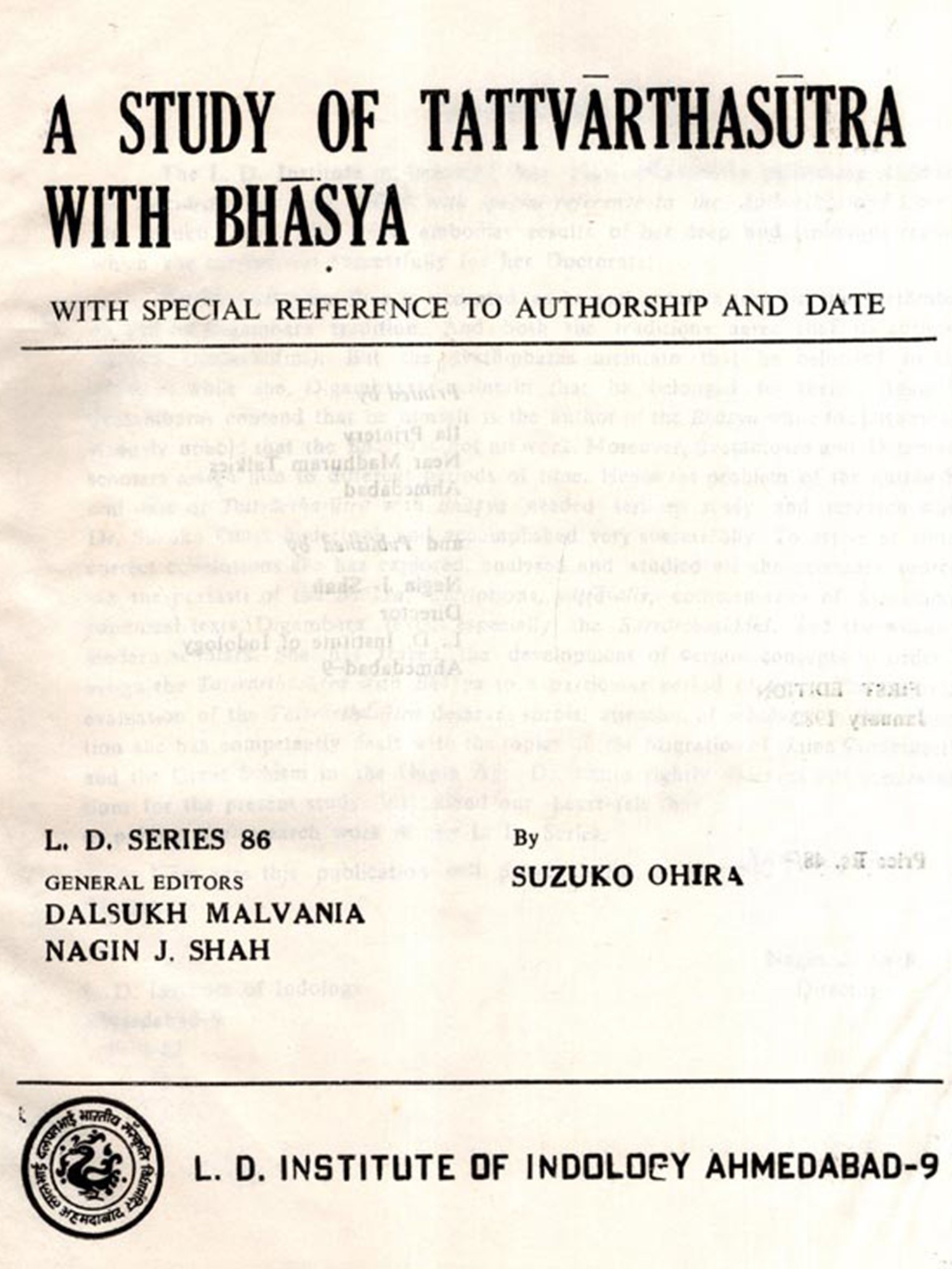 The L. D. Institute of Indology has great pleasure in publishing A study of the Tattvarthasutra with Bhasya with special reference to the Authorship and Date by Dr. Suzuko Ohira. The work embodies results of her deep and strenuous research which she carried out successfully for her Doctorate.