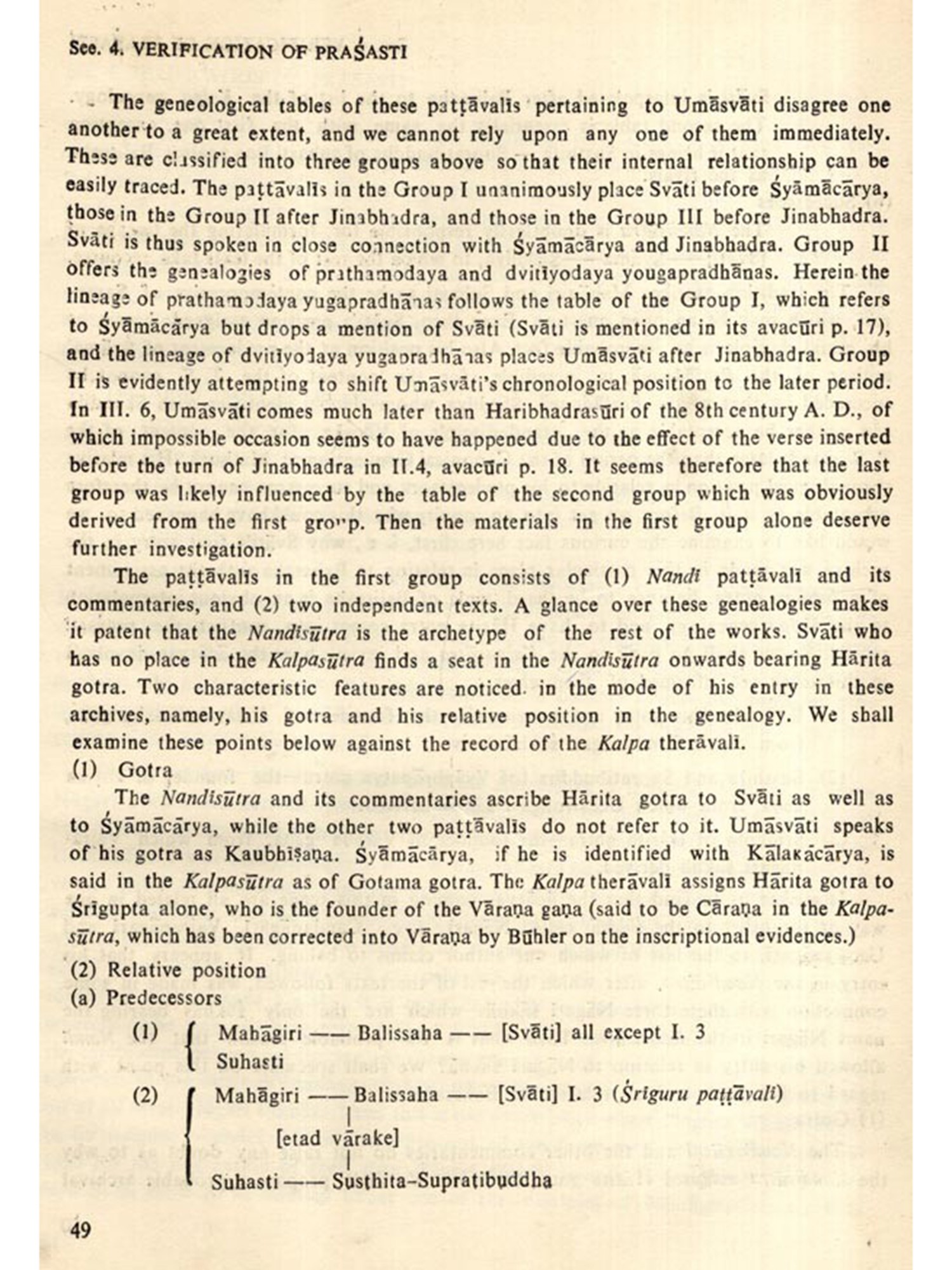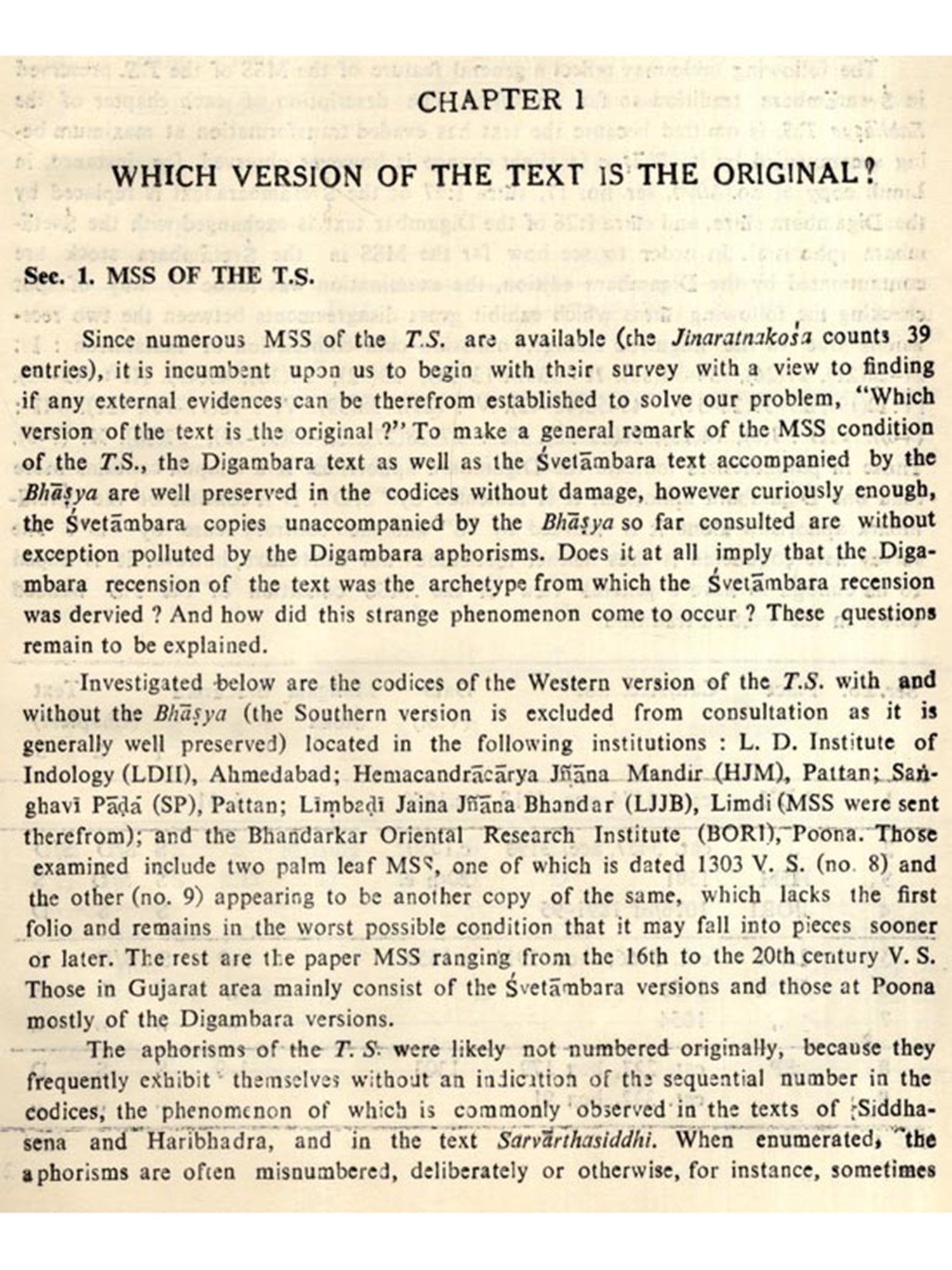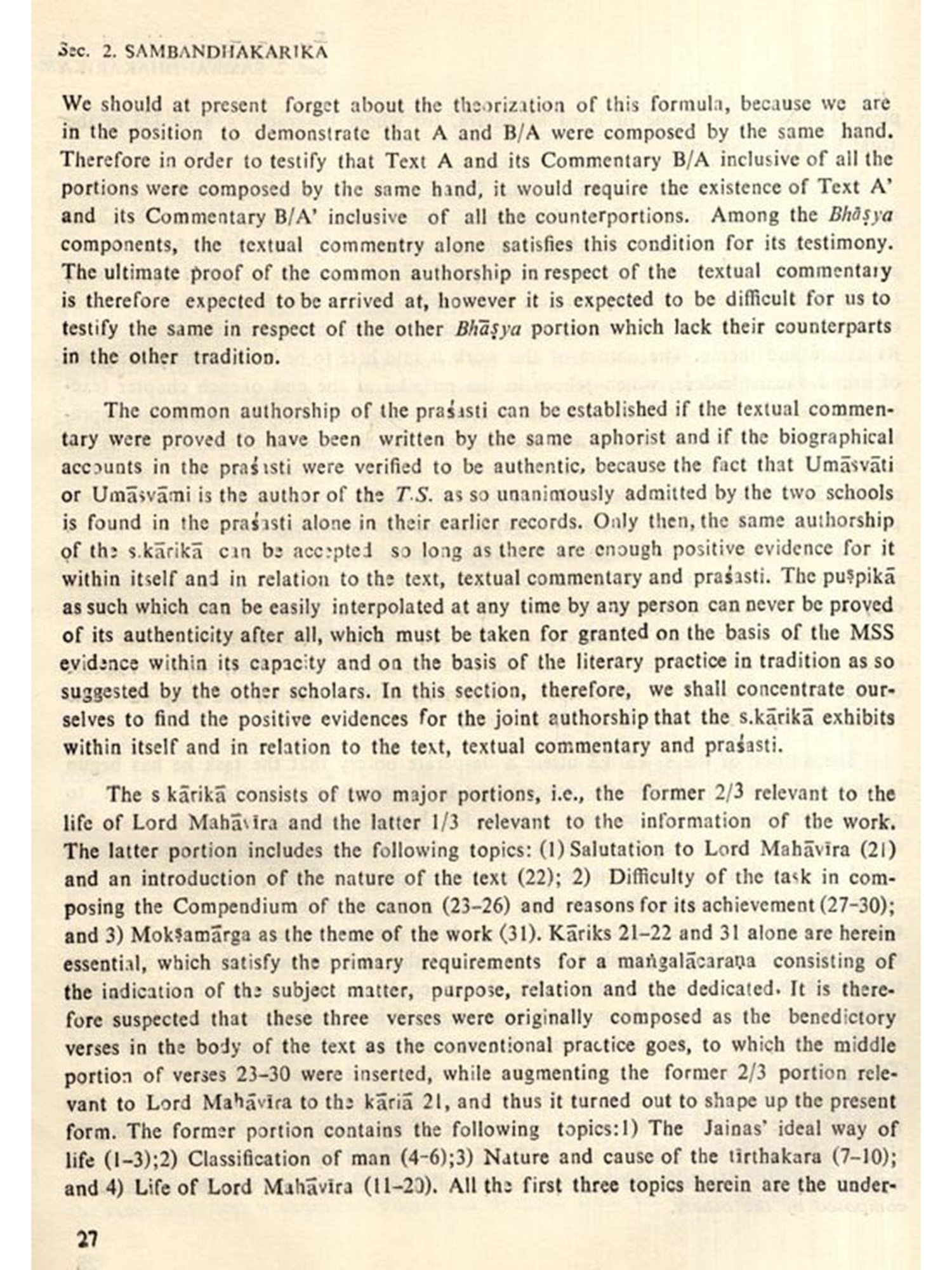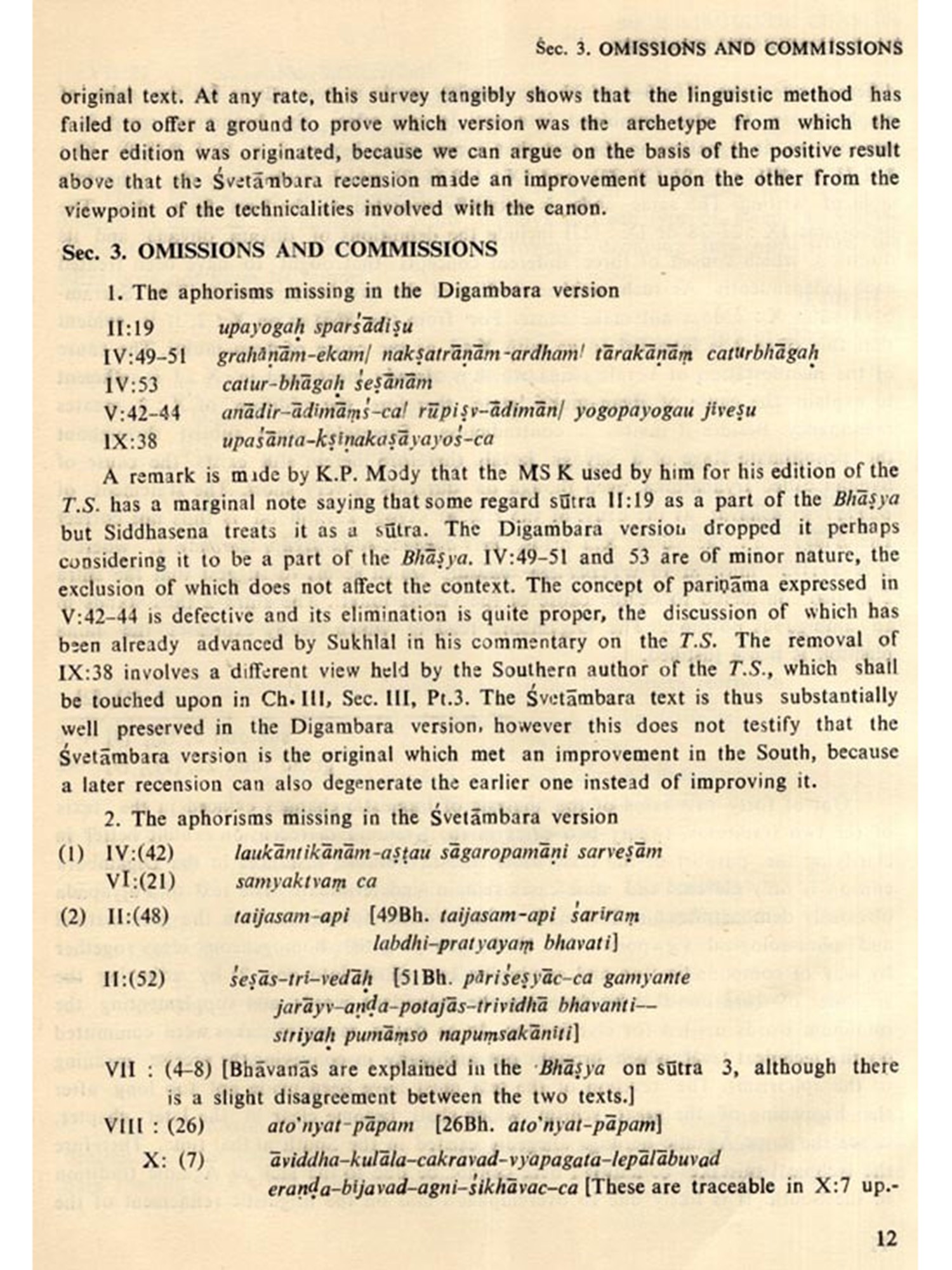 The assignment of this thesis is to testify whether or not the T. S. accompanied by its Svopojnabhasya was composed by Umasvati. This issue is somewhat odd in a way, because a mention that Umasvati or Umasvami is the author of the T. S. which is unanimously accepted by the two sects is found in the prasasti of the Bhasya alone in the earlier literature of both traditions. However, the Digambara Version lacks the entire Bhasya portions, and the abundant epigraphical evidences in the South record that Umasvami alias Grddhapiccha is a Digambara author of the T. S. On the other hand, none of the autobiographical document in the prasasti has been yet proved of its historicity, and no early inscriptional evidence remains in the North and the West to prove that Umasvati belonged to the canonical tradition in the North. The problam thus remains to be investigated. The present-day academic circle is divided into three groups as to which party Umasvati belonged to, i. e., the Agamic tradition which the Svetambaras uphold whole-heartedly, the Digambara tradition which came to compile its own pro-canonical texts, and the Yapaniya tradition which was later absorbed into the Digambara fold and is no more existent. As the codices in the Western stock reveal, the lay Jainas did least bother about nor even distinguished which version of the text belonged to which tradition. This problem was raised and became controversial among the academic circles in this present century when the T. S. study came to attract the scholars' serious attention.