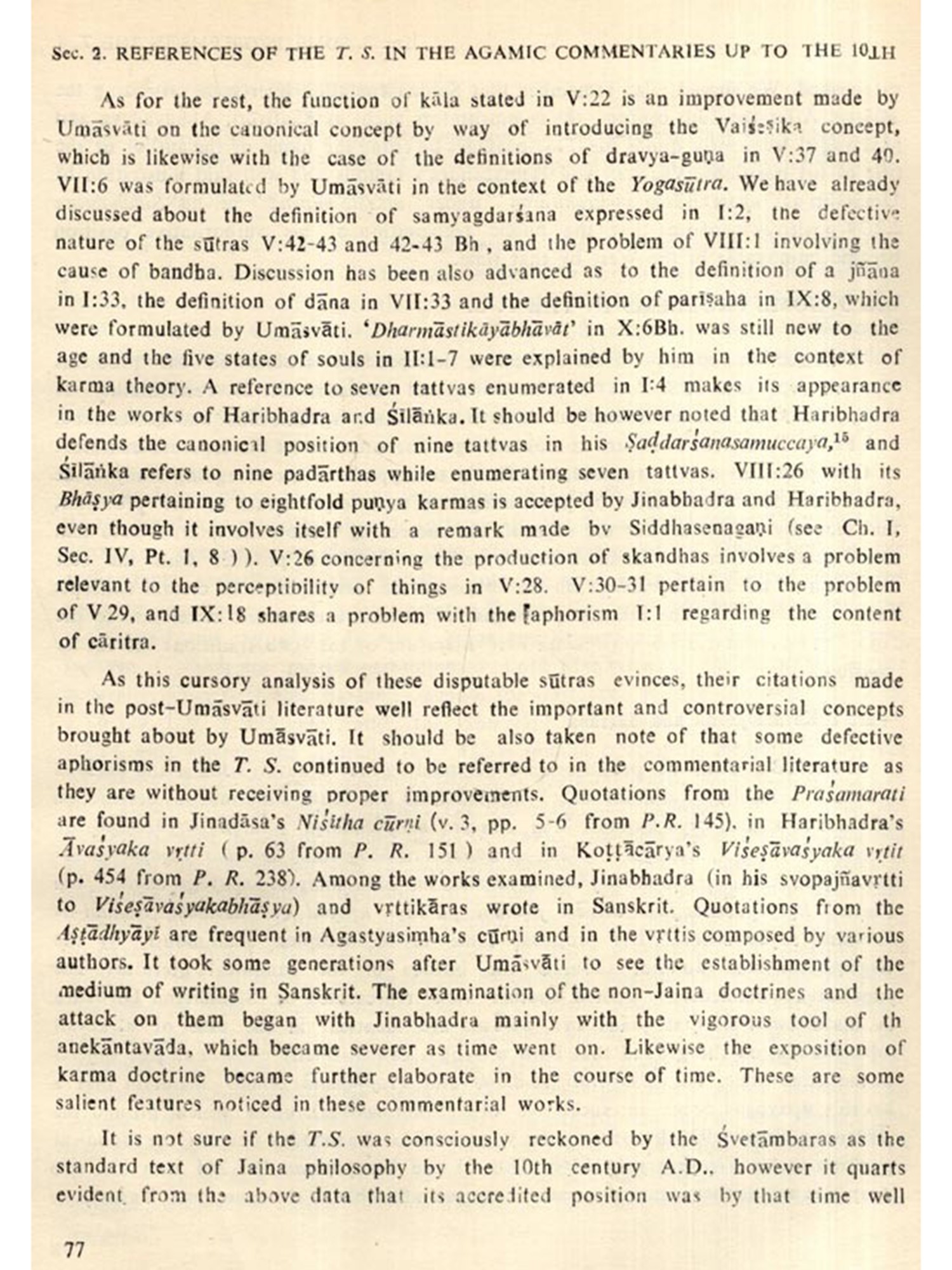 The Tattvarthadhigamasutra (abbreviated hereafter as T. S) of Umasvati holds a unique position in the literary history of the Jainas. Since when it gained an authoritative position in the two traditions, it has occupied the heart of the Jainas, lay or clerical, as the Bible of their religion and as the essential work of their doctrinal axioms. The T. S. is a compendium of the theoretical contents of the canon expressed in terms of seven tattvas, having moksamarga as its guiding theme. This prakaraga in some 350 sutras (the Svetambara Version counts 344 and the Digambara Version 357) along with its Bhasya was composed by Umasvati sometime in the late middle of the 5th century A. D. at Pataliputra, imbibing the current philosophical problems of the non-Jaina systems of thought. The Gupta period to which the author belonged was one of the darkest ages for the Jaimas, wherein the then socio-economic impact forced them 10 migrate from the North to the West and the South, which caused, together with the fatally accidental calamity of a long famine and the consequent call of the Canonical Convention at Valabhi, the division of the Jaina church into the present day Svetambara and Digambara. The T. S. that was carried down by the emigrants to the South met a necessary revision thereby, and established itself as a pro-canonical text of the Digambaras. The present problem of the authorship of the T. S. which is claimed by the two camps has thus cropped up.