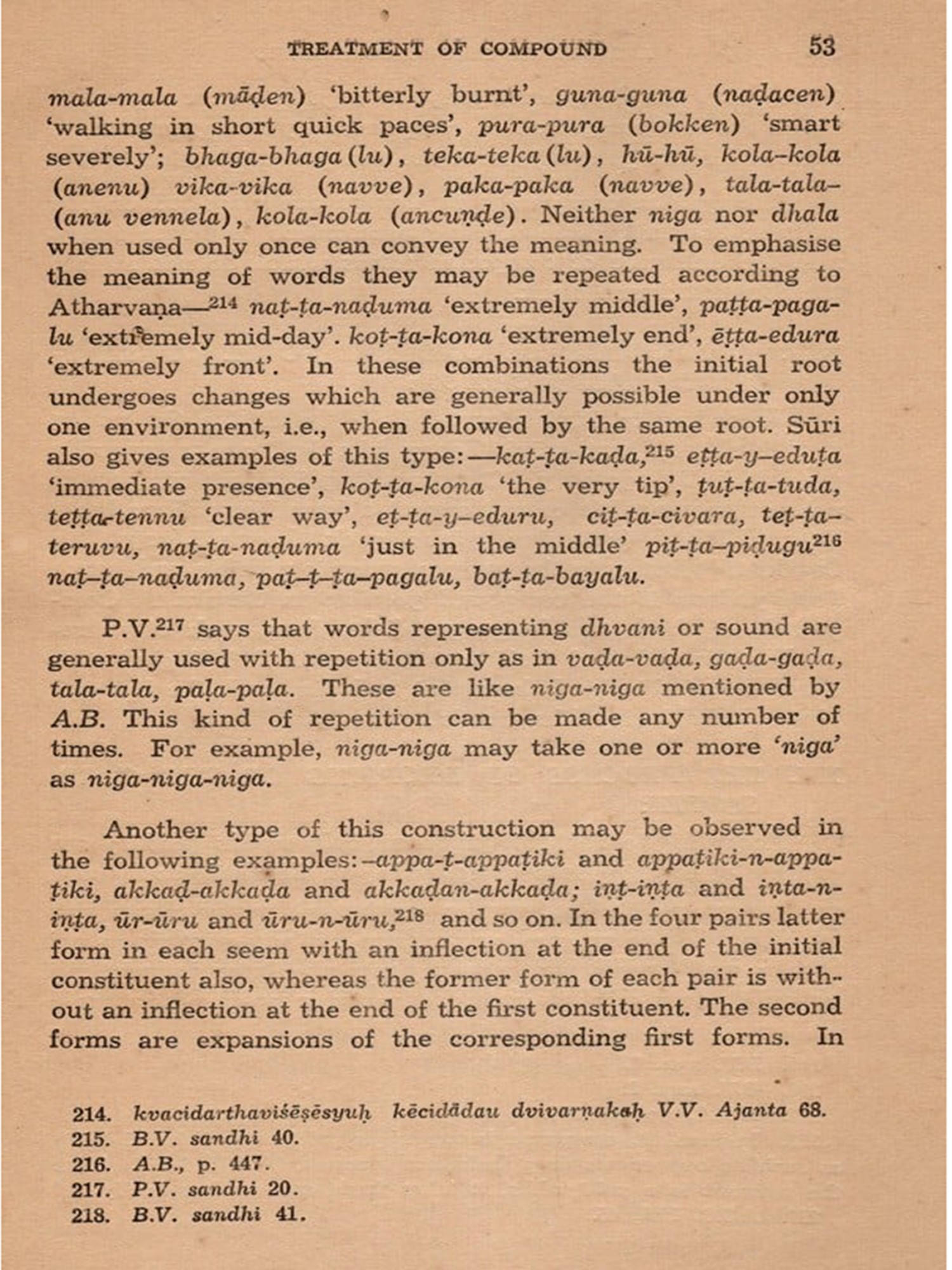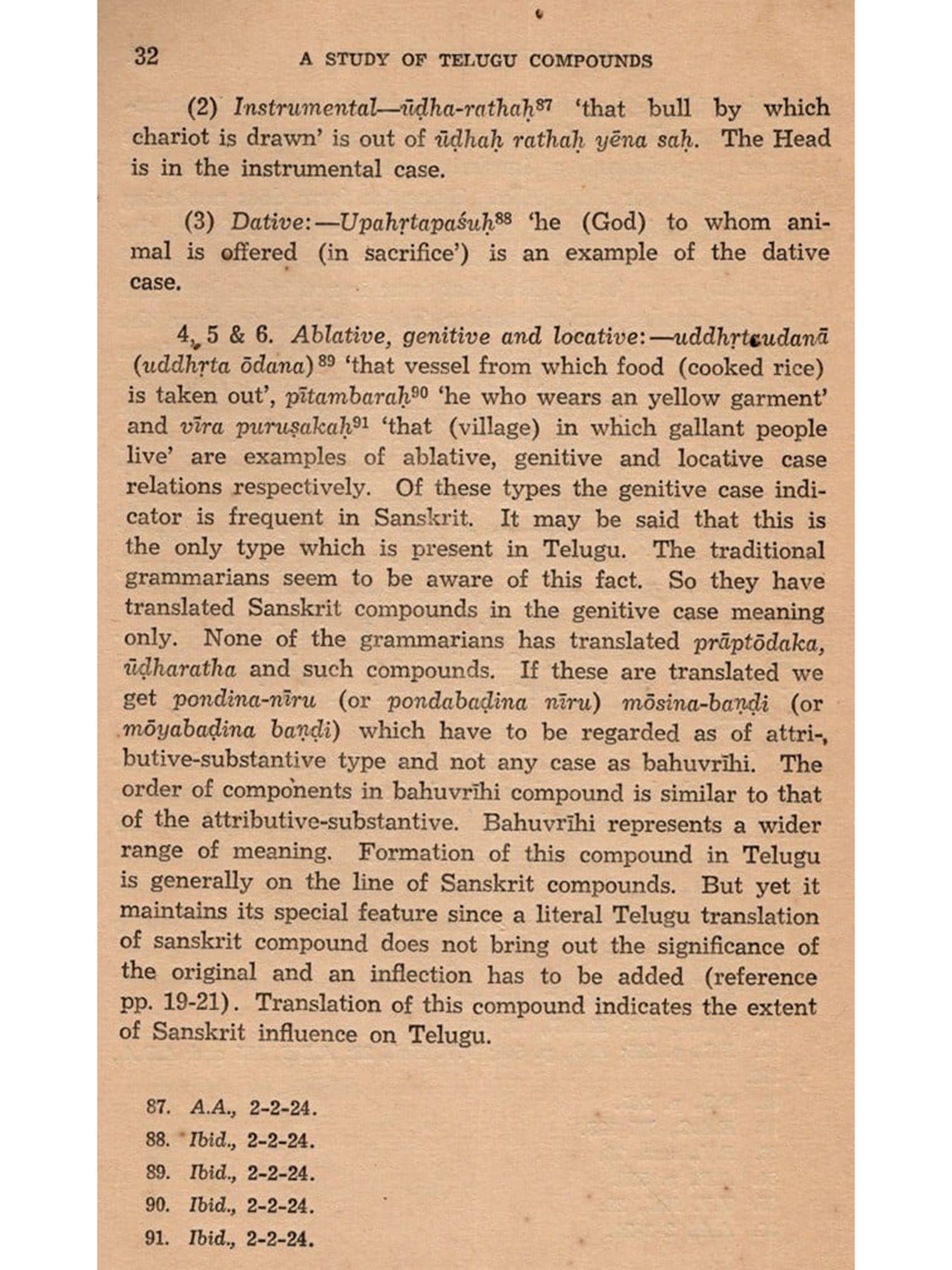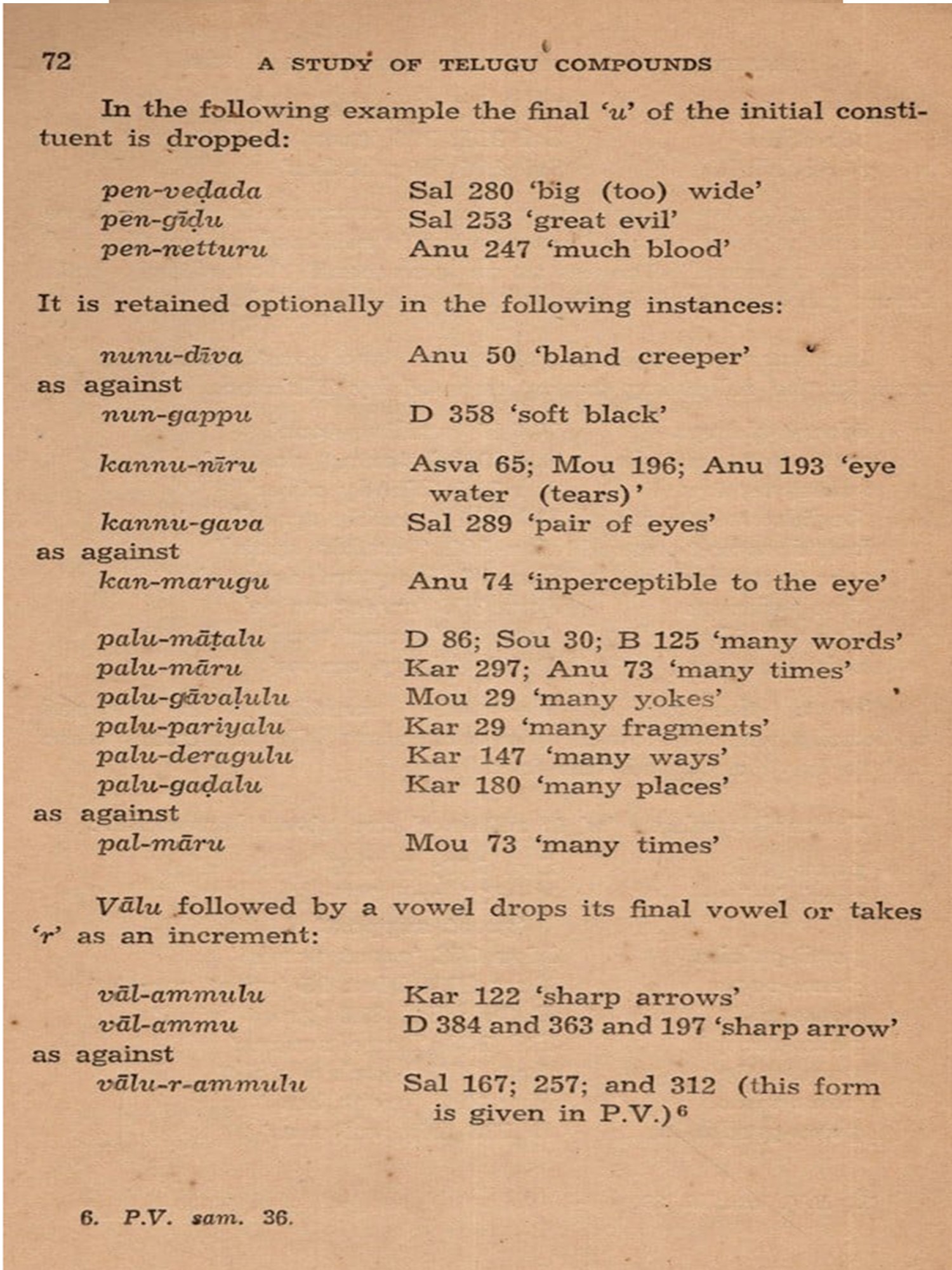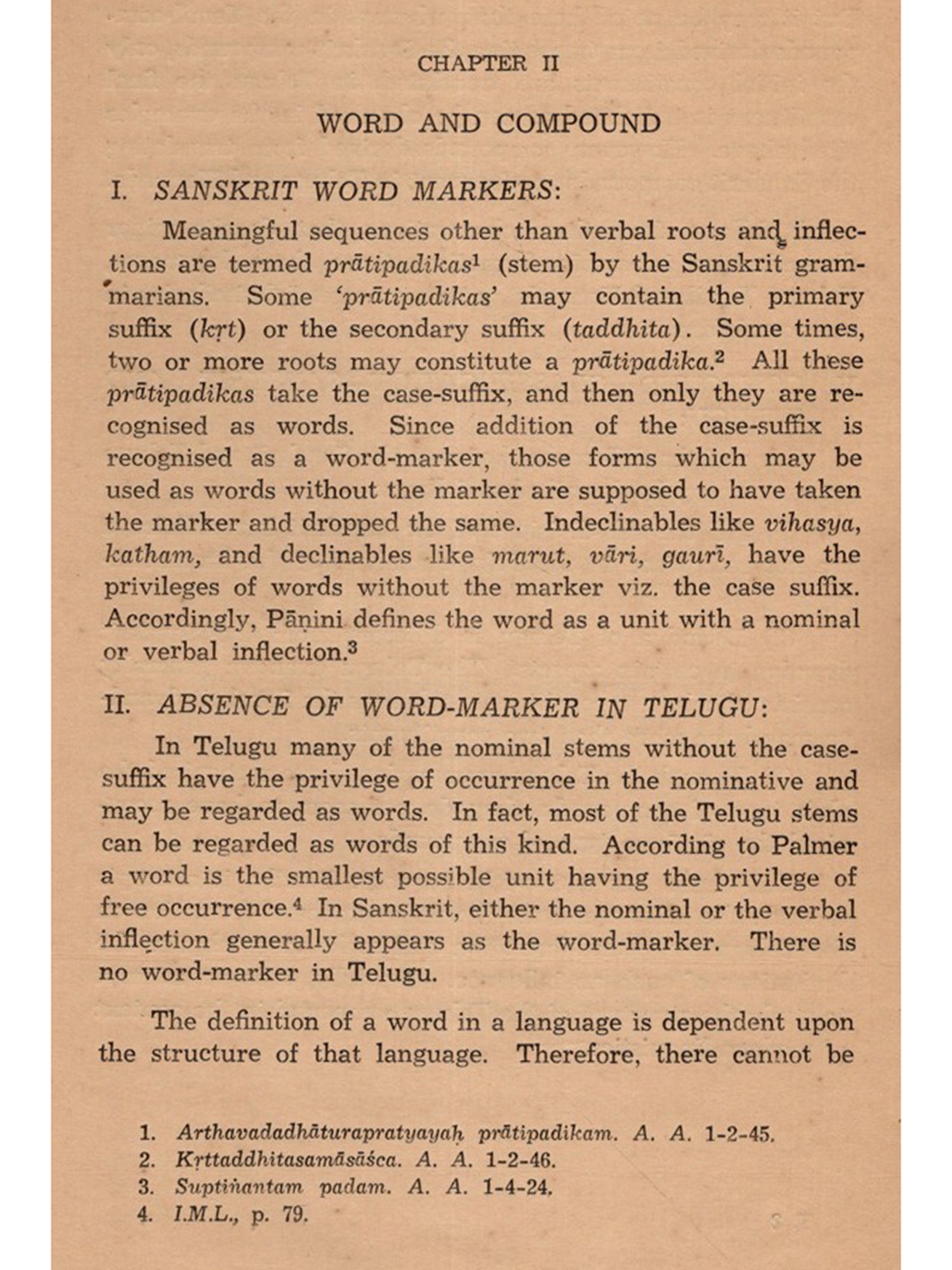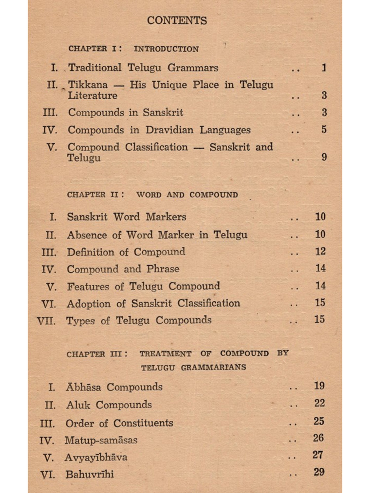 In recent times attempts have been made to study the several Indian Languages including Telugu in the light of modern linguistics. This new approach has considerably influenced the study of the structure of Telugu. However, much work is yet to be done in the field of its morphology. The present work is an attempt in this direction. It tries to examine in the light of the principles of Linguistics the traditional grammatical principles of Telugu, with special reference to the Samasa, and to verify their relevance today. Since this mode of investigation is new, the present attempt might be regarded as a pioneering one. And, that is its justification.