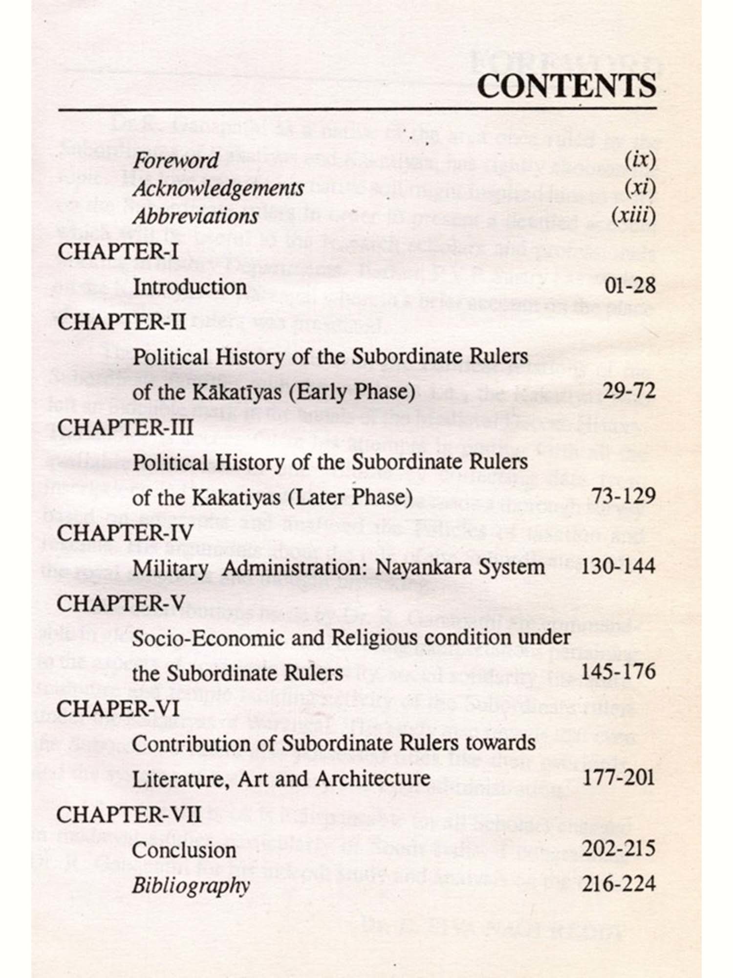 The present work deals with the Political relations of the Subordinate families with the overlords i.e., the Kakatiyas who left an indelible mark in the annals of the Medieval Deccan History. The author is successful in his attempts in putting forth all the available materials in one volume by collecting data from inscriptions and literature of the period, he made a thorough survey based on epigraphs and analysed the Policies of taxation and revenue. His arguments about the rule of the Subordinates under the royal sanctions and thought provoking.