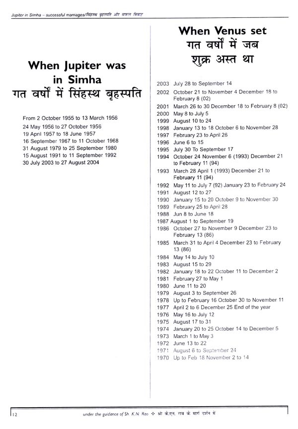 It is neither the first time, nor the last in the year 2003, Hindus, face the astrological prohibition of marriages when Jupiter transits in Simha. This controversy crops up in every twelve years and astrologers support or oppose it then. It is then forgotten, and after the next eleven years always it rears up its head again. Those who support it quote many texts mainly some muhurta texts and show how in dharma shastras there is a clear reiteration of this prohibition forgetting that Smritis are amendable, not Shrutis.