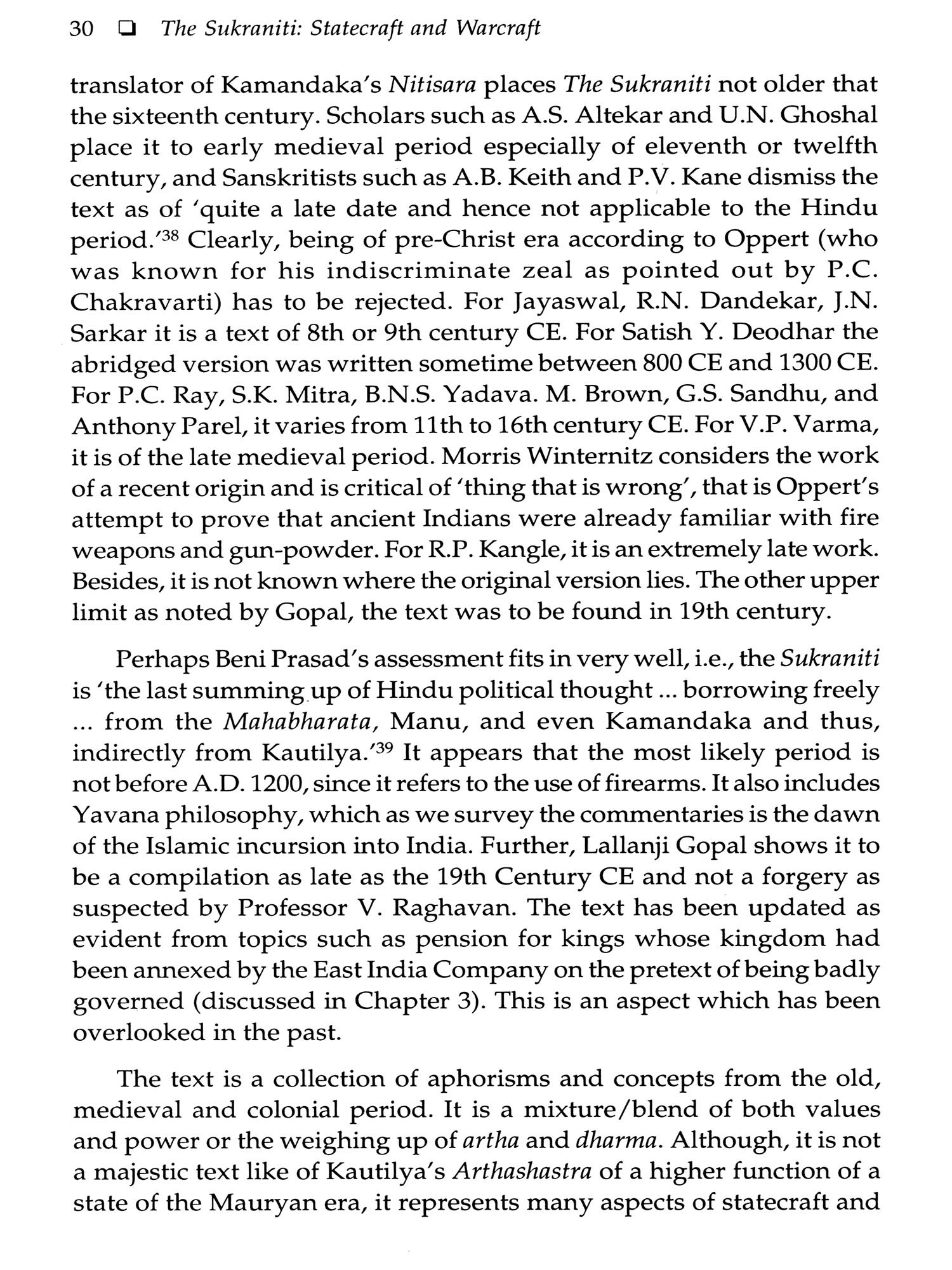 The Sanskrit word for scientific work is 'shastra' (text book), while 'Arthashastra' implies 'science of wealth and power'. The Arthashastra tradition in Sanskrit, along with its various translations over the ages, has carried forward the key essence of statecraft in India. For over 2,000 years, this tradition can be seen in three texts as milestones dealing with statecraft in varying degrees and on grand strategy, warfare, and security-related issues, military appreciation, diplomacy, intelligence studies, leadership, management, and morals, under the term in Sanskrit as 'artha'. There is another related and synonymous term, 'niti'. Niti is defined as pragmatics, politics, or statecraft. The Sanskrit Dictionary of Law and Statecraft defines niti as law, policy, governance, and Nitishastra to mean treatise on law or political science. In other words, 'the books relating to the regulations of the state are generally known by the technical term of Nitisastras.... Among the extant publications, we may mention the three monumental works in this tradition, viz. the Arthasastra of Kautilya, the Kamandaki, and the Sukranitisara. In this tradition of statecraft and politics, 'the Nitisara of Sukra is a well-known manual of Arthashastra's type.'5 Etymologically, in the initial stages, the term was artha and danda. Later, as Jayaswal notes, the term niti (policy or principle) and nyaya (justice) superseded the old words artha and danda. For example, Kamandaka (also spelt as Kamandaki) calls his metrical treaties a Niti-sara and the text of Sukra is known as Sukranitisara."