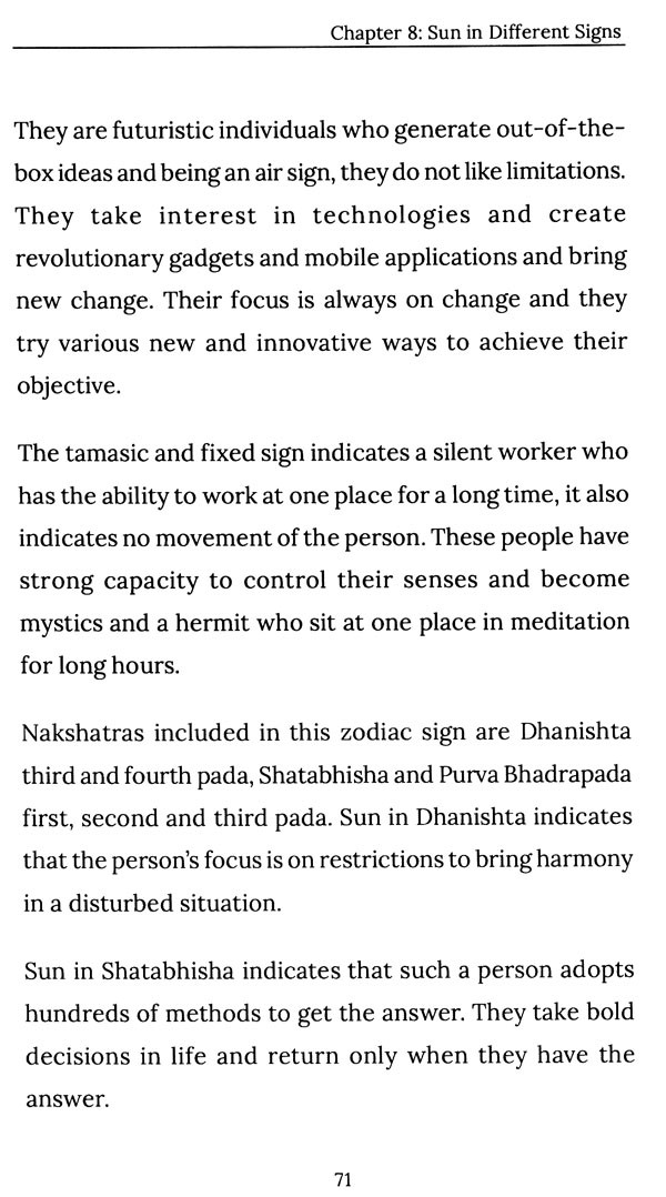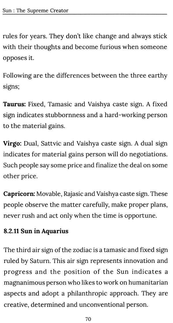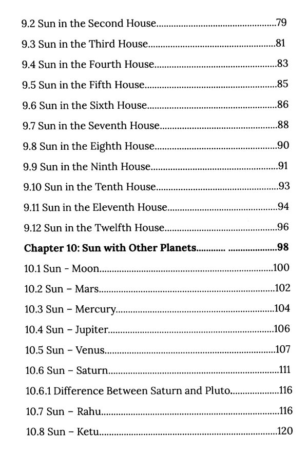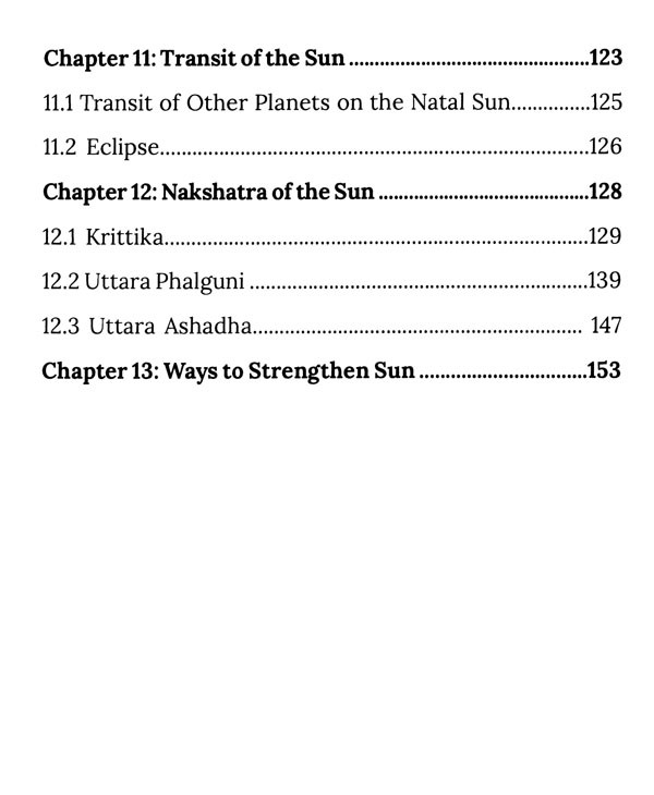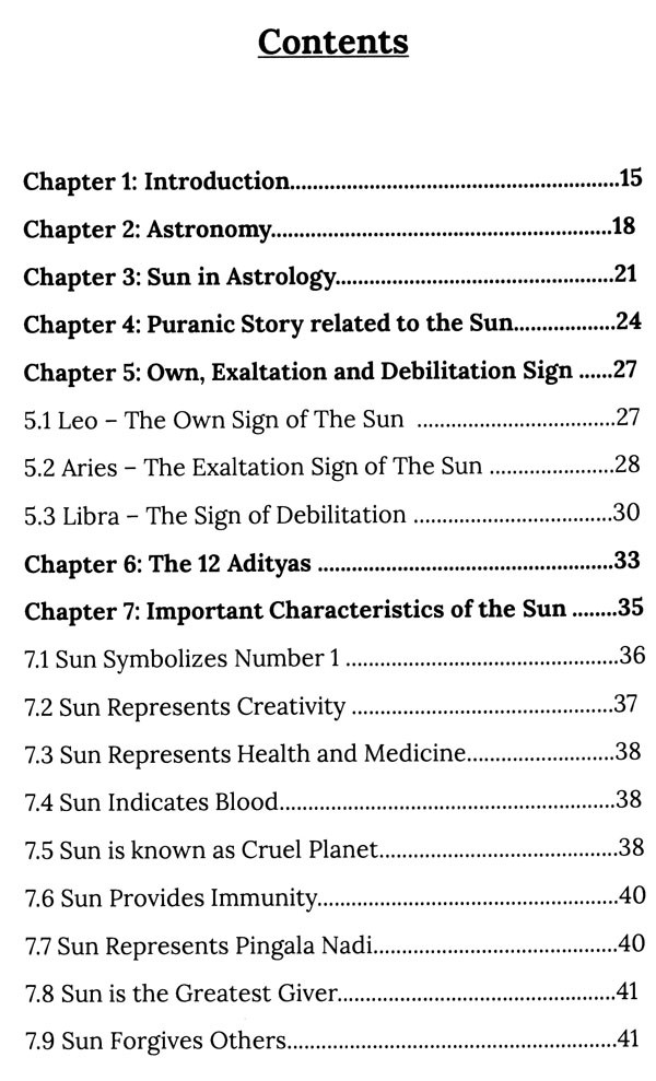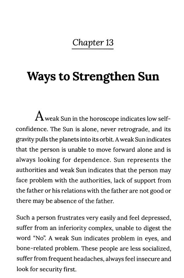 When the Sun rises in the morning, activities begin in the world. The Sun leads the activities of the entire day. During the after-noon it is very bright and there are more activities in the world and people run around to fulfill their responsibilities. As the Sun goes below the horizon the activities start slowing down and at night people are in their beds. Sun means activity, it is the Sun who controls everything. This book discusses various astrological aspects of the Sun who is "The Supreme Creator". When a person develops the quality of giving selflessly and gives up ego, he develops the quality of the Sun within himself. Without the positive qualities of the Sun, a person is unable to face the negativity of life and soon gets disheartened in adverse circumstances. This book discusses why the ancient sages described Leo as their own zodiac sign, Aries as the exalted sign and Libra as the debili-tated sign of the Sun. The legend involving Sun and his wife has a meaning and is discussed here. It further discusses the import-ant characteristics of the Sun, its relationship with other planets, transits and ways to strengthen it.