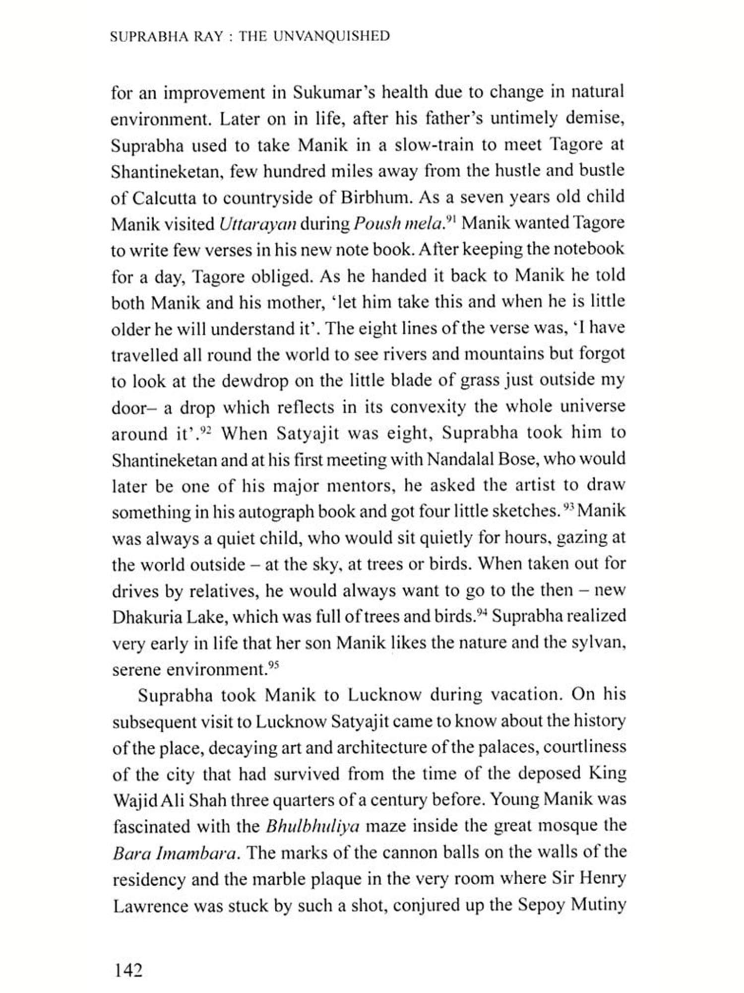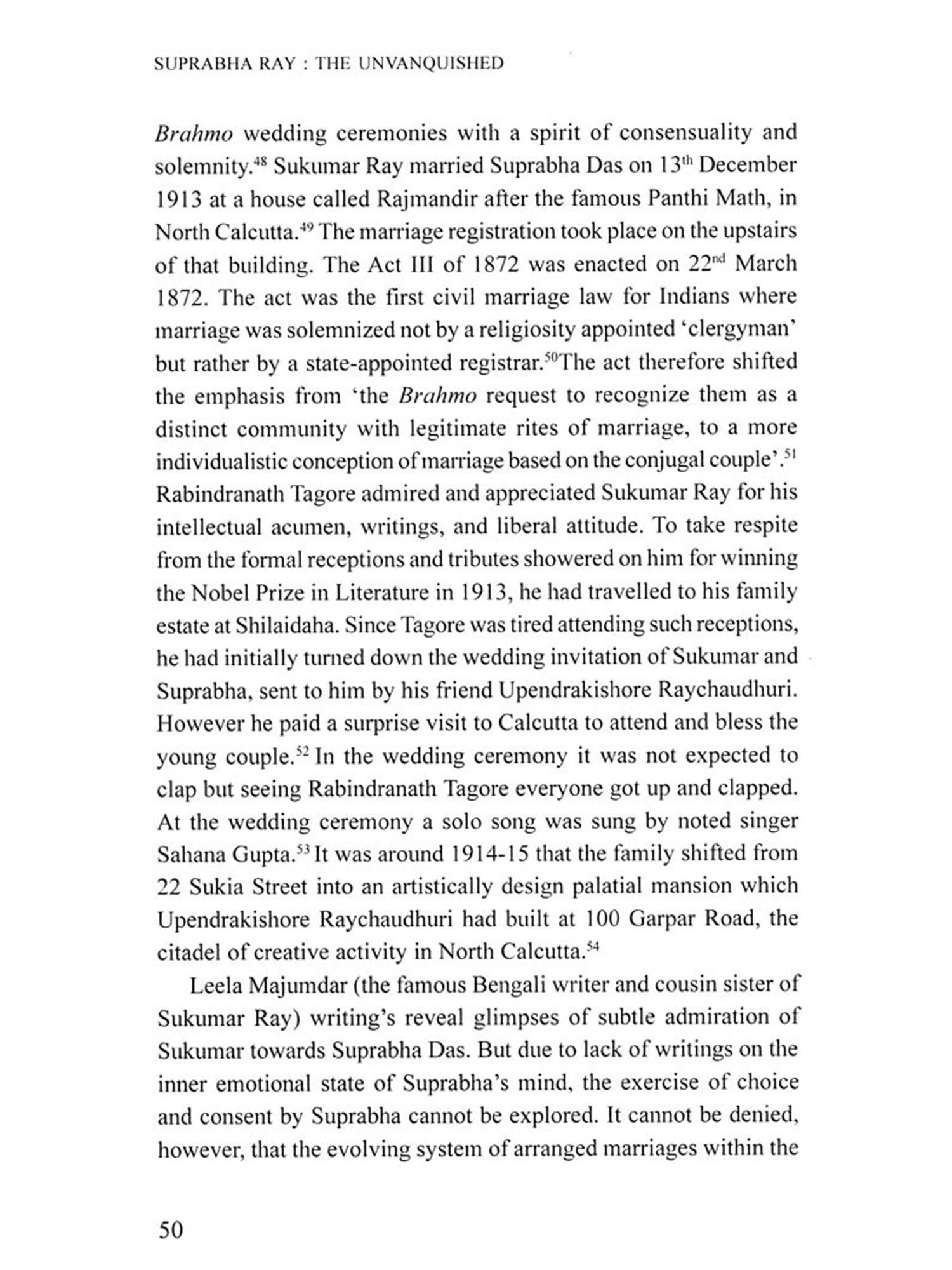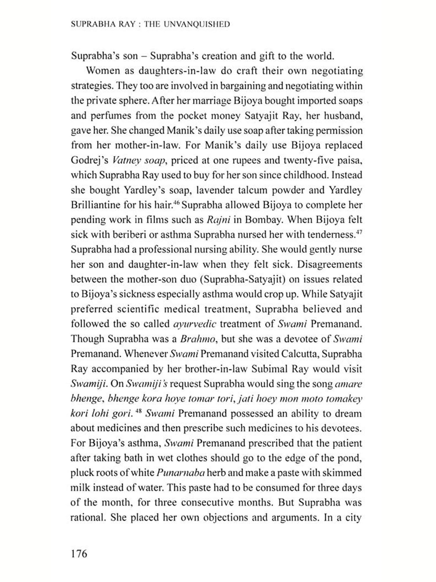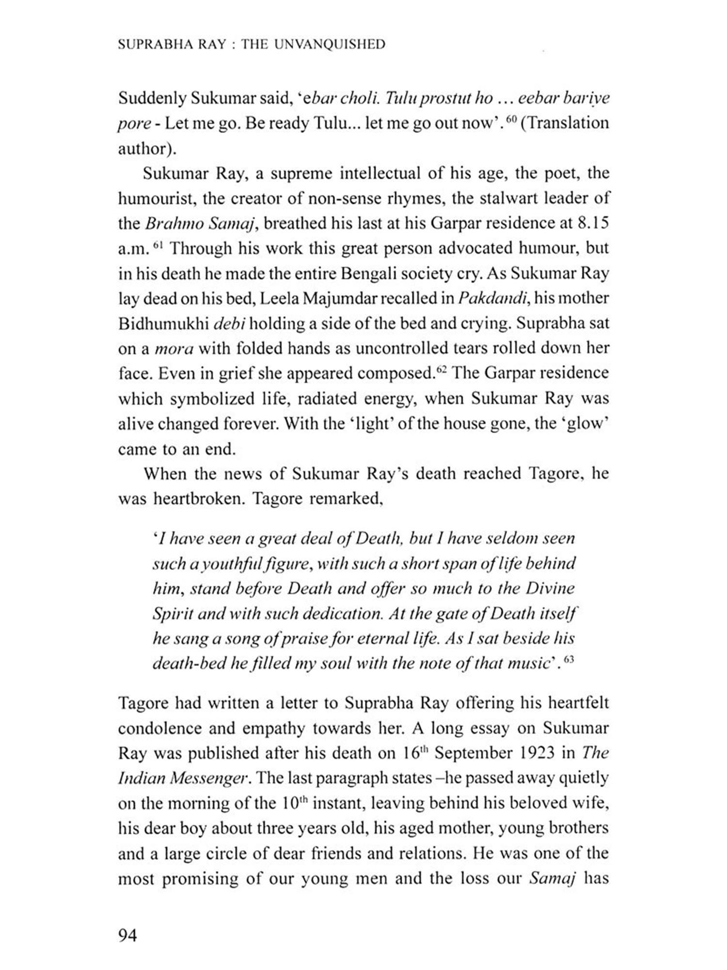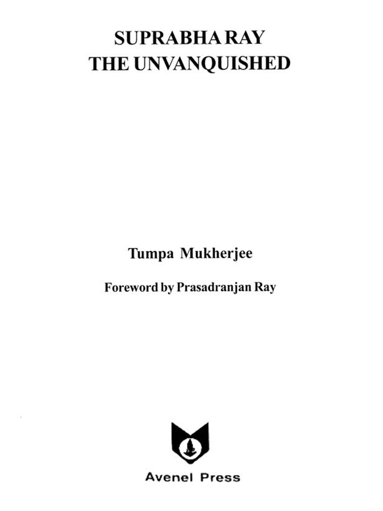 The School of Women's Studies, Jadavpur University, Kolkata, is a citadel where research and academic discussions on women in the late nineteenth and the twentieth century are held regularly. After completing my doctoral studies from the School of Women's Studies, Jadavpur University, I preferred a scholarly engagement on Suprabha Ray, thus concentrated upon exploring the life and times of Suprabha Ray. The title of the book Suprabha Ray. The Unvanquished has been adapted from Satyajit Ray's film Aparajito.