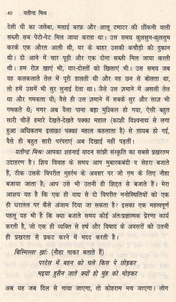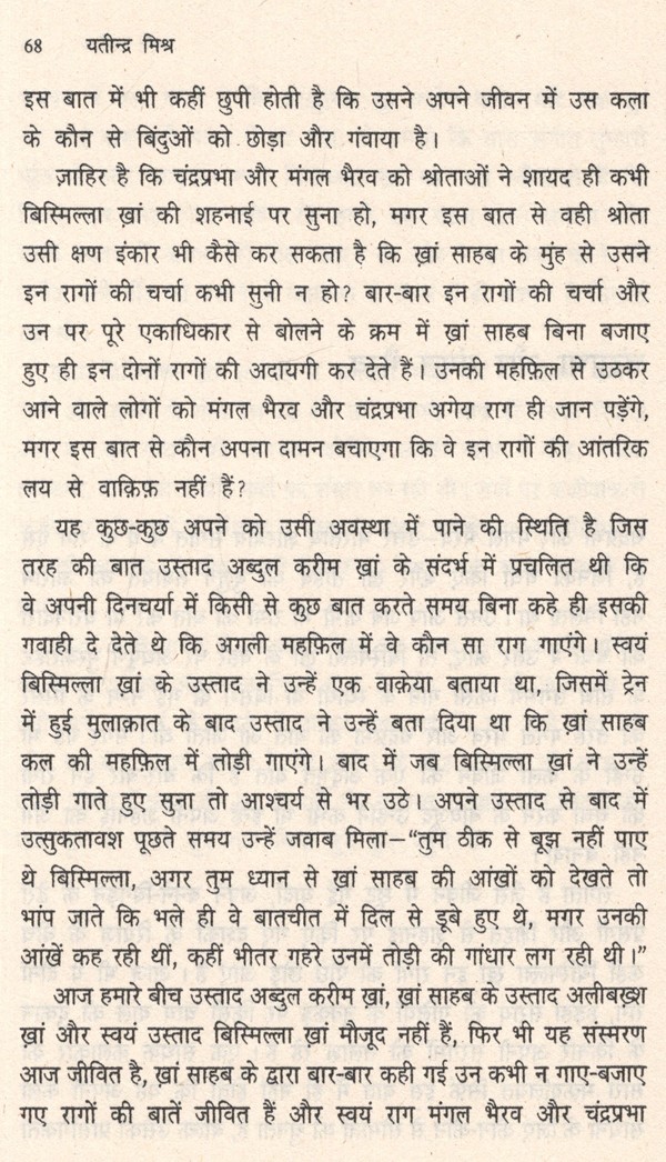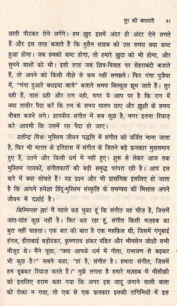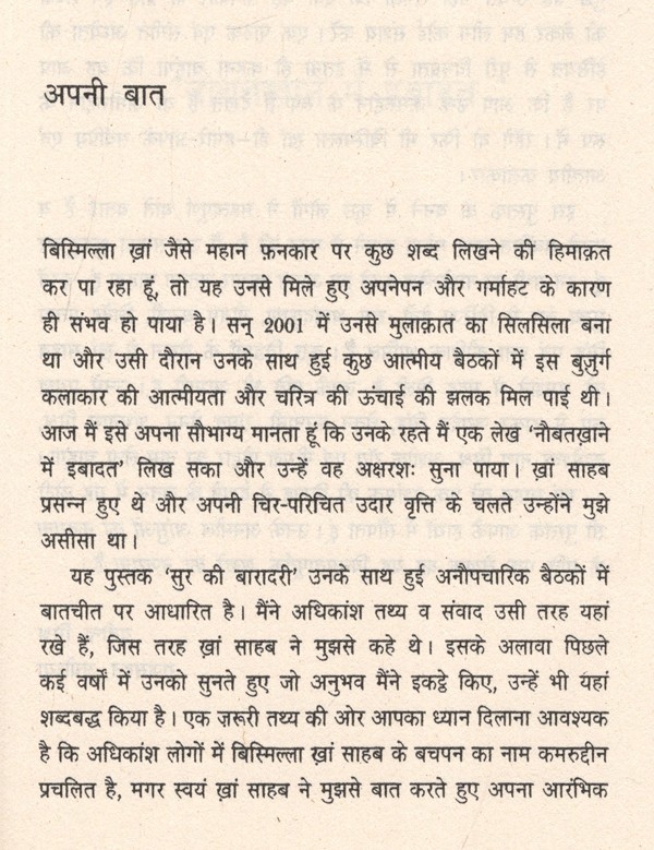 यतीन्द्र मिश्र द्वारा लिखी गई इस किताब के ज़रिए हम खां साहब जैसे सहृदय उस्ताद के किरदार को जानने के साथ-साथ उनमें छिपे उस बेहतरीन इंसान को भी क़रीब से देख-सुन पाते हैं, जिसकी ज़िंदगी के लगभग आठ दशक दुनिया को सुरों से भिगोने में सार्थक हुए। खां साहब से संबंधित ढेरों दिलचस्प क़िस्से-क़हक़हों से सजी यह शब्दों की बारादरी एक महान फ़नकार को अद्भुत तन्मयता के साथ उजागर करती है। ख़ां साहब के सुरीले सफ़र का हमराही बनने पर हम पाते हैं कि उनको जानना एक साथ गंगा के पानी में वुजू करने और अज़ान की पुकार में स्वयं को भुला देने सरीखा है।