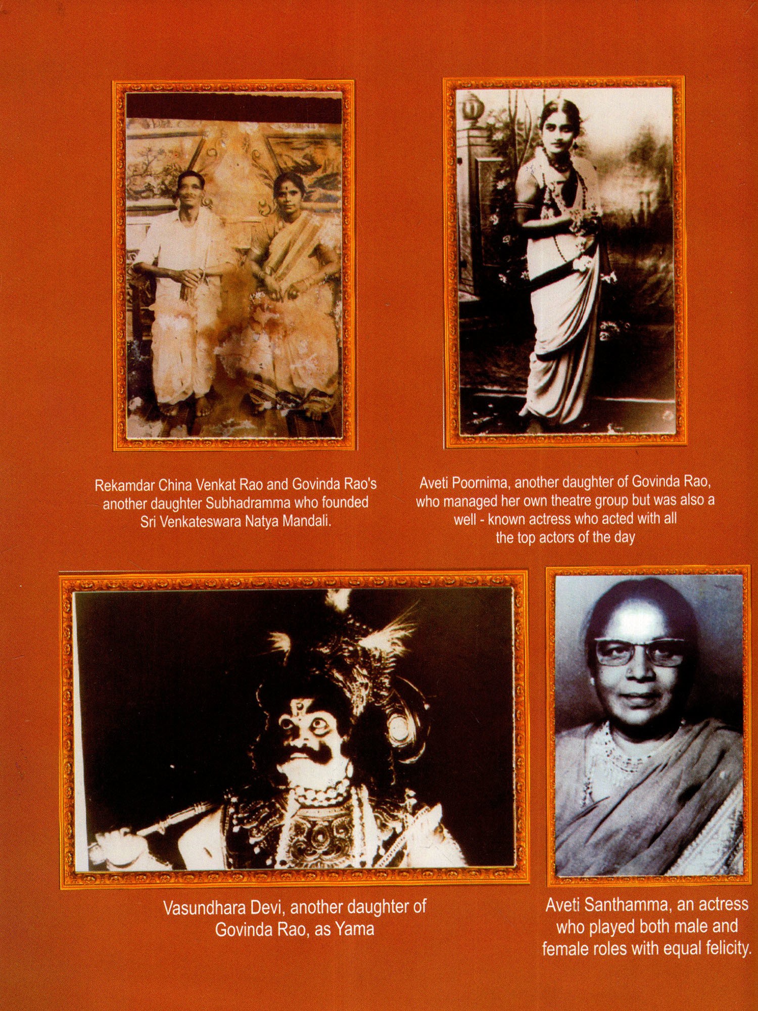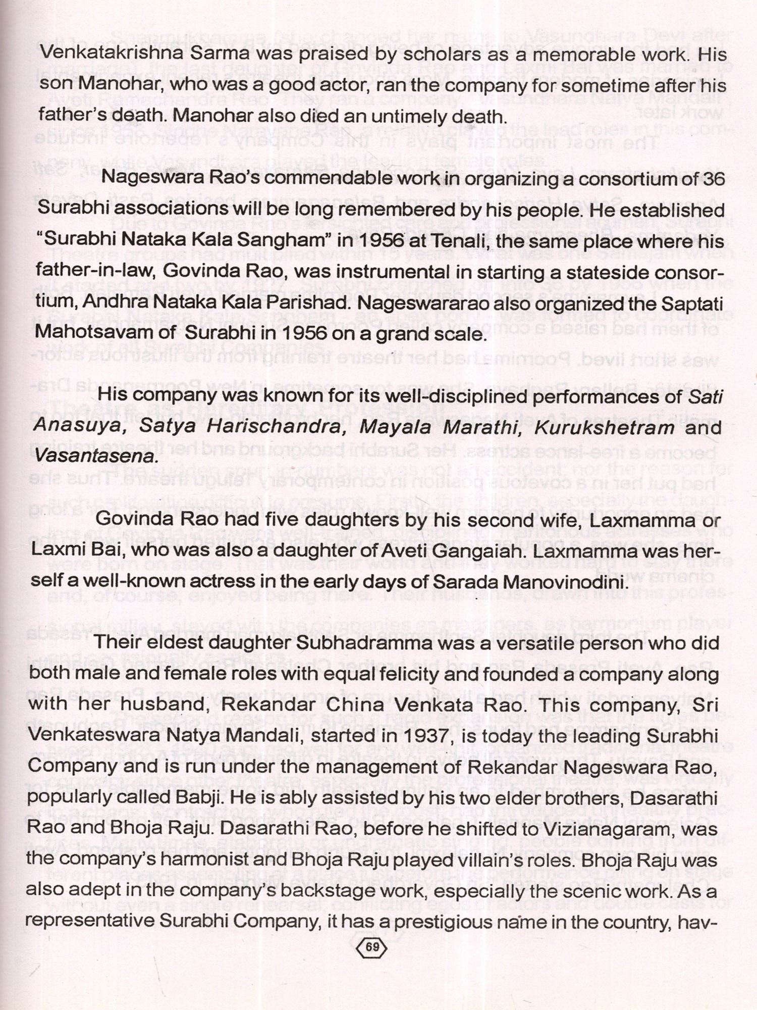 "Surabhi", in its 120-years old history, has become a by-word for a type of traditional theatre groomed on the Parsi Theatre model, adding its own imprint of the traditional musical theatre of Andhra. Its glorious history itself serves as a mirror to the ebb and tide of Telugu Theatre. Started as a single unit by Vanrasa Govinda Rao, it branched off into nearly thirty theatre groups, all belonging to the large Surabhi family consisting of four major family-sects (with different family - "names") Vanarasa, Aveti, Rekandar and Sindhe, finally to end up with only five "companies" today. They have survived for 120 years because of this strong "family" togetherness and also because they chose "theatre" as their profession.