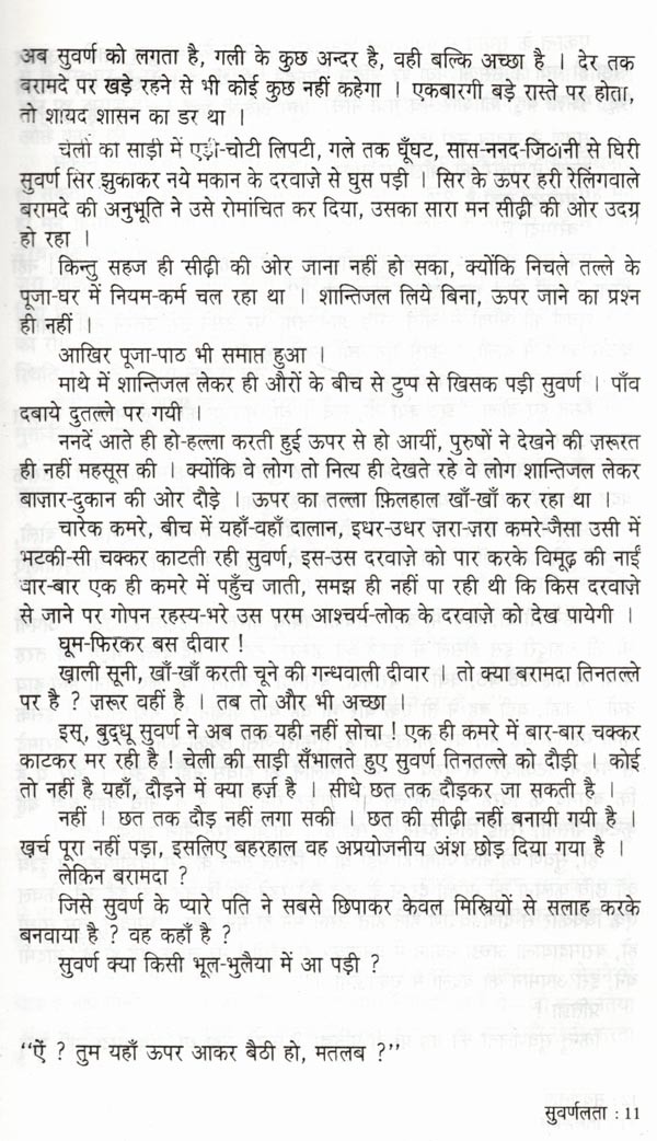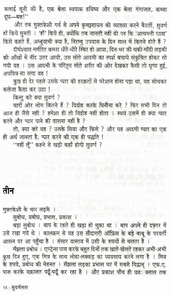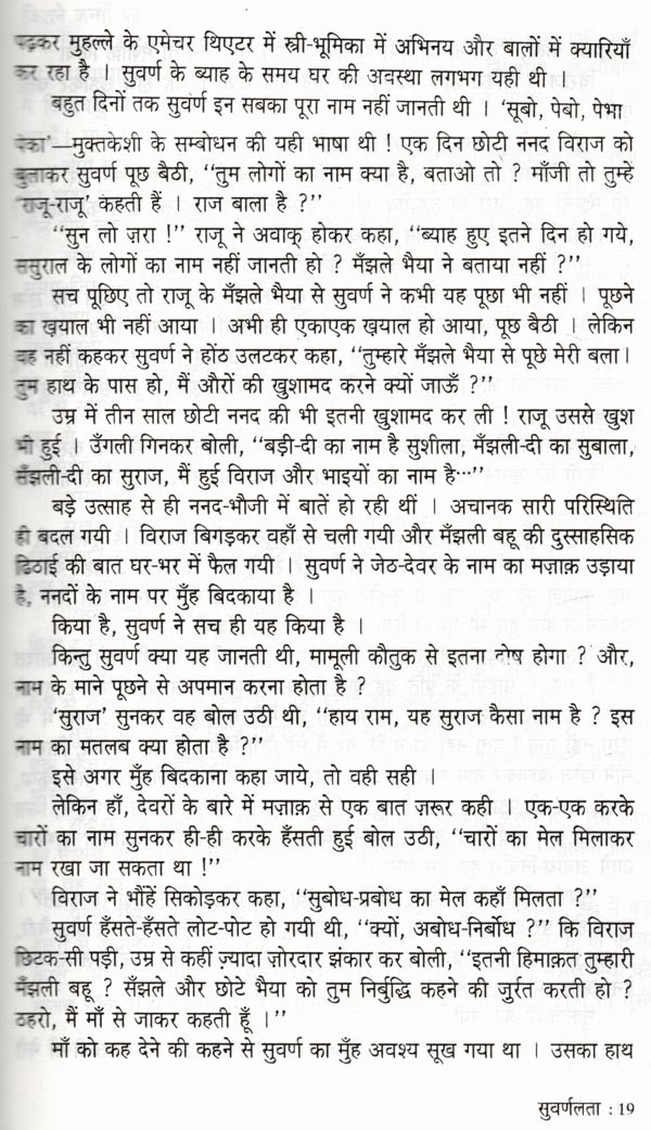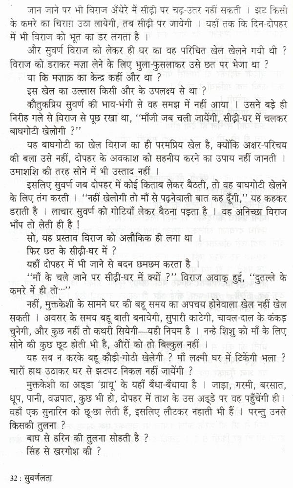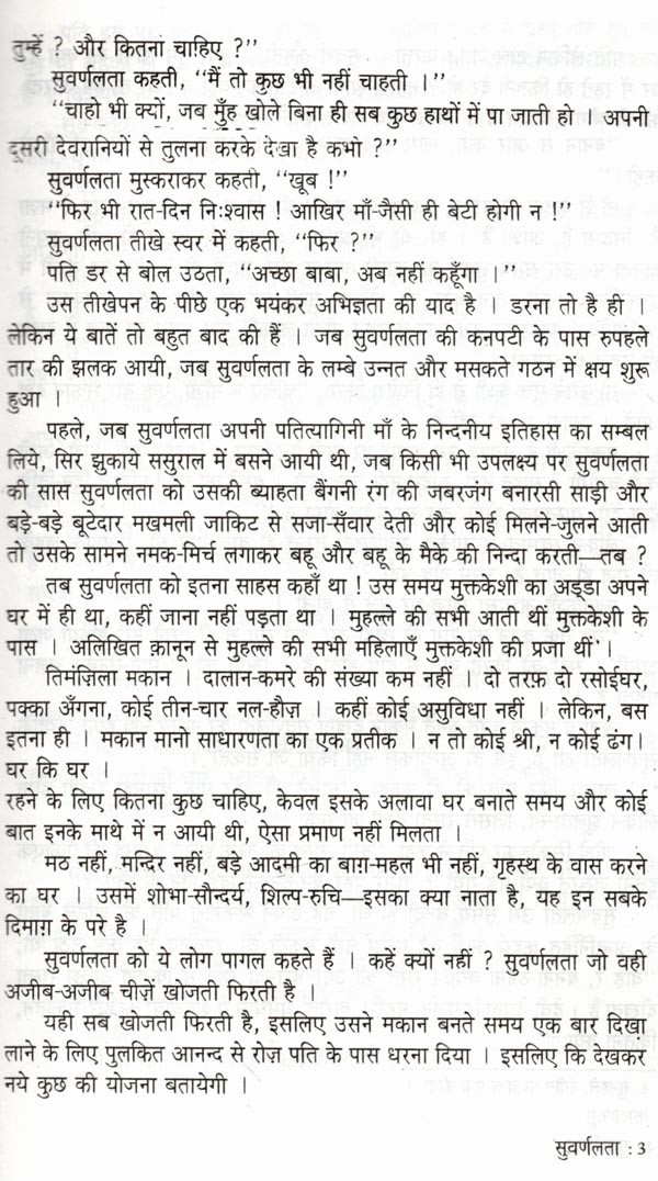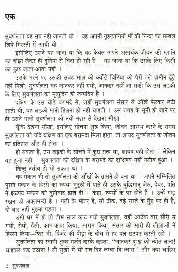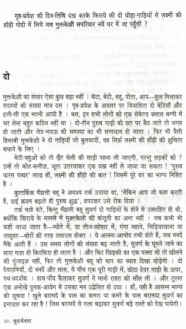 सुवर्णलता 'ज्ञानपीठ पुरस्कार' से सम्मानित श्रीमती आशापूर्णा देवी की लेखनी से सृजित यह उपन्यास सुवर्णलता अपनी कथा-वस्तु और शैली-शिल्प में इतना अद्भुत है कि एक बार पढ़ना प्रारम्भ करने के बाद इसे छोड़ पाना कठिन है जब तक सारा उपन्यास समाप्त नहीं कर लिया जाता, बल्कि समाप्त करने के बाद भी उपन्यास के पात्र सुवर्णलता और सुवर्णलता के जीवन तथा परिवेश से सम्बद्ध पात्र-मन पर छाये रहते हैं, क्योंकि ये सब इतने जीते-जागते चरित्र हैं, इनके कार्यकलाप, मनोभाव, रहन-सहन, बातचीत सब-कुछ इतना सहज, स्वाभाविक है और मानव-मन के घात-प्रतिघात इतने मनोवैज्ञानिक हैं कि परत-दर-परत रहस्य खुलते चले जाते हैं। निस्सन्देह इस उपन्यास में लेखिका का स्तर एक बहुआयाशी विद्रोहिणी का स्वर है। सुवर्णलता आशापूर्णा के उन तीन उपन्यासों के मध्य की कड़ी है जिनके माध्यम से भारतीय समाज की नारी के एक शताब्दी का इतिहास अपने विकासक्रम में प्रस्तुत हुआ है। श्रृंखला की पहली कड़ी है प्रथम प्रतिश्रुति जिसका हिन्दी में एक लघु नाट्य रूपान्तर भारतीय ज्ञानपीठ से प्रकाशित हो चुका है; उत्तरवर्ती तीसरी कड़ी बकुलकथा भी भारतीय ज्ञानपीठ द्वारा प्रकाशित है। शताब्दी के तीसरे चरण का परिवेश बकुलकथा में प्रस्तुत हुआ है। सम्भव नहीं कि आप यह उपन्यास सुवर्णलता पढ़ें और बकुलकथा पढ़ने के लिए आपका मन आग्रही न हो।