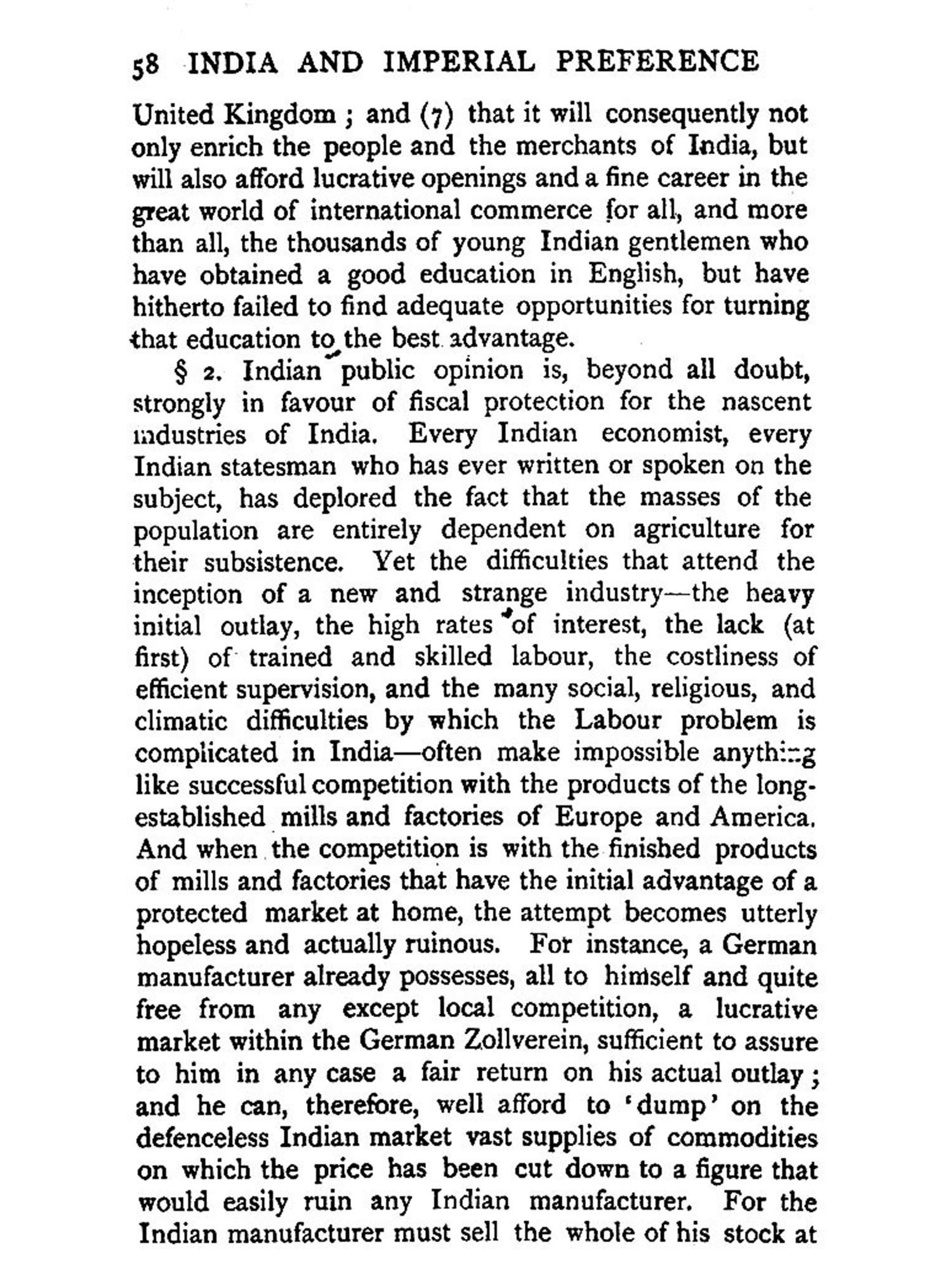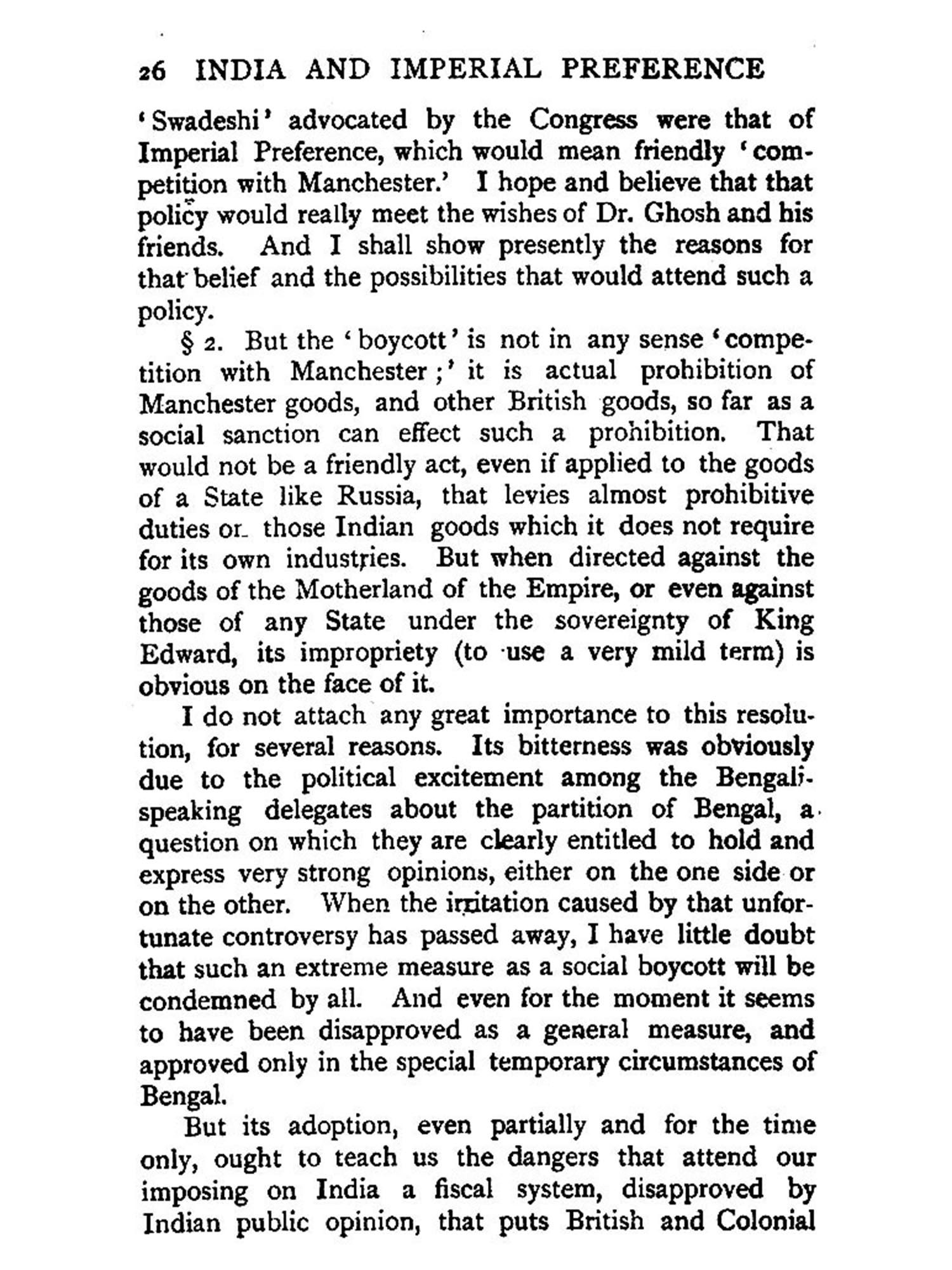At this moment, the popular aspirations of India, in matters commercial and industrial, are summed up in the one word 'Swadeshi ''My own country's products for me.' The existing fiscal policy, imposed on India by our British prejudices, is universally believed to be maintained solely in the interests of British manufacturers-though, as I shall show, we are being steadily ousted from the Indian markets by our Protectionist rivals. And the extreme politicians of the Indian National Congress already, not unnaturally, gratify the national wishes by preaching a social boycott of British, as well as foreign, goods; and they frankly declare that, if they were able to do so, they would impose protective, and even prohibitive, duties on all imports alike.