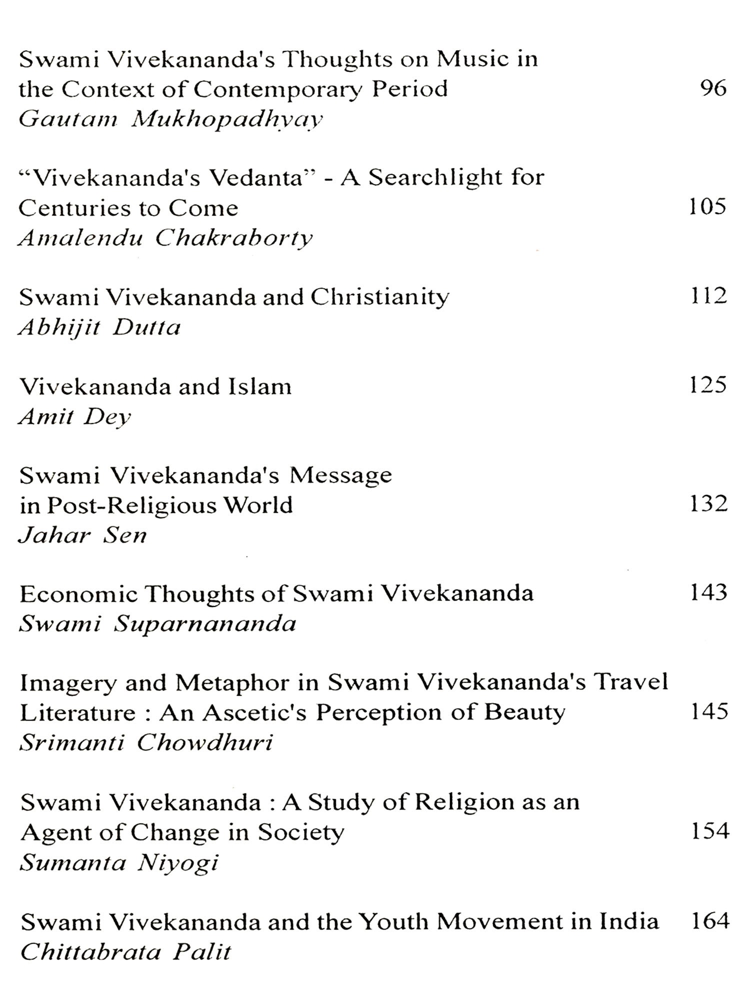 Goutam Mukhopadhyay takes a different route to assess Swamiji's thoughts on music which should be interesting. Amalendu Chakraborty pays his tribute to Swamiji by recalling his ideas on Vedanta. The emphasis should have been on practical vedanta which was nothing else but universal humanism and a call to serve mankind as can be found in his Chicago lecture. The next two articles by Abhijit Dutta and Amit Dey are on "Vivekananda and Christianity and "Vivekananda and Islam". They have done justice to their topics. Jahar Sen follows next with an assessment of Swamiji's message in a post-religious world. It is for the readers to judge whether the world has really become post-religious or not. Swami Suparnananda, a practising economist legitimately writes on the economic thoughts of Swami Vivekananda mainly his thoughts on mass uplift. Srimanti Chowdhury highlights the literary assests of Vivekananda's travel literature particularly his perception of beauty. Sumanta Niyogi takes up the issue of religion as an agent of change as reflected in Swamiji's life and work. Similarly Chittabrata Palit takes up "Swami Vivekananda's impact on the Youth Movement" - a rallying point for the youth to-day.