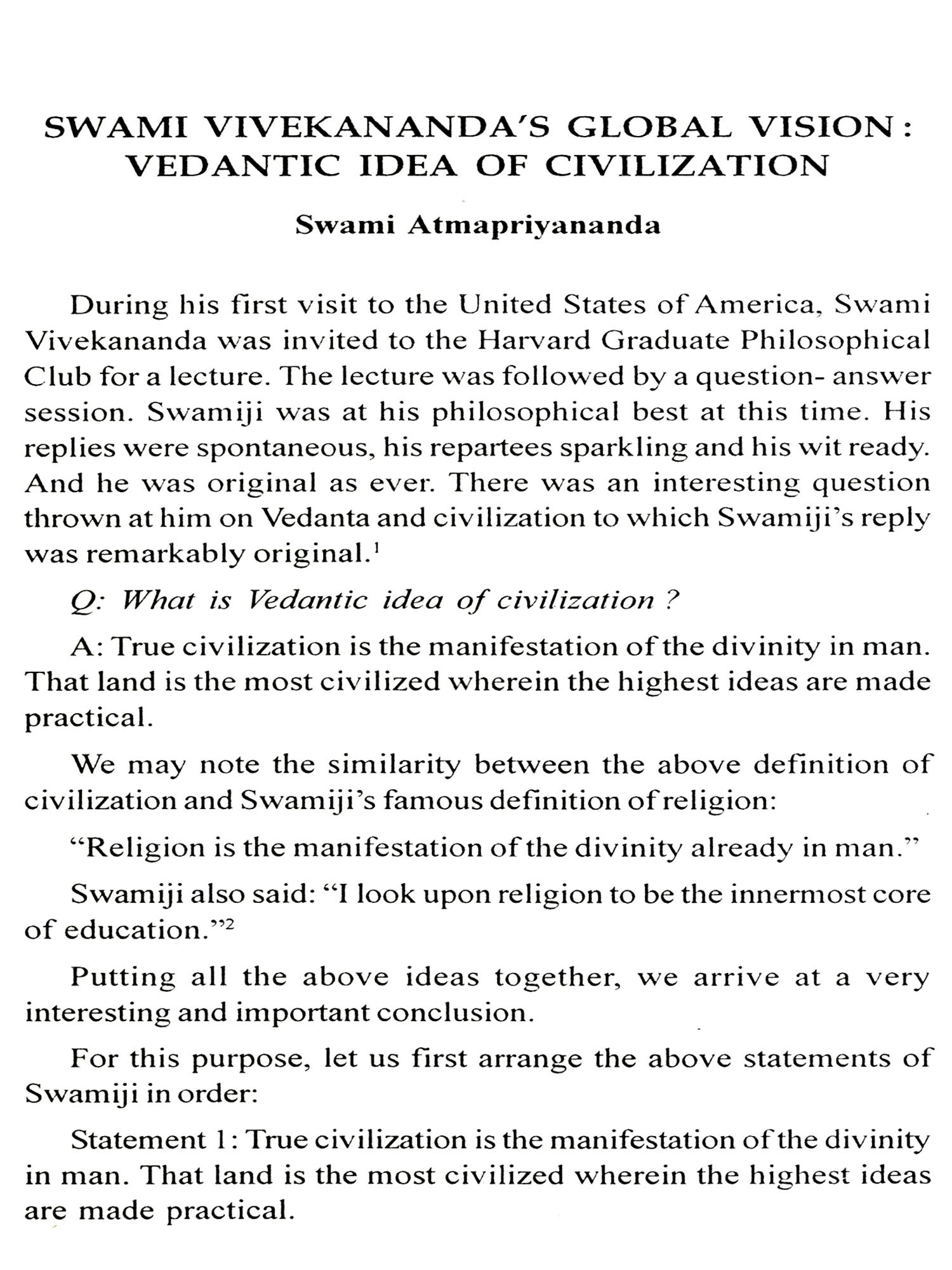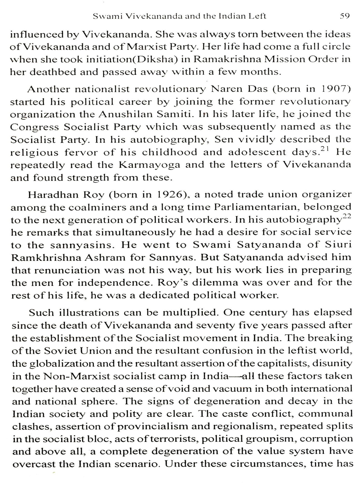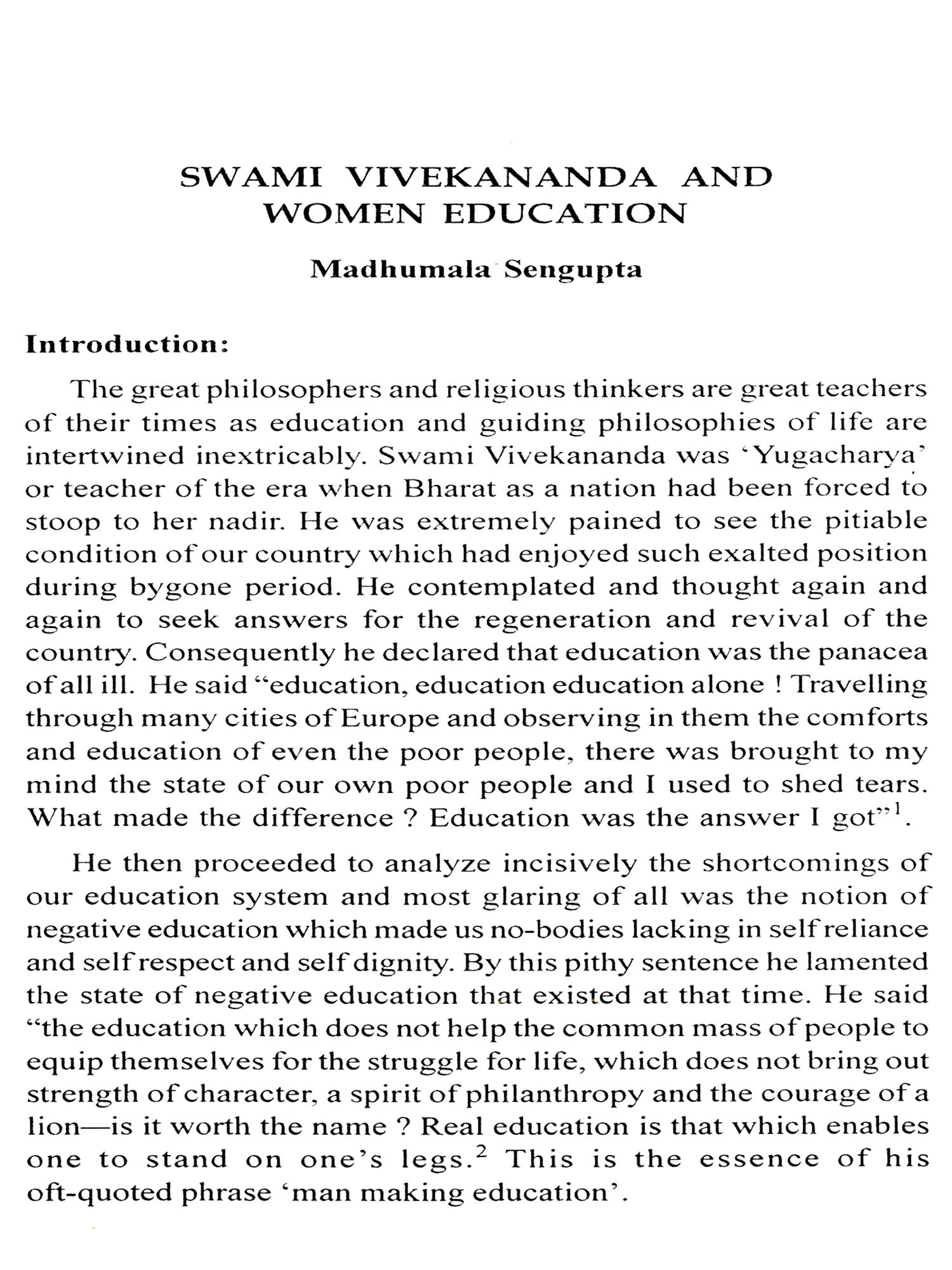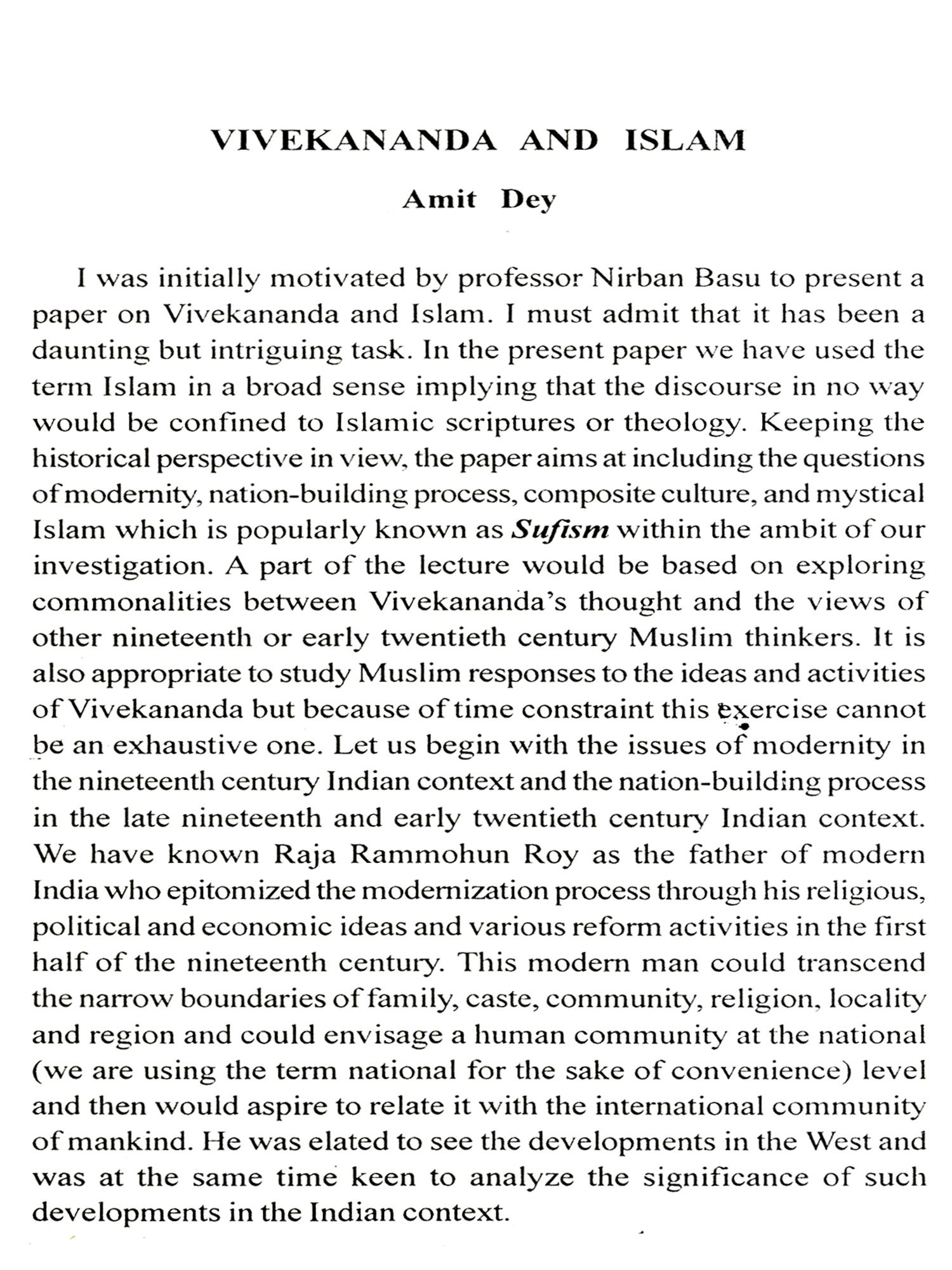 We are fortunate to have Swami Atmapriyananda's keynote address on Swami Vevekananda's global vision. He is noted as an expopent of Vivekananda's Vedantic idea of civilization. The book begins with this learned article. Then follows Sunetra Mitra's article on "Indian society in the eyes of the Paribrajak". The readers will like to supplement it by Shankariprasad Basu's Vivekananda and Samakalin Bharatbarsha. Madhumala Sengupta deals with Vivekananda's idea on "Women's Education". As a Professor of Education in Calcutta University, she has been the fittest person on the subject. Arunima Roy Chowdhury comes out next on "Complete Empowerment of Women" as seen by Vivekananda. This is a supplementary to the previous article by Palas Mondal who tries to assess Vivekananda's link with Bengal Revolutionaries. Sister Nivedita was the main link but Vivekananda's stress on physical culture corroborates it. Then comes the unique article by Sumit Mukerji on some prophetic utterances by Swami Vivekananda with an attempt to prove their prophetic nature. Nirban Basu tries to stress Vivekananda's link with the Indian Left. This is generally trumped up by the Left historians through the possible co-sharing of ideas of Vivekananda by his brother Bhupendranath. The readers will judge how far this is tenable or tenuous. This is hammered further by Pratyaya Dutta who discovers Socialism in Swamiji's economic ideas. It is well known that Swamiji had more social ideas than economic as embodied in the Ramakrishna order.