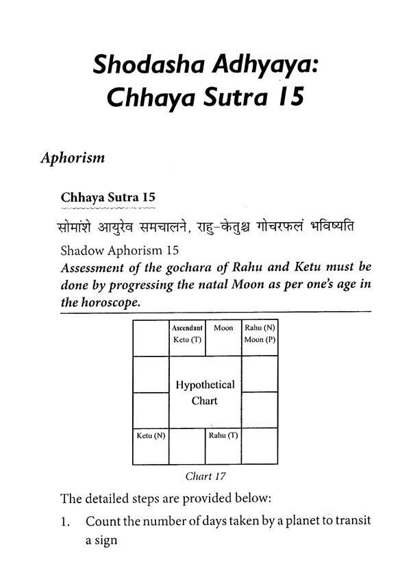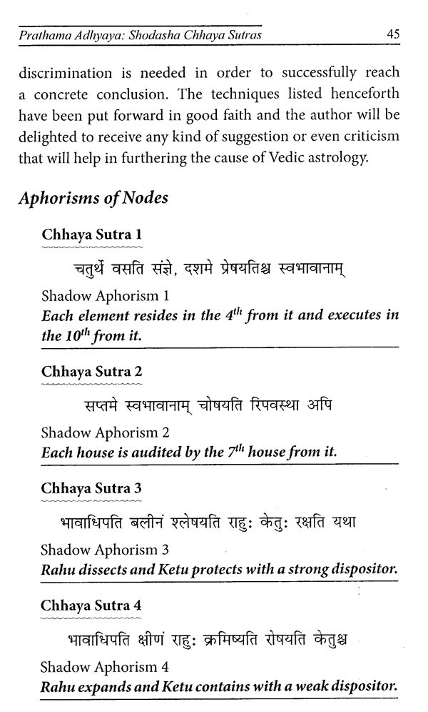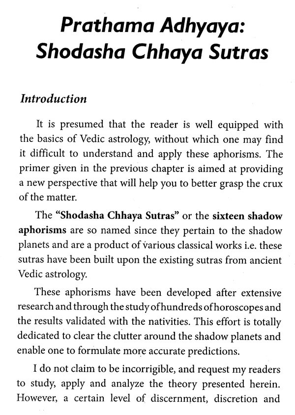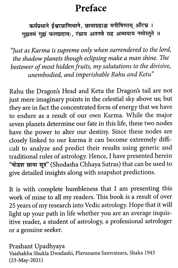 The author has developed "Shodasha Chhaya Sutras" or sixteen shadowy aphorisms for the nodal planets and presented them in a simple and lucid manner. These aphorisms can be applied directly to any horoscope and valid results can be obtained quite easily and quickly. However, it must be noted that this is not a shortcut technique and requires basic understanding of Vedic astrology.